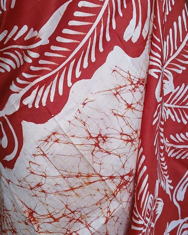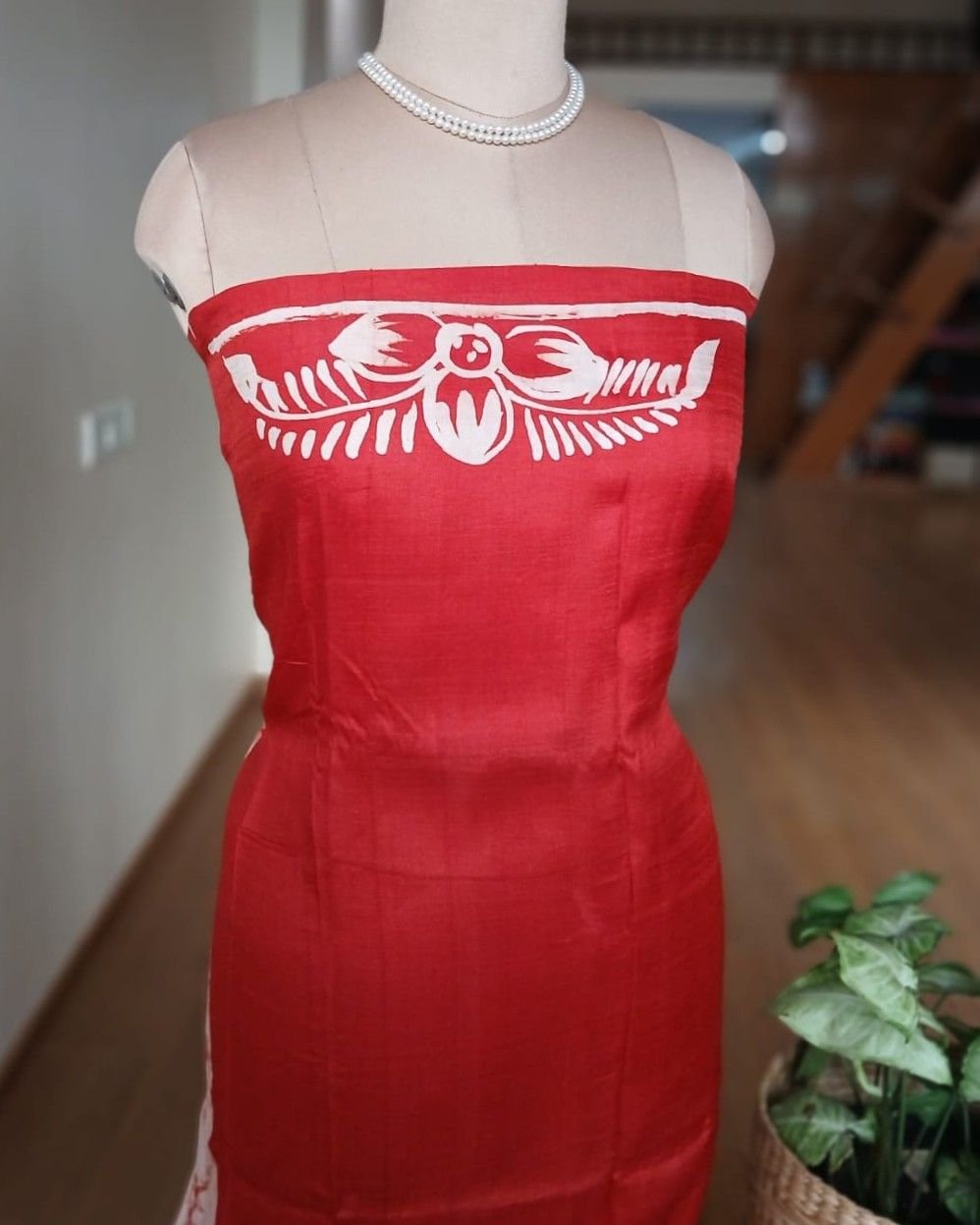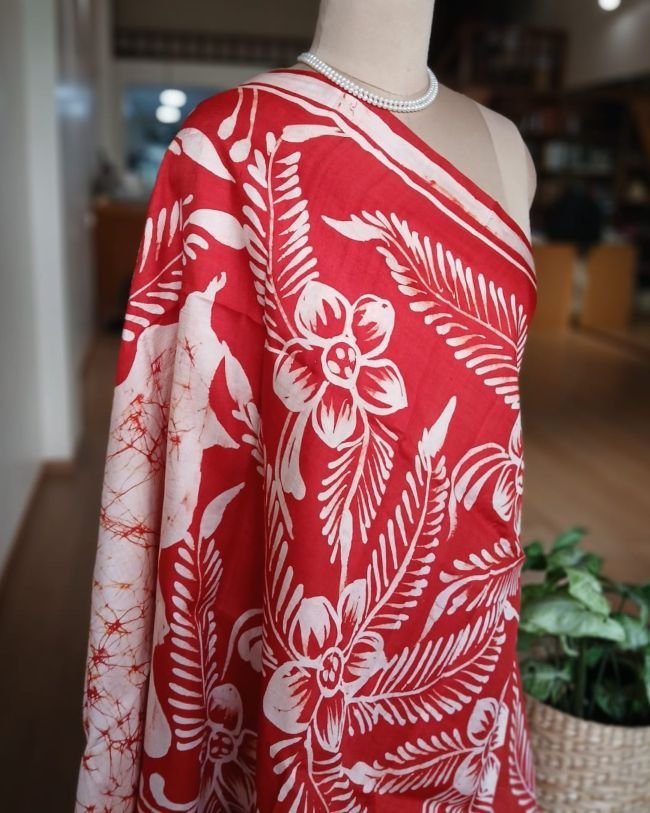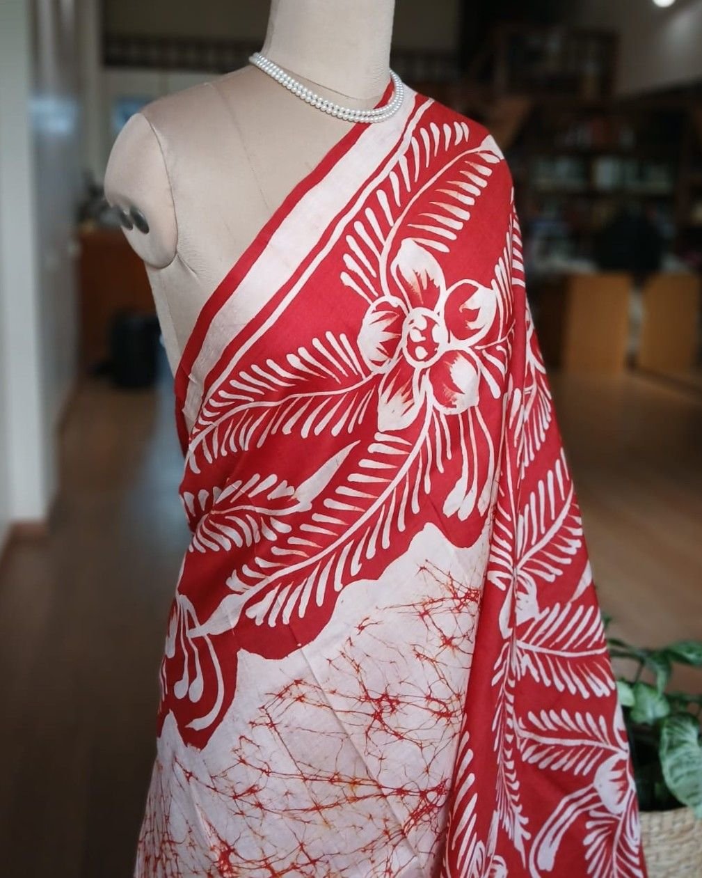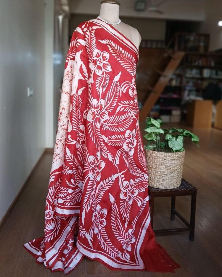 Silk Batik saree from Murshidabad West Bengal using wax resist technique, with contrast borders and pallu.