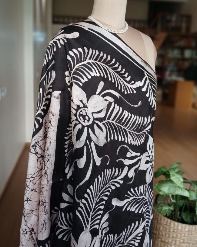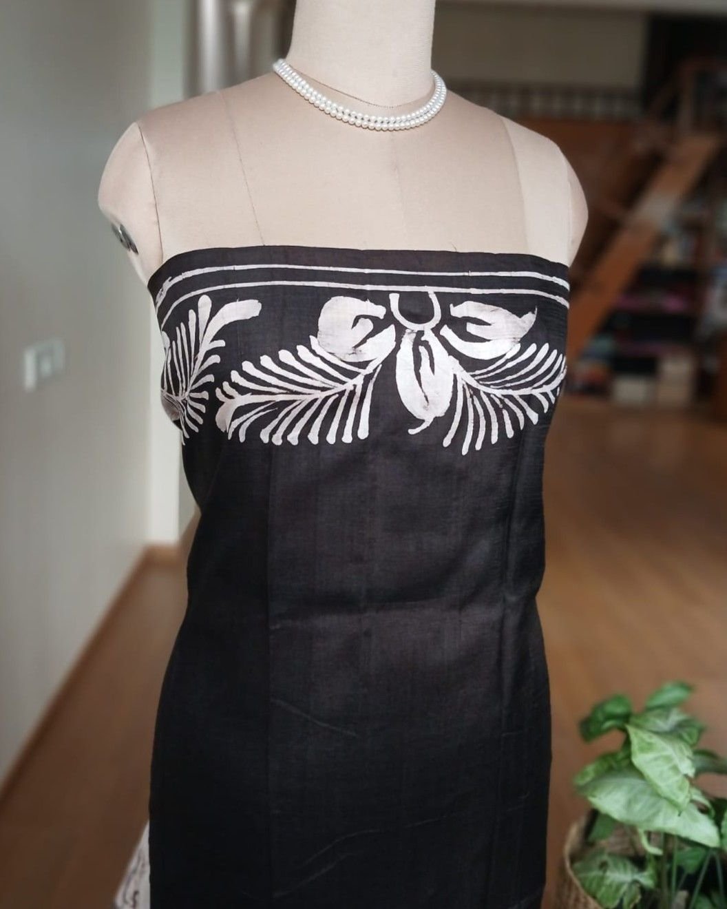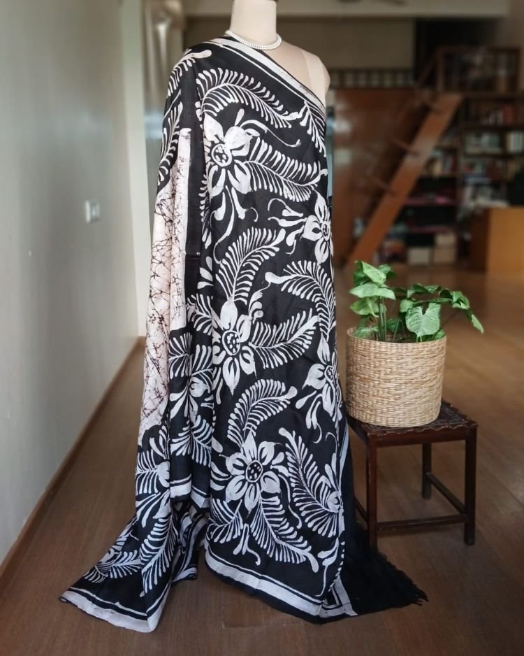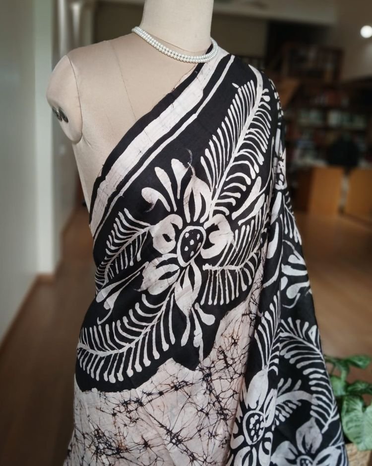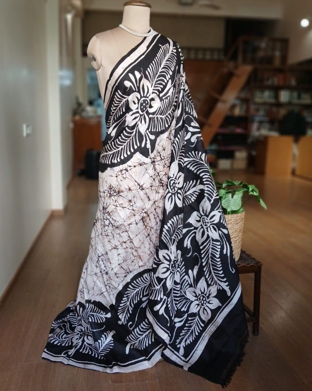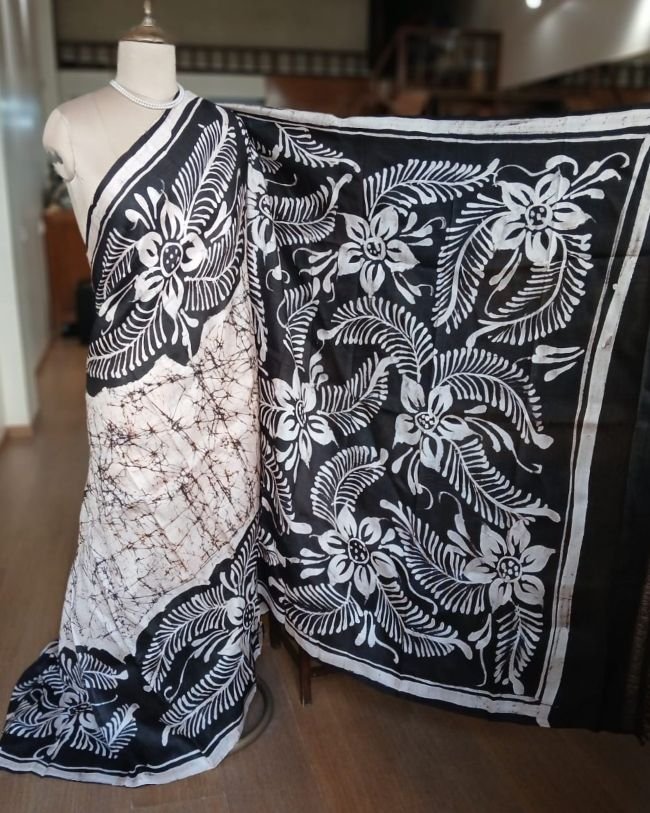 Silk Batik saree from Murshidabad West Bengal using wax resist technique, with contrast borders and pallu.