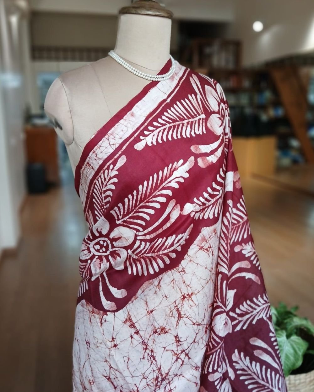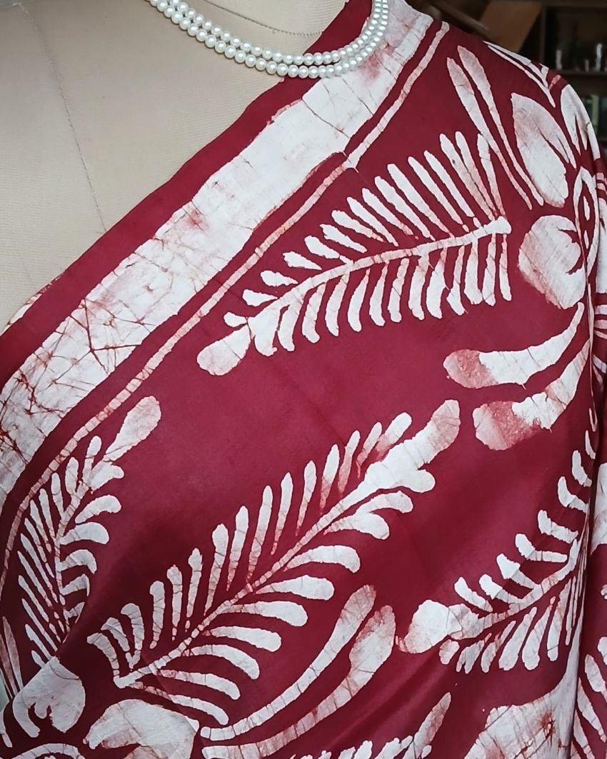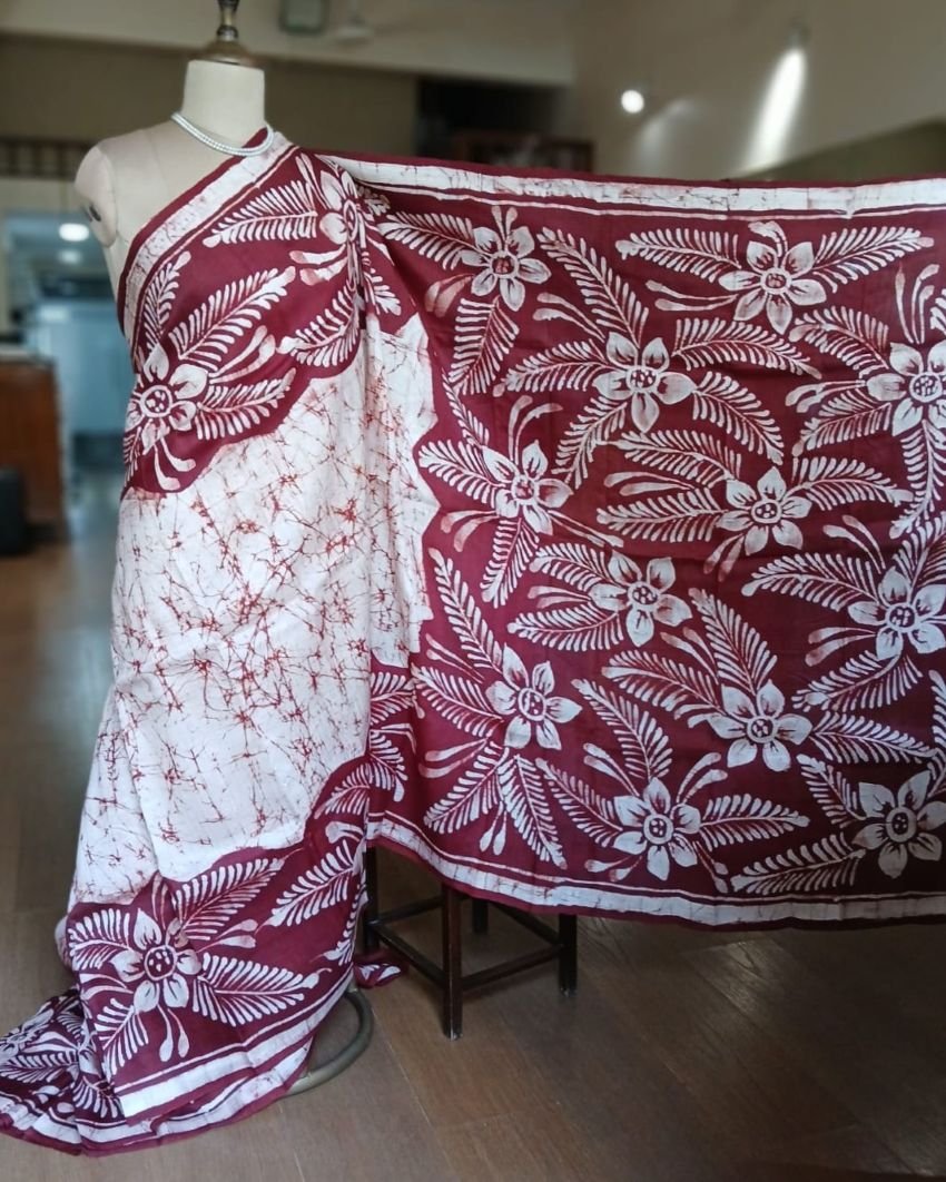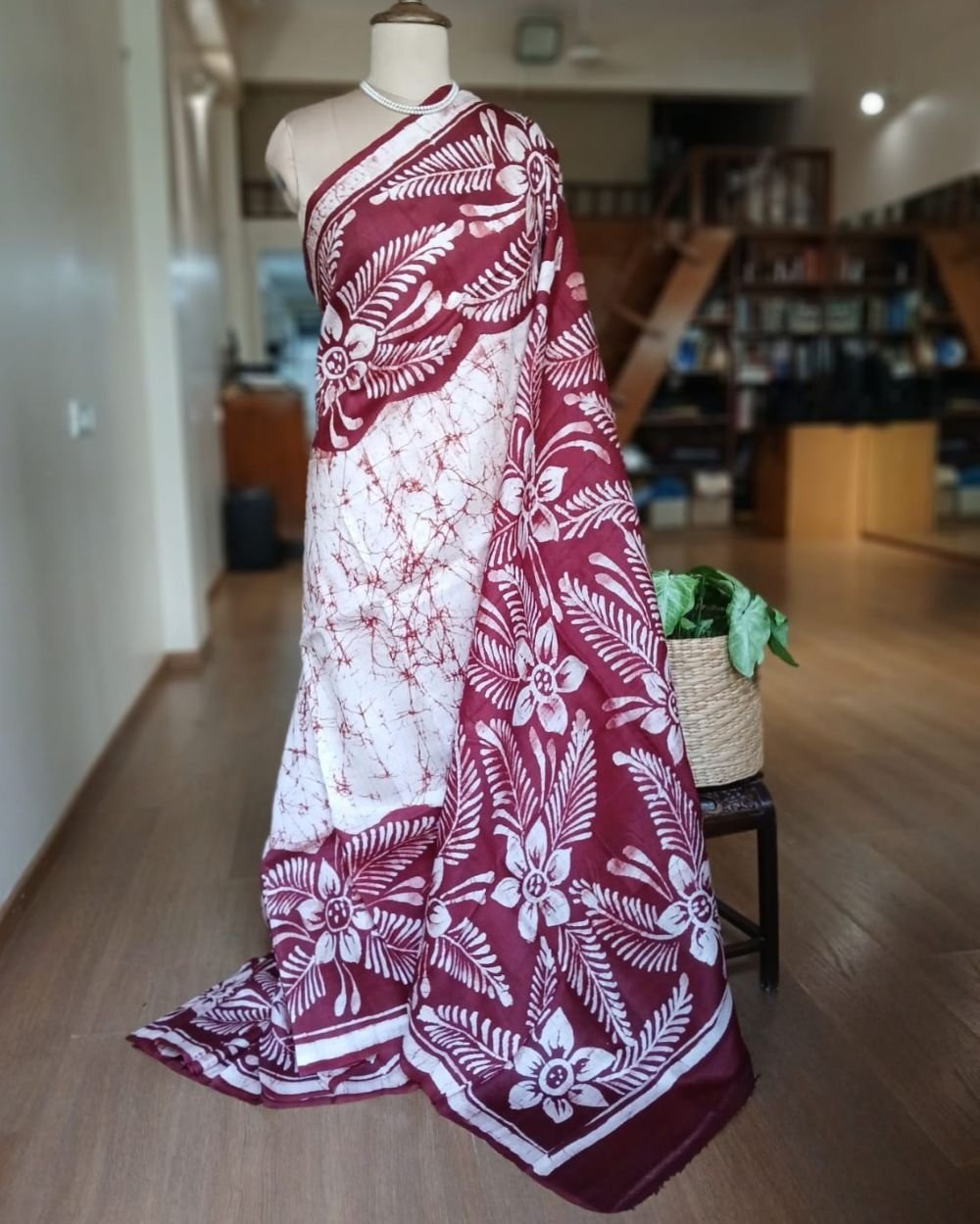 Silk Batik saree from Murshidabad West Bengal using wax resist technique, with contrast borders and pallu.