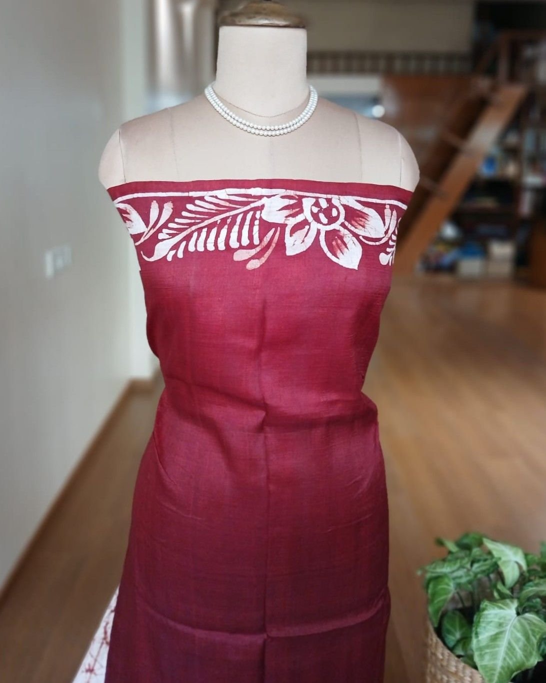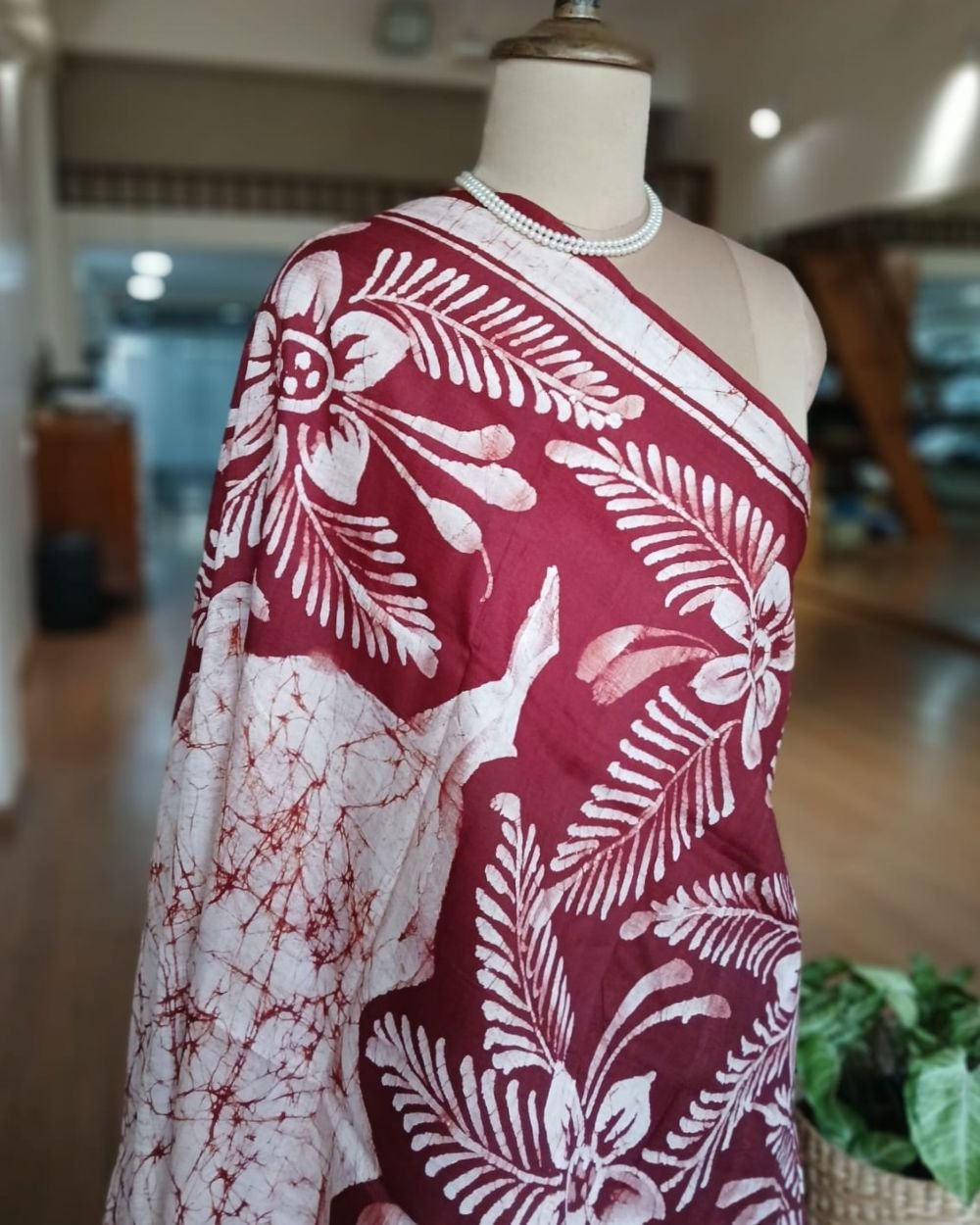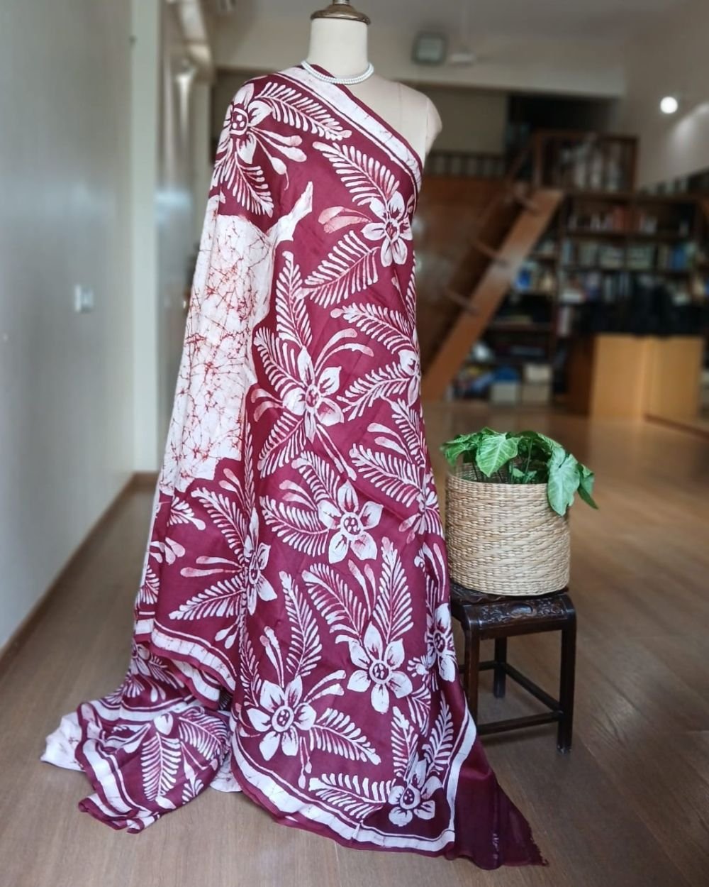 Silk Batik saree from Murshidabad West Bengal using wax resist technique, with contrast borders and pallu.