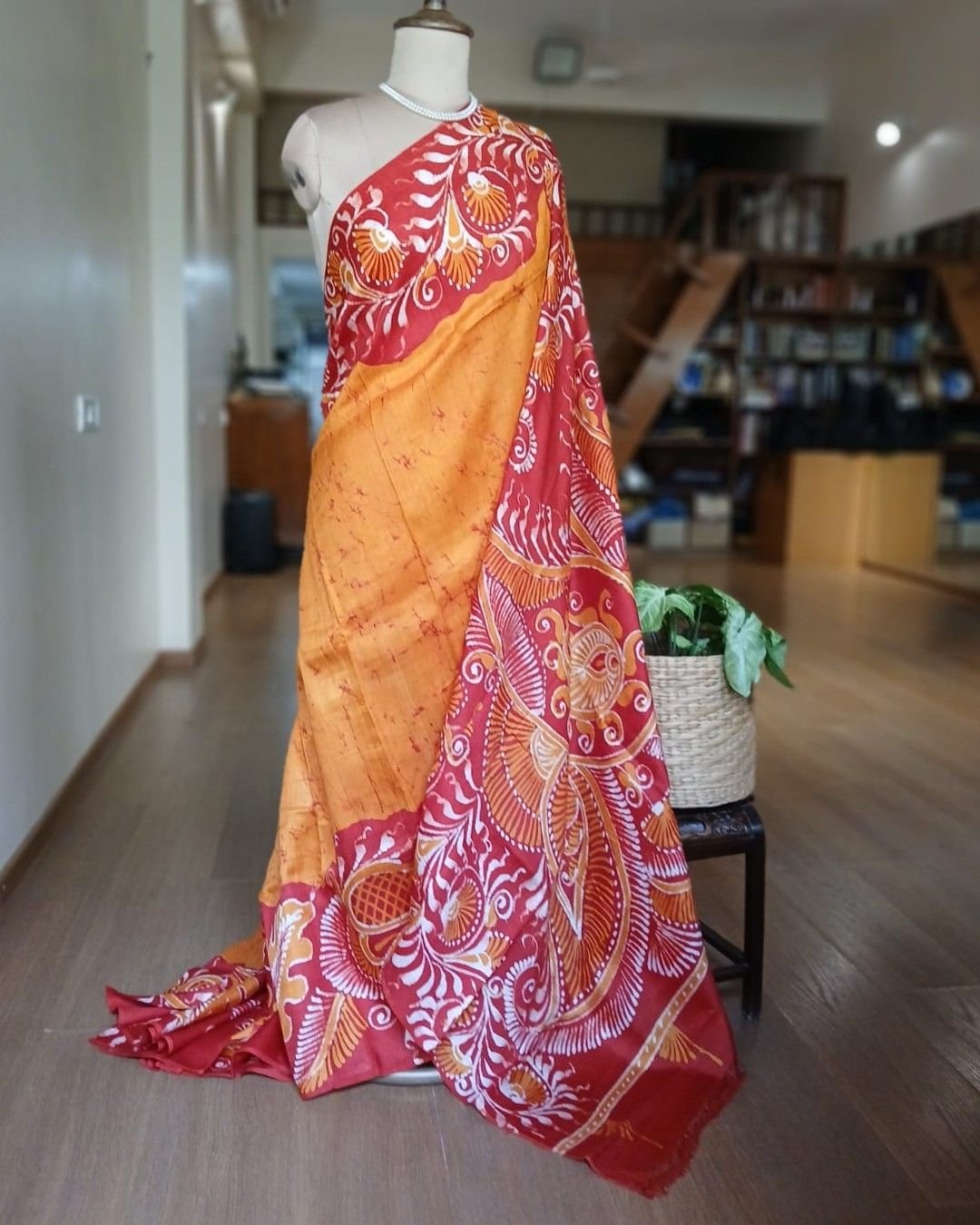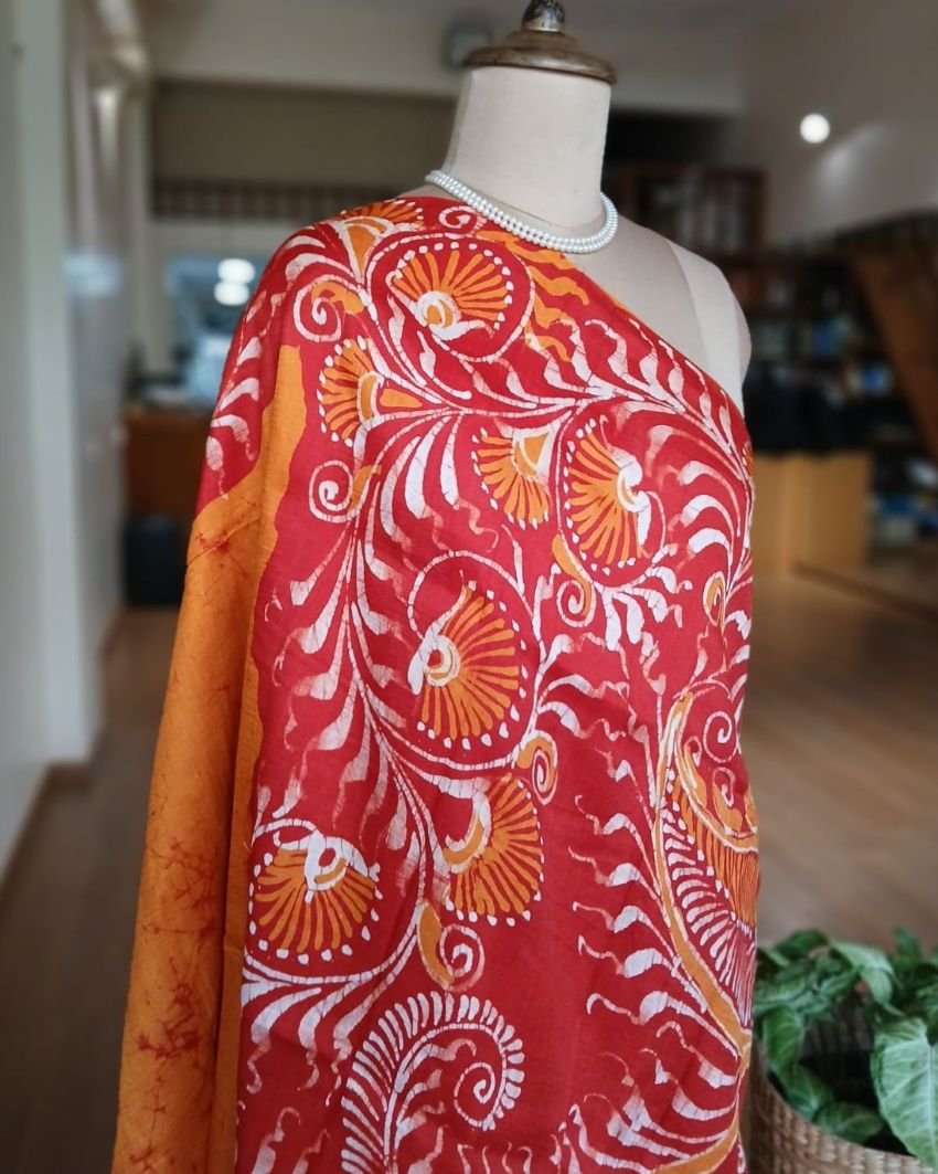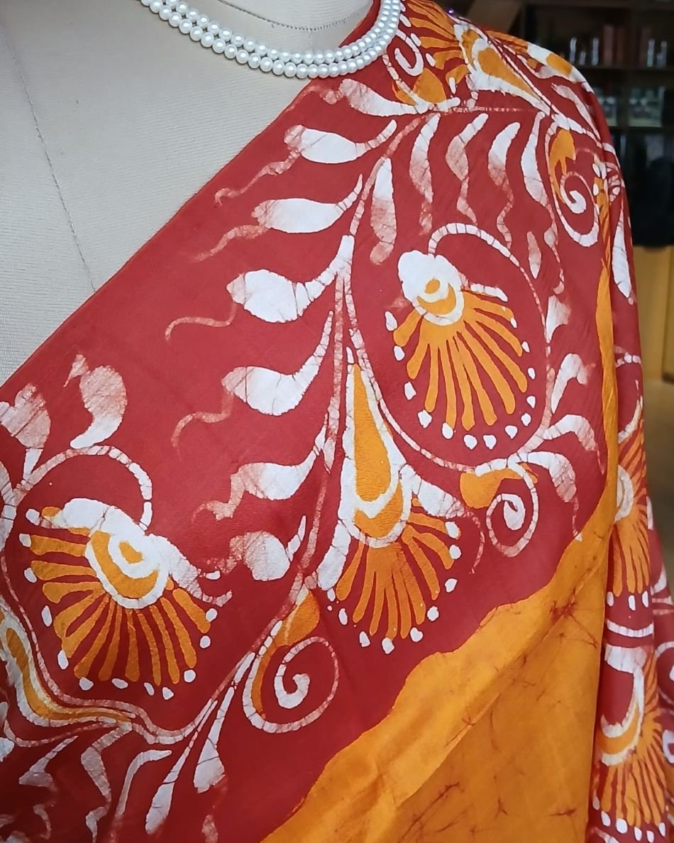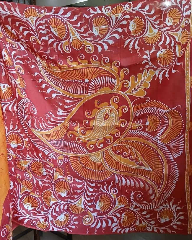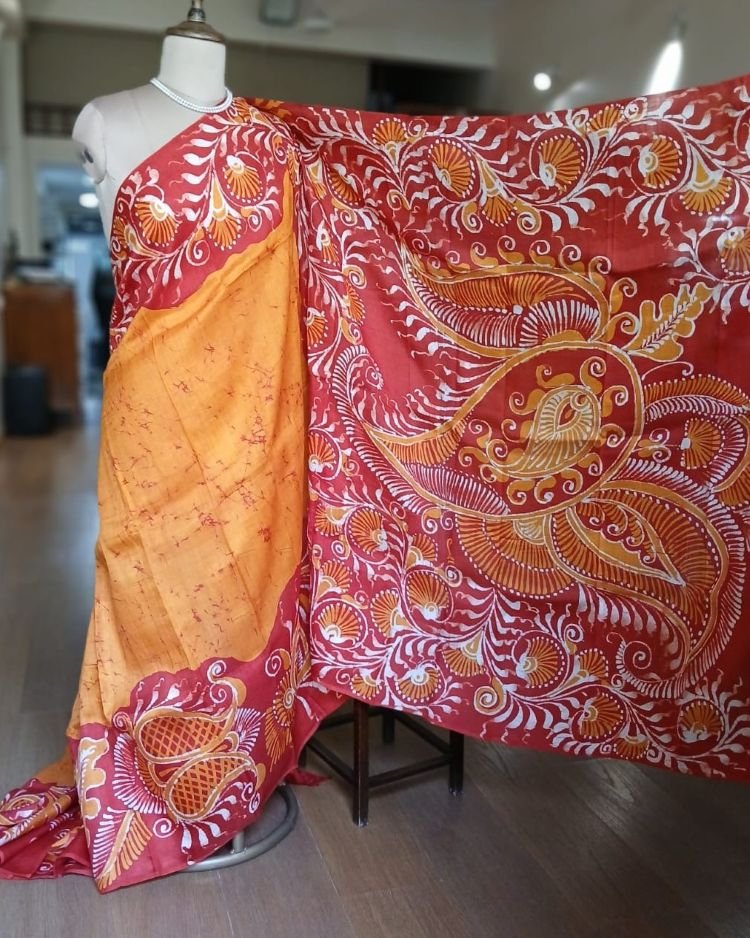 Silk Batik saree from Murshidabad West Bengal using wax resist technique, with contrast borders and pallu.