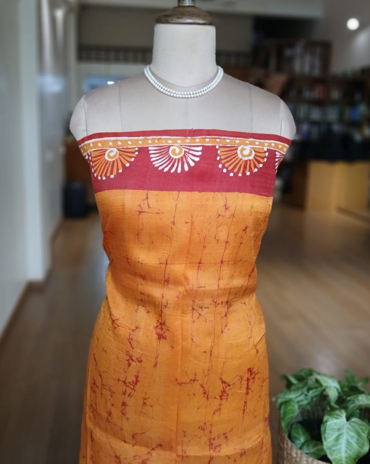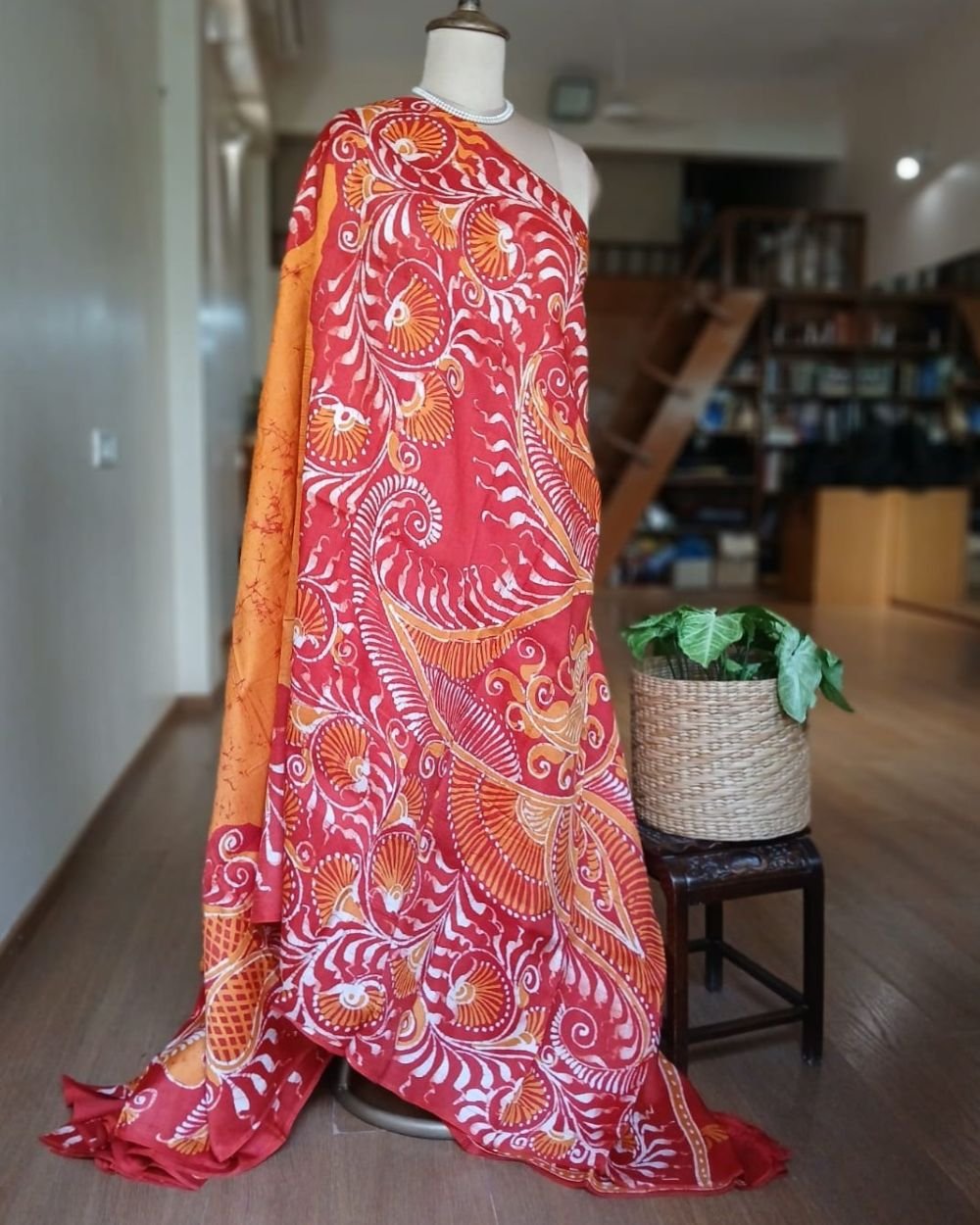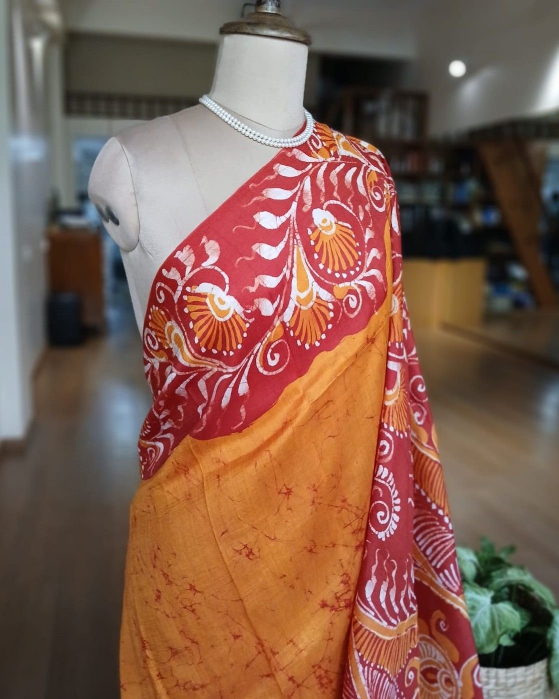Silk Batik saree from Murshidabad West Bengal using wax resist technique, with contrast borders and pallu.