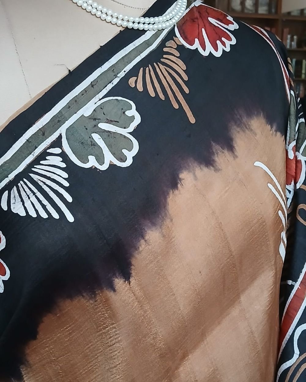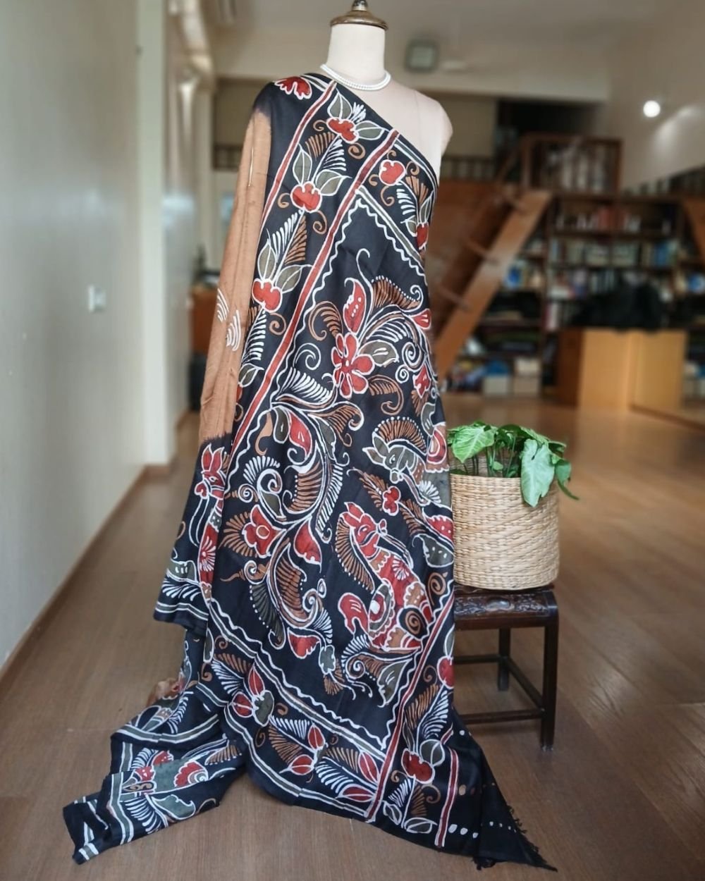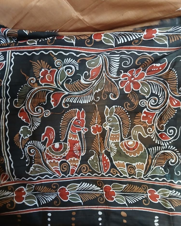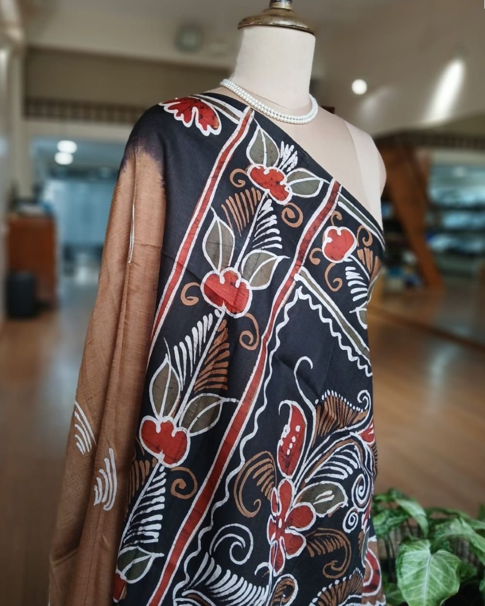 Silk Batik saree from Murshidabad West Bengal using wax resist technique, with contrast borders and pallu.