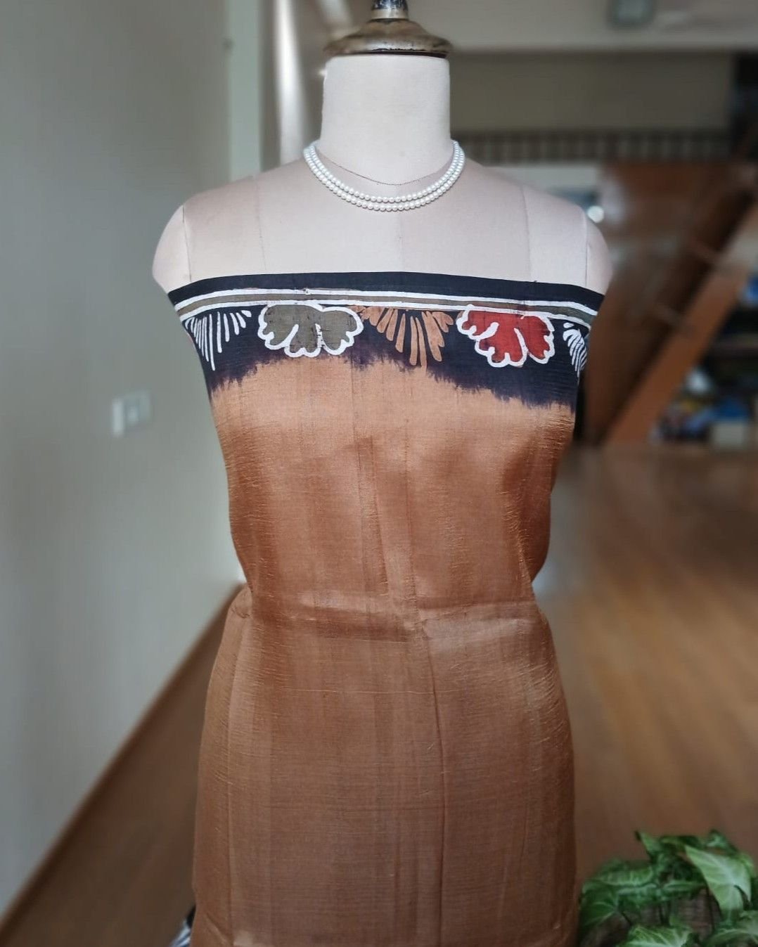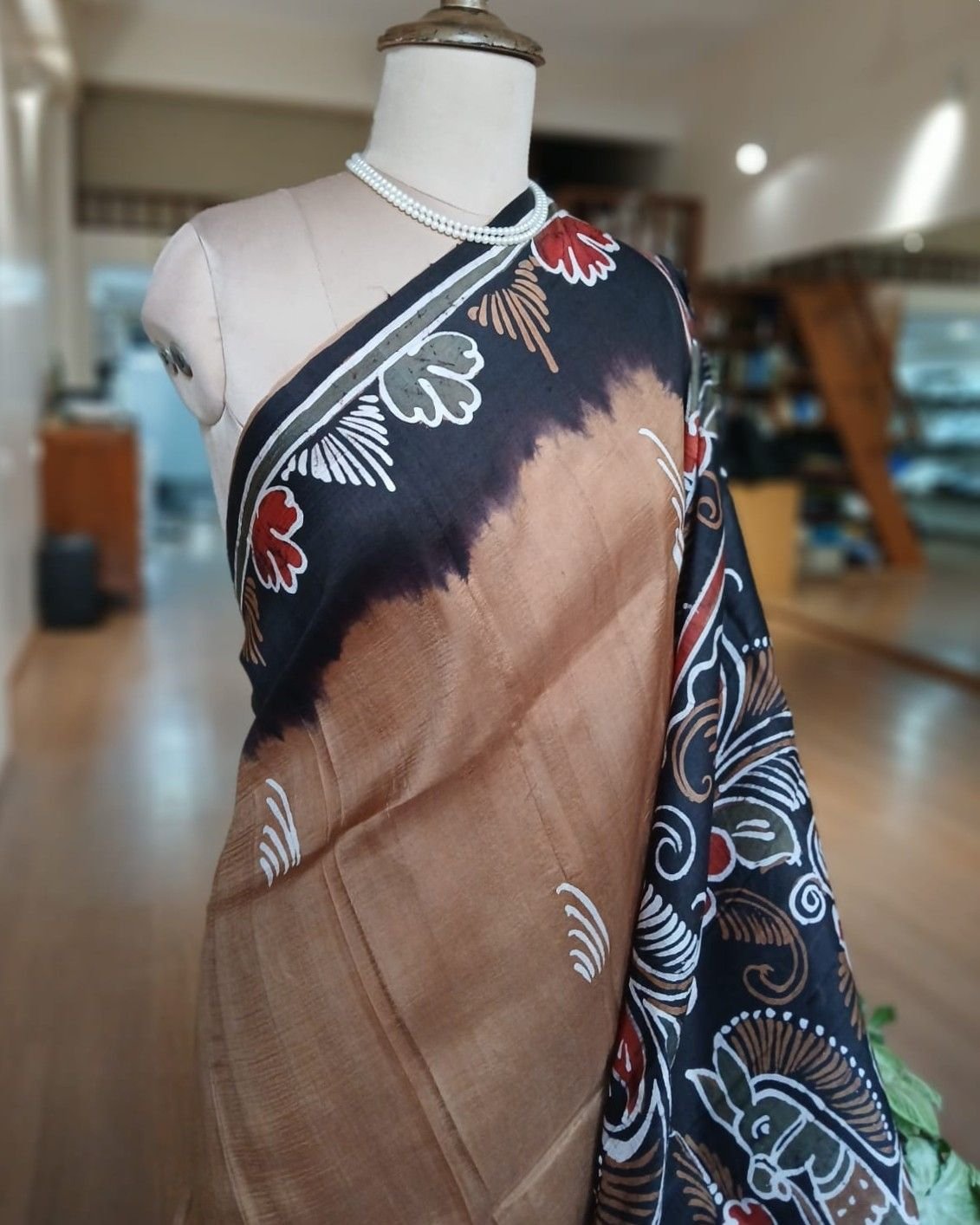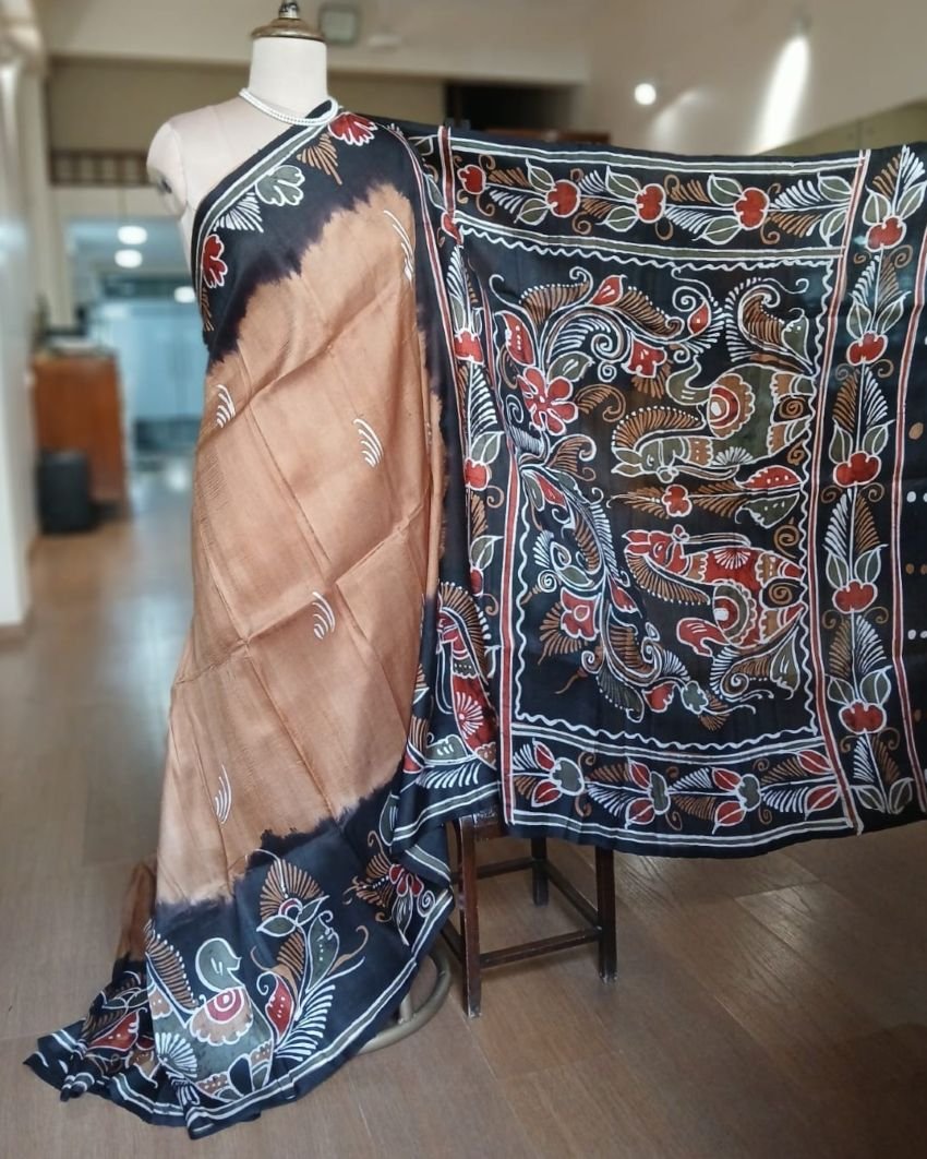 Silk Batik saree from Murshidabad West Bengal using wax resist technique, with contrast borders and pallu.
