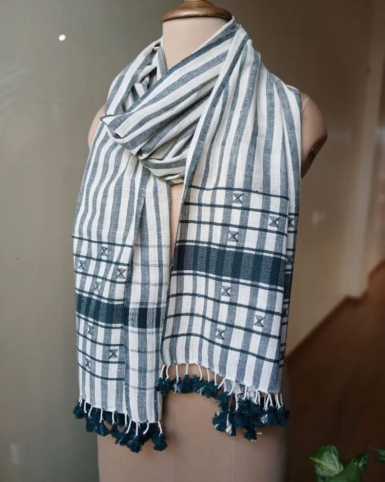 Bhujodi Cotton Stole, handwoven and finished with tassels.