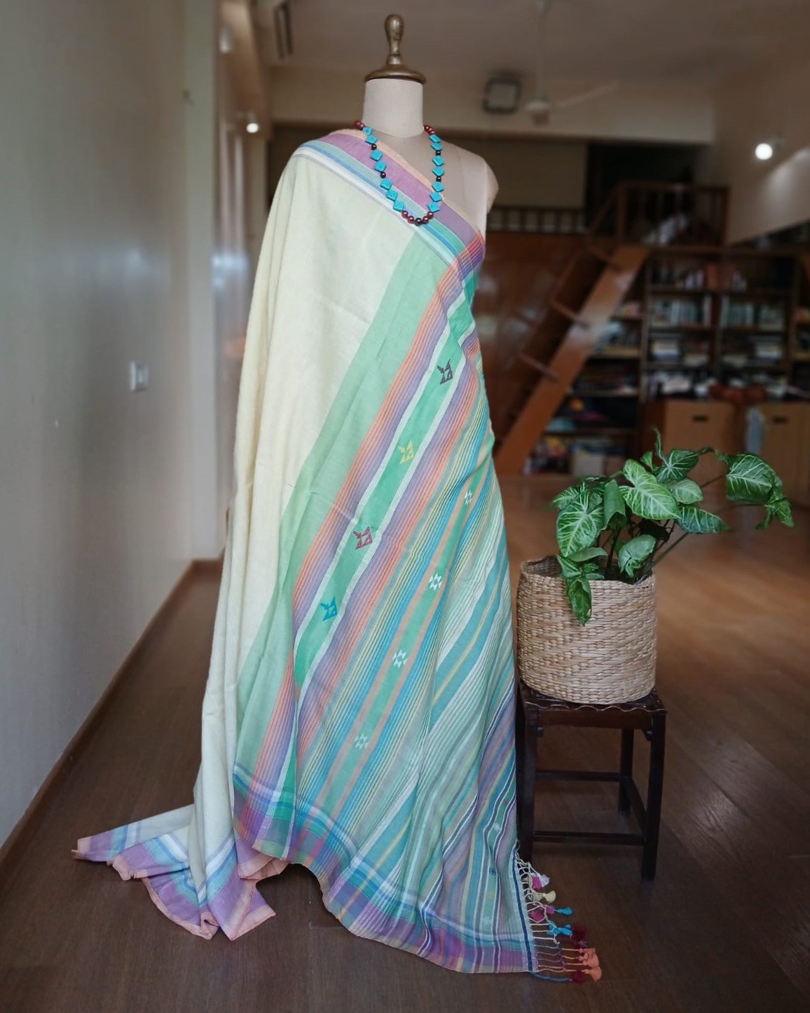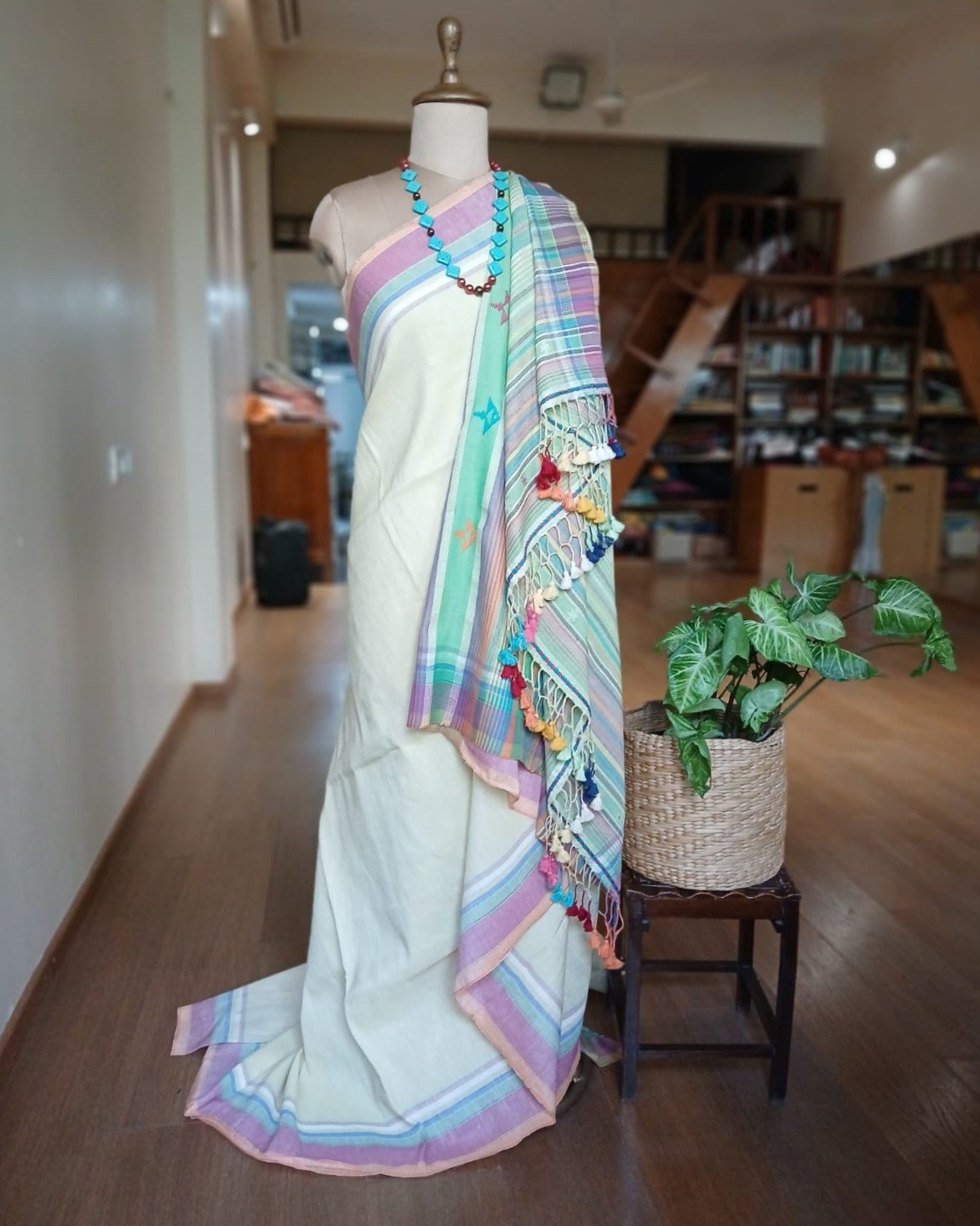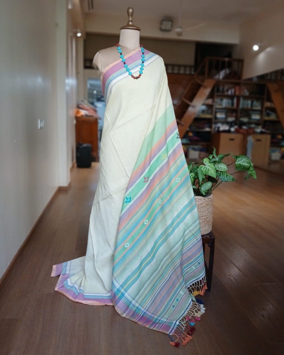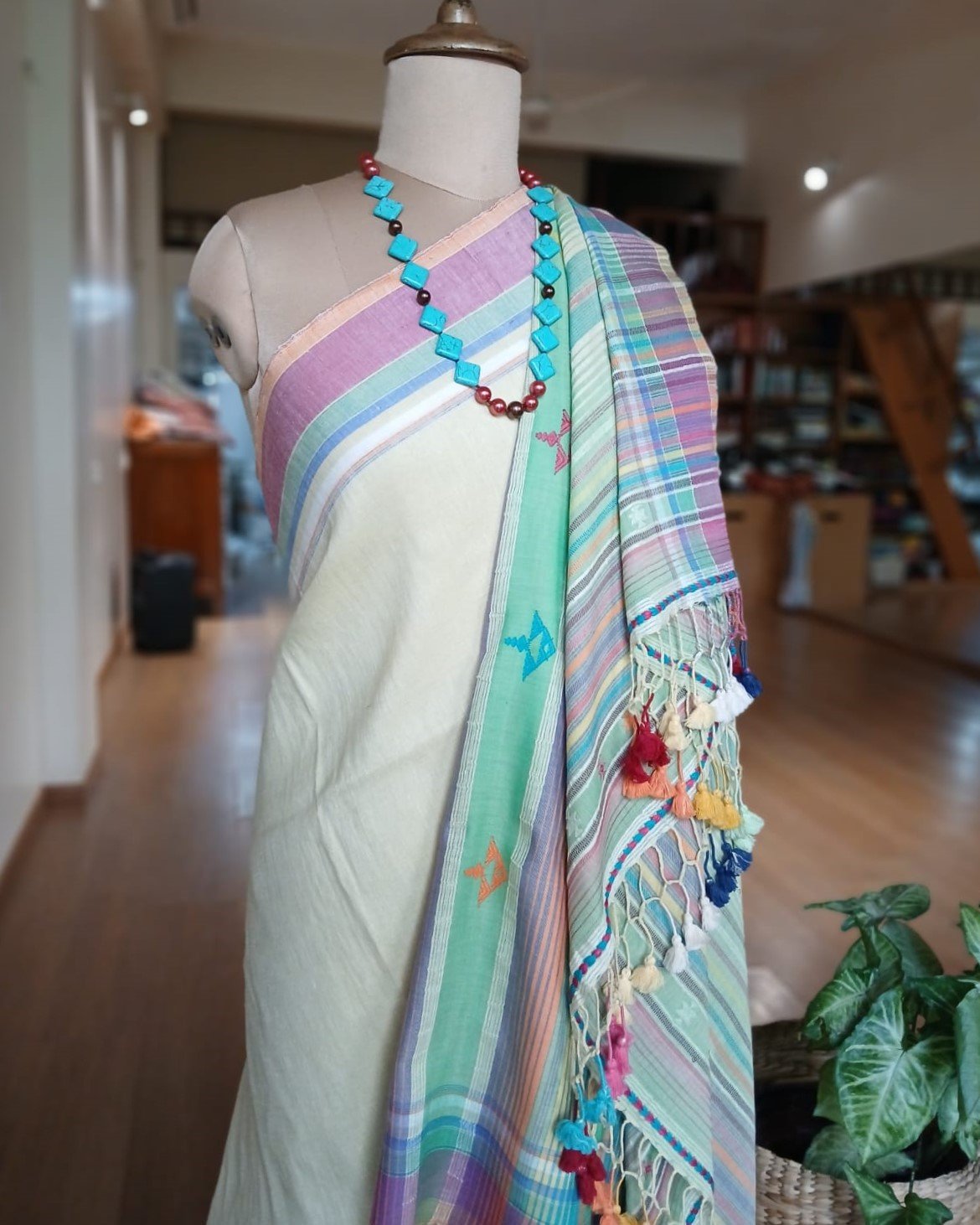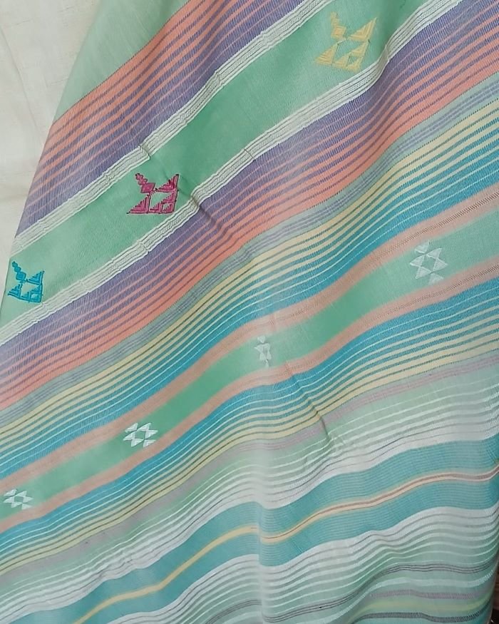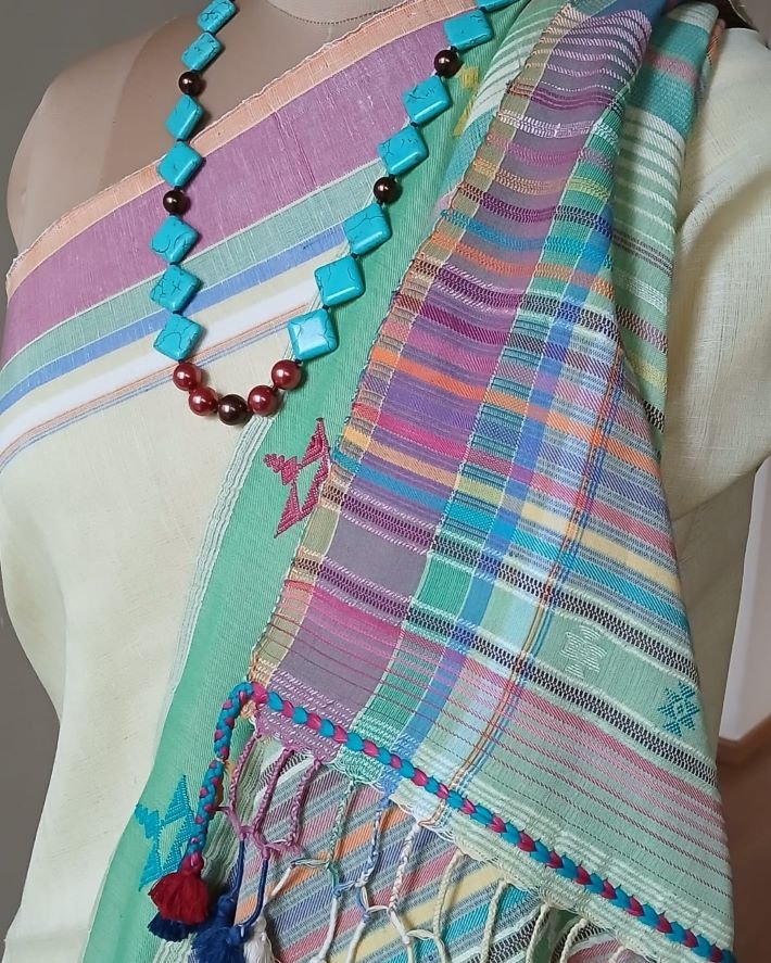 Linen x Cotton Pale Pista Bhujodi Saree Handwoven and beautifully finished with tassels.
