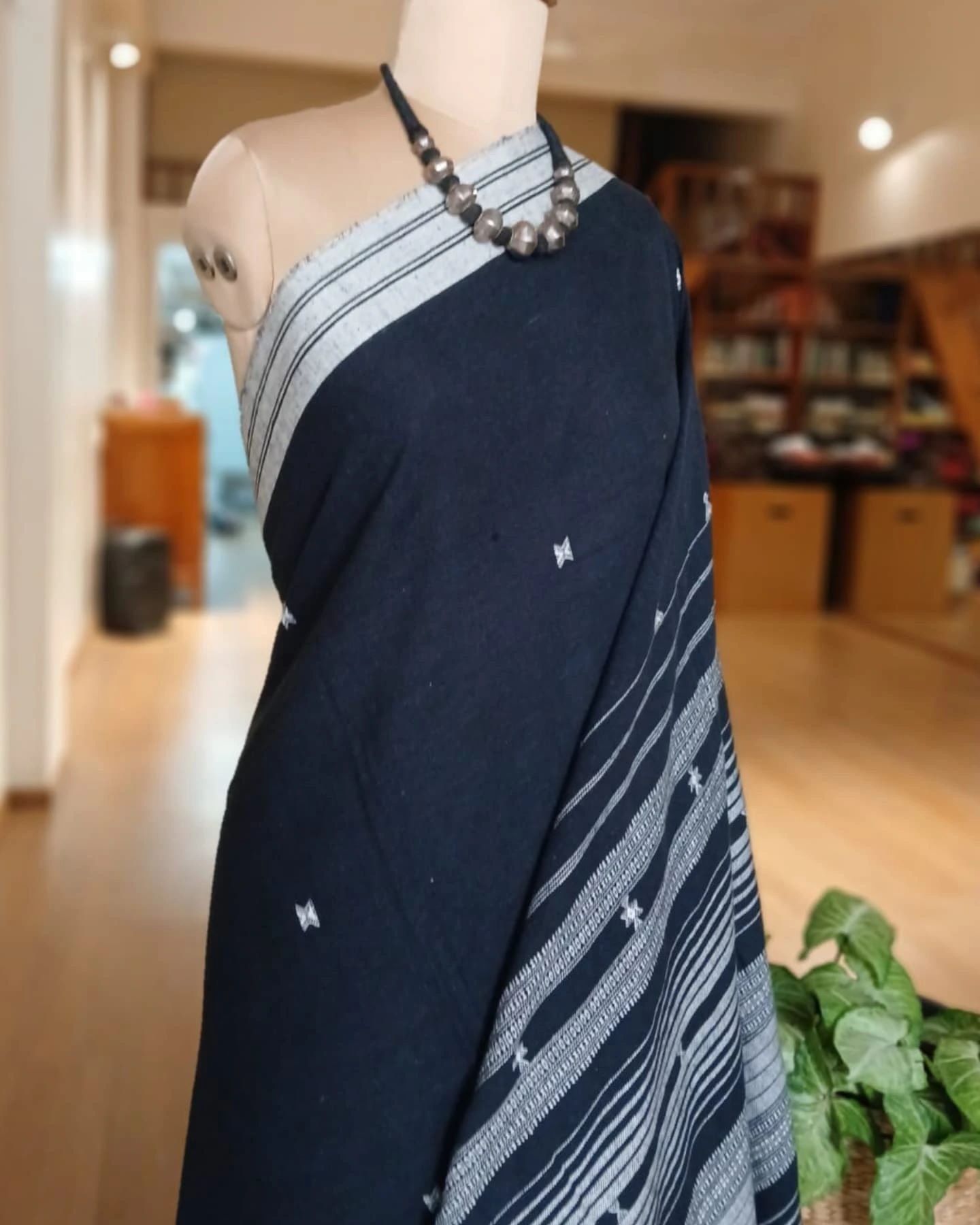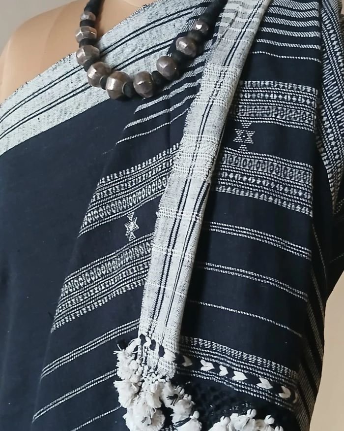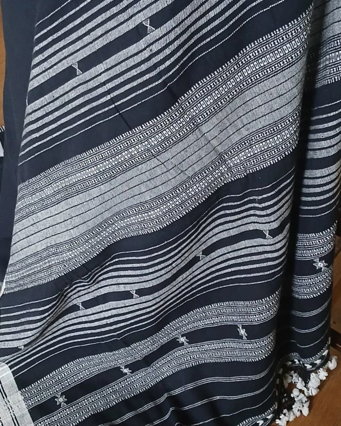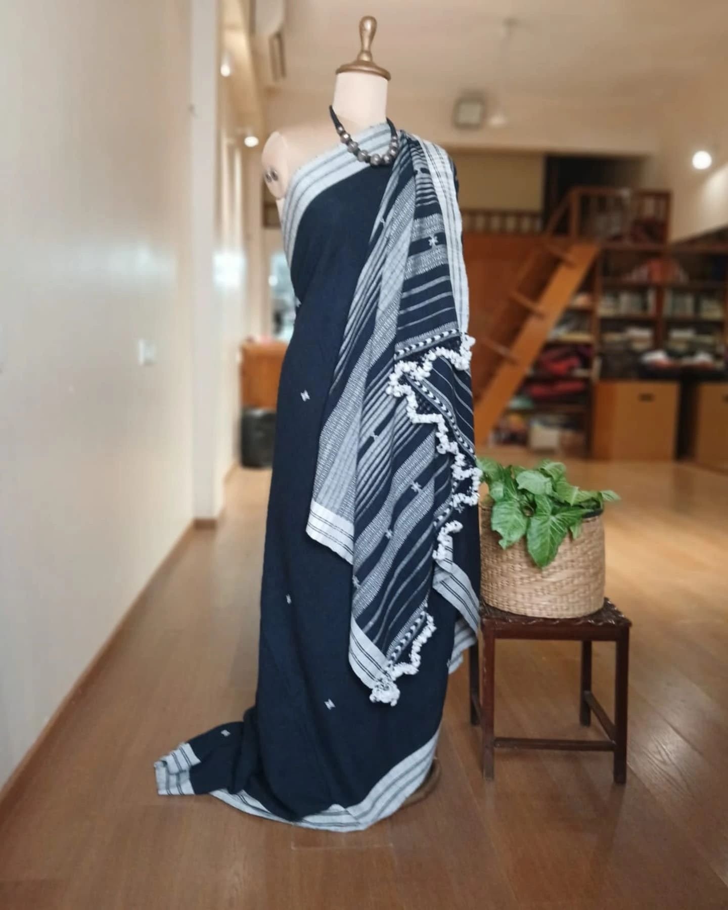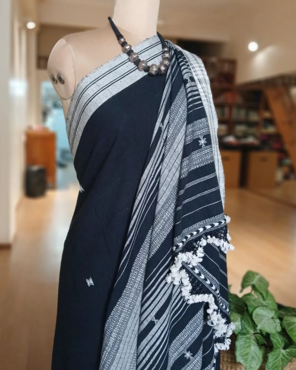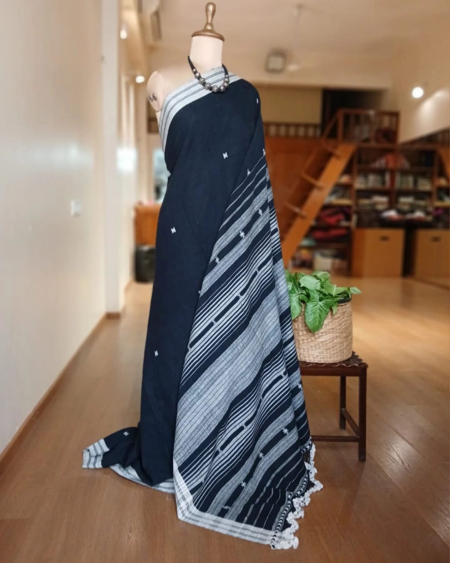 Bhujodi Saree handwoven in Kala Cotton. Beautifully finished with tassels.