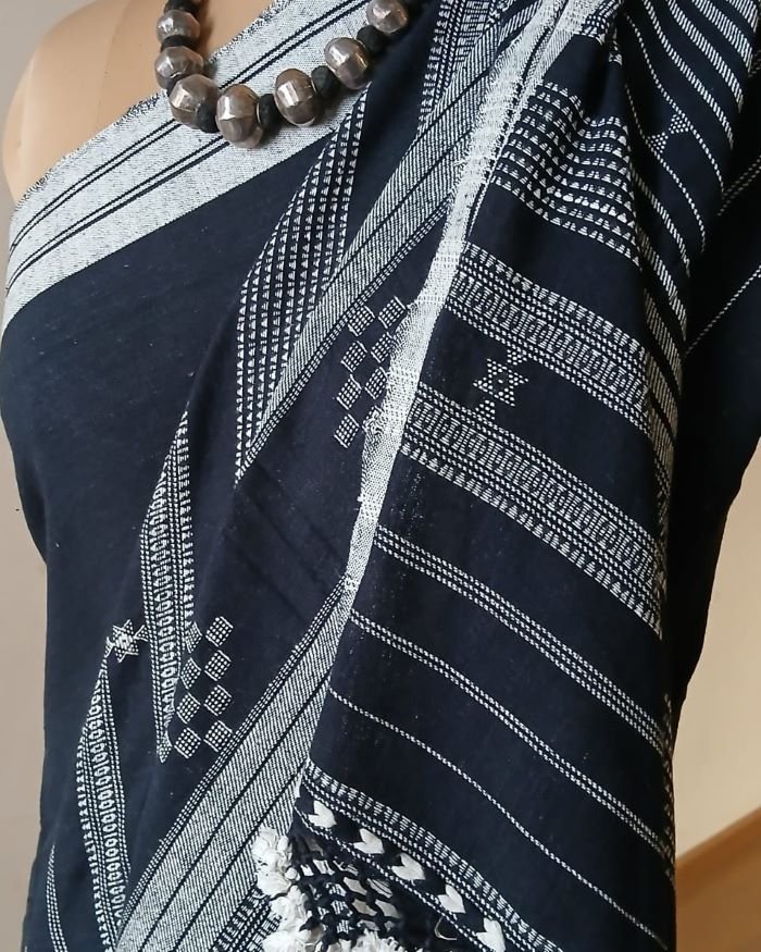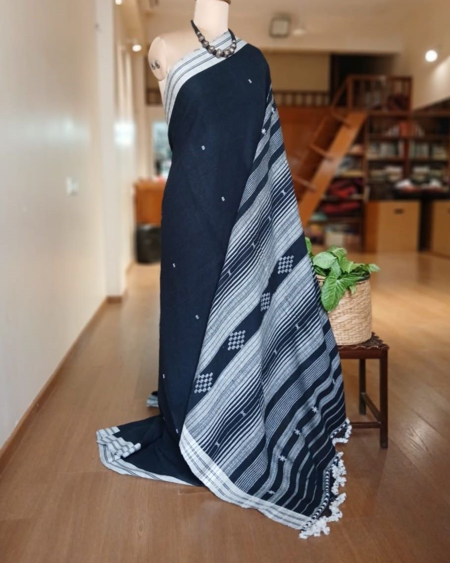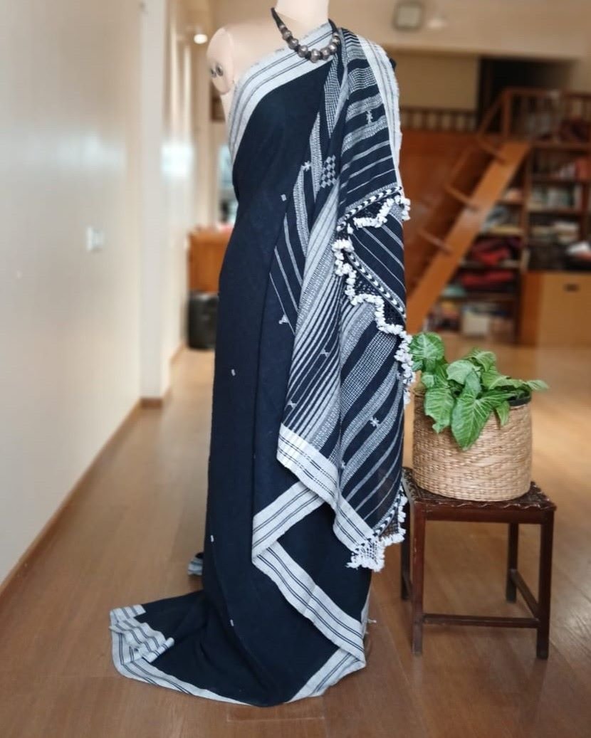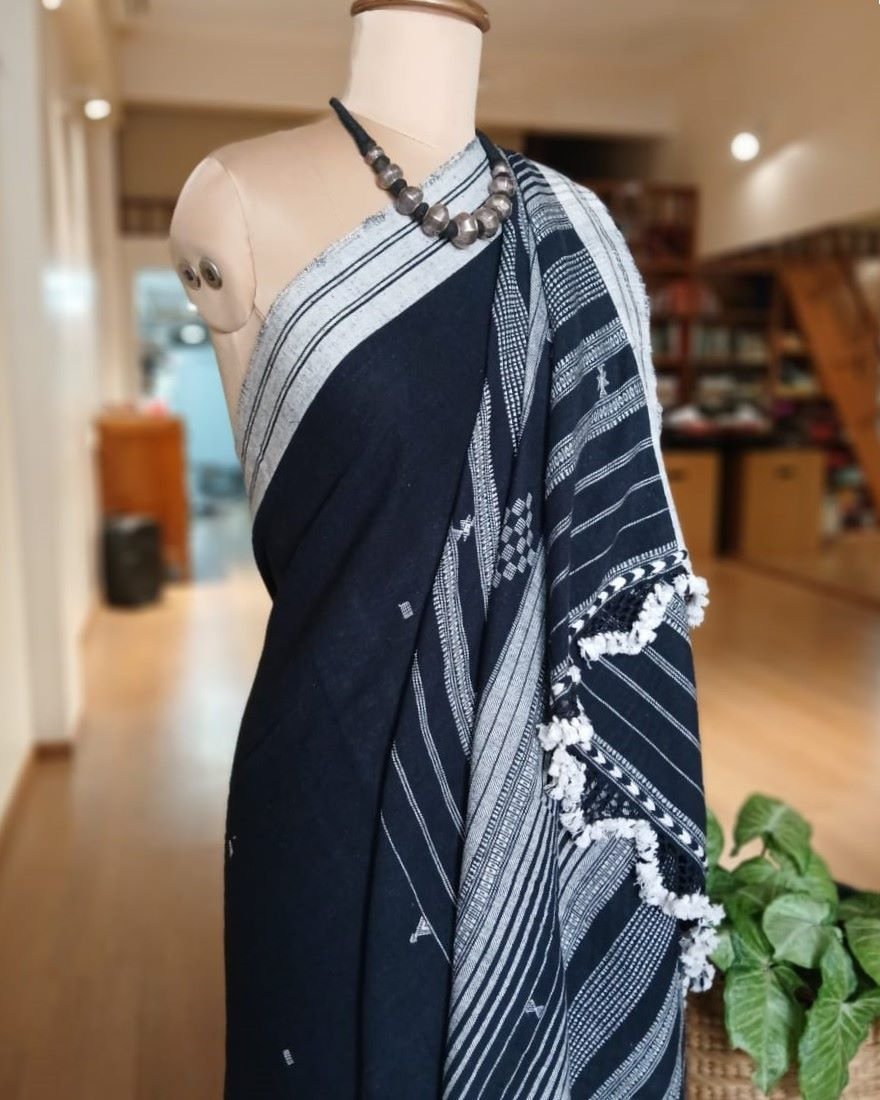 Bhujodi Saree handwoven in Kala Cotton. Beautifully finished with tassels.