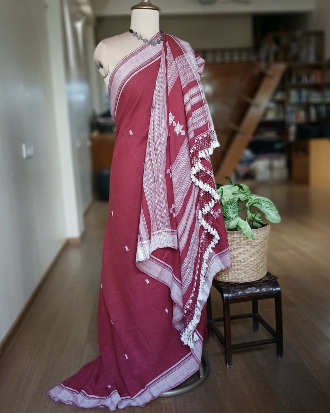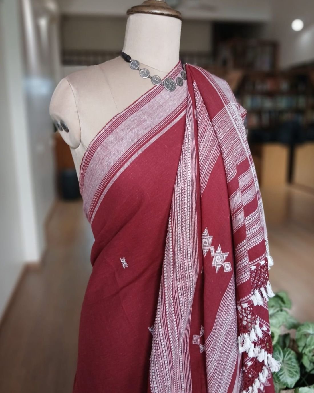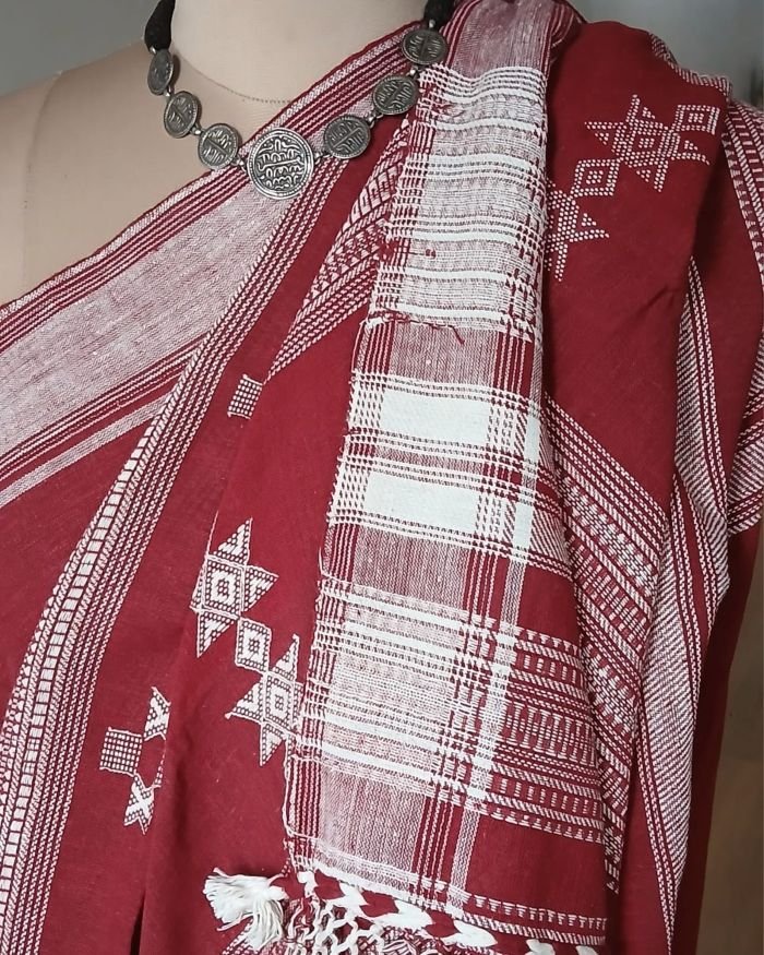Bhujodi Saree handwoven in Kala Cotton. Beautifully finished with tassels.