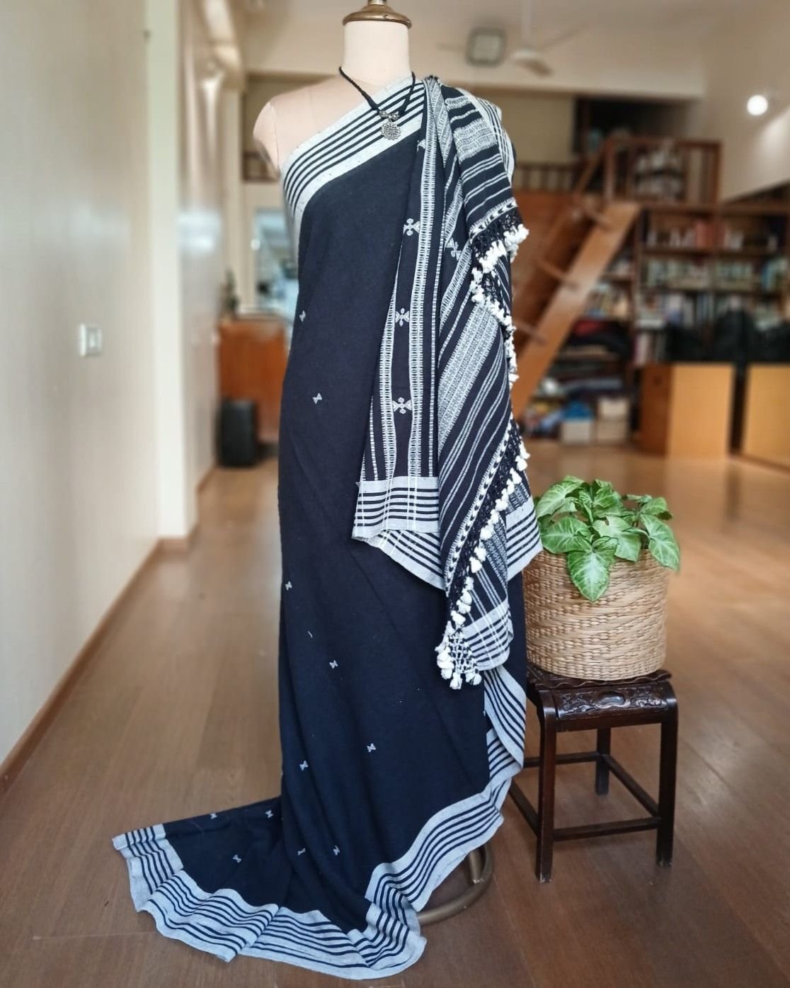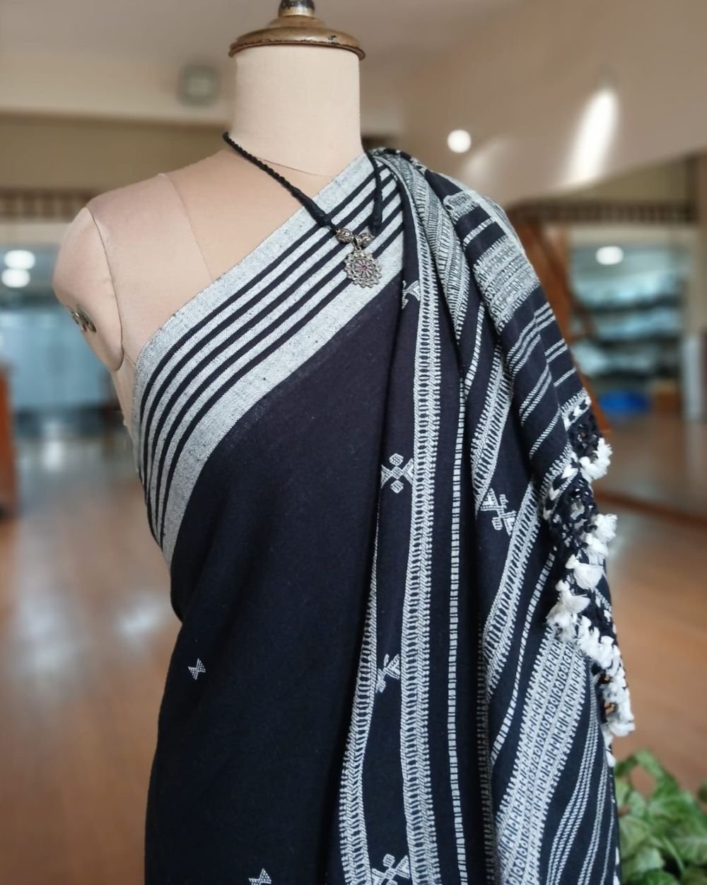 Bhujodi Saree handwoven in Kala Cotton. Beautifully finished with tassels.