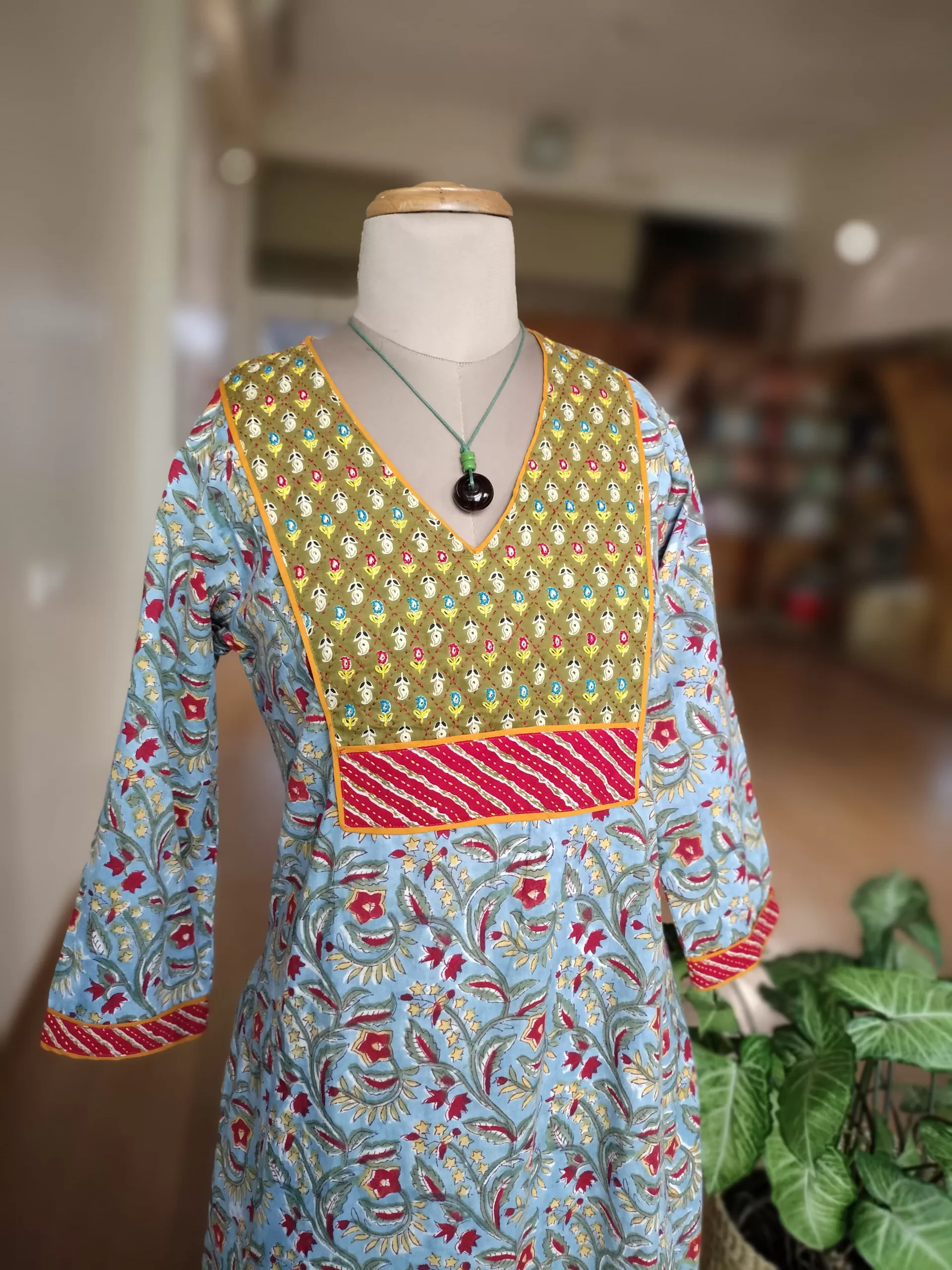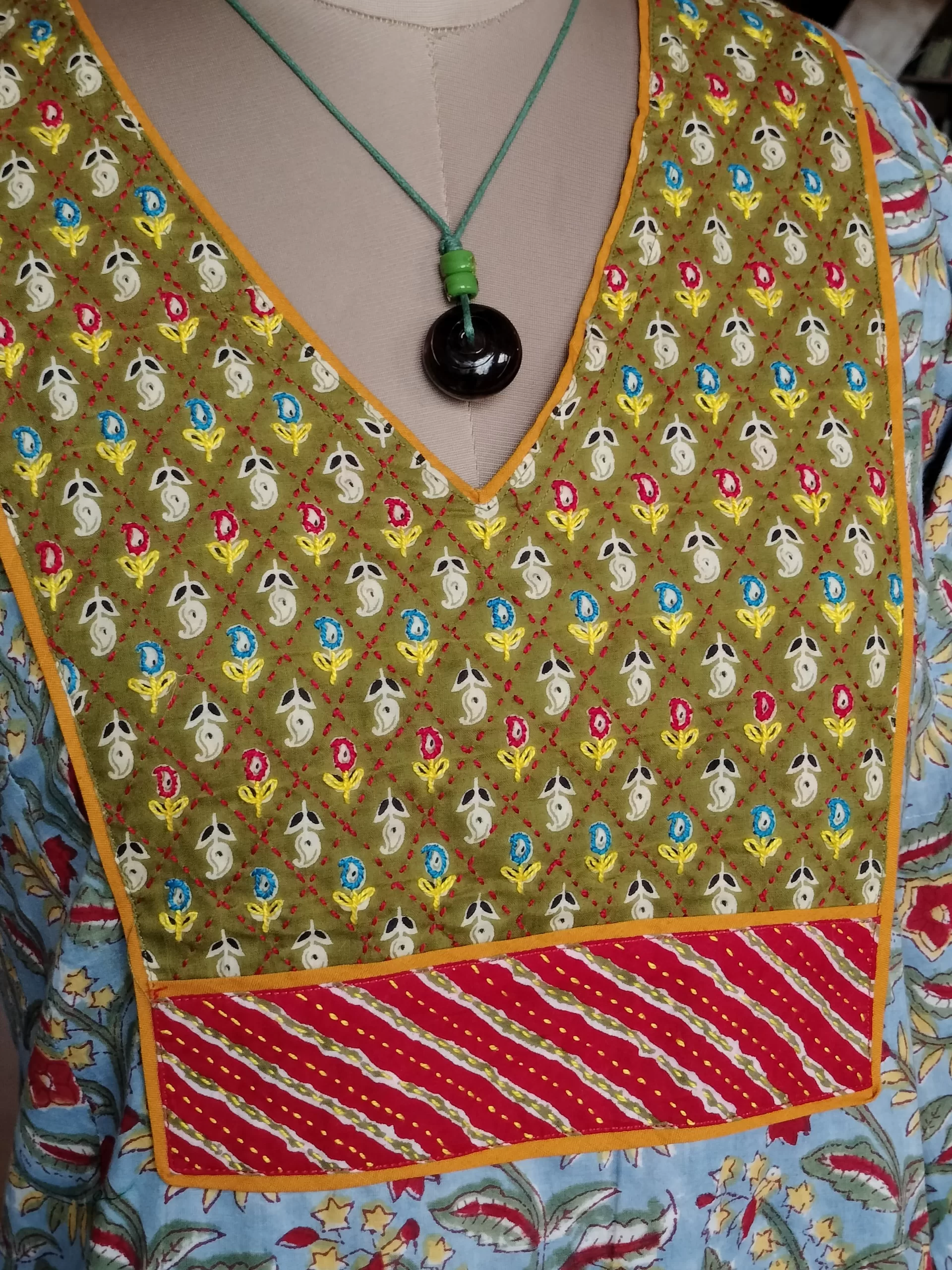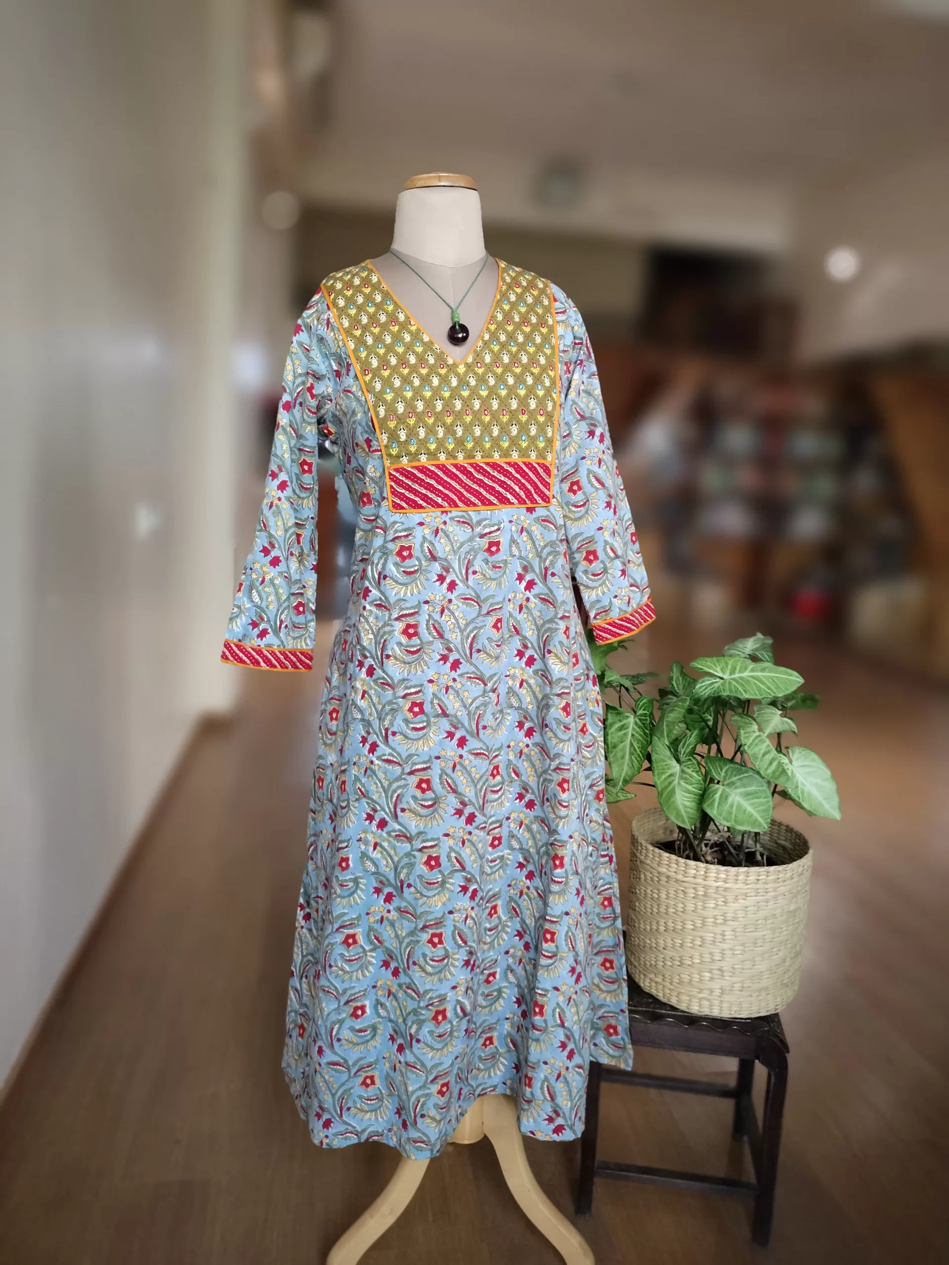 Pretty one-piece dress in handblock print from Rajasthan with hand embroidery on the yoke.