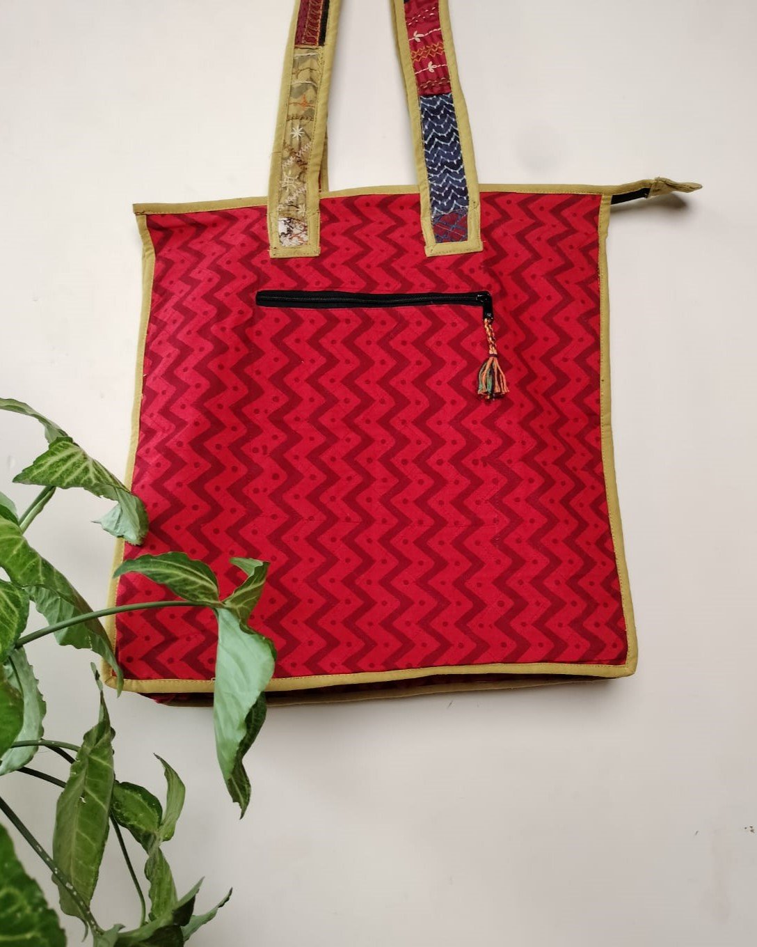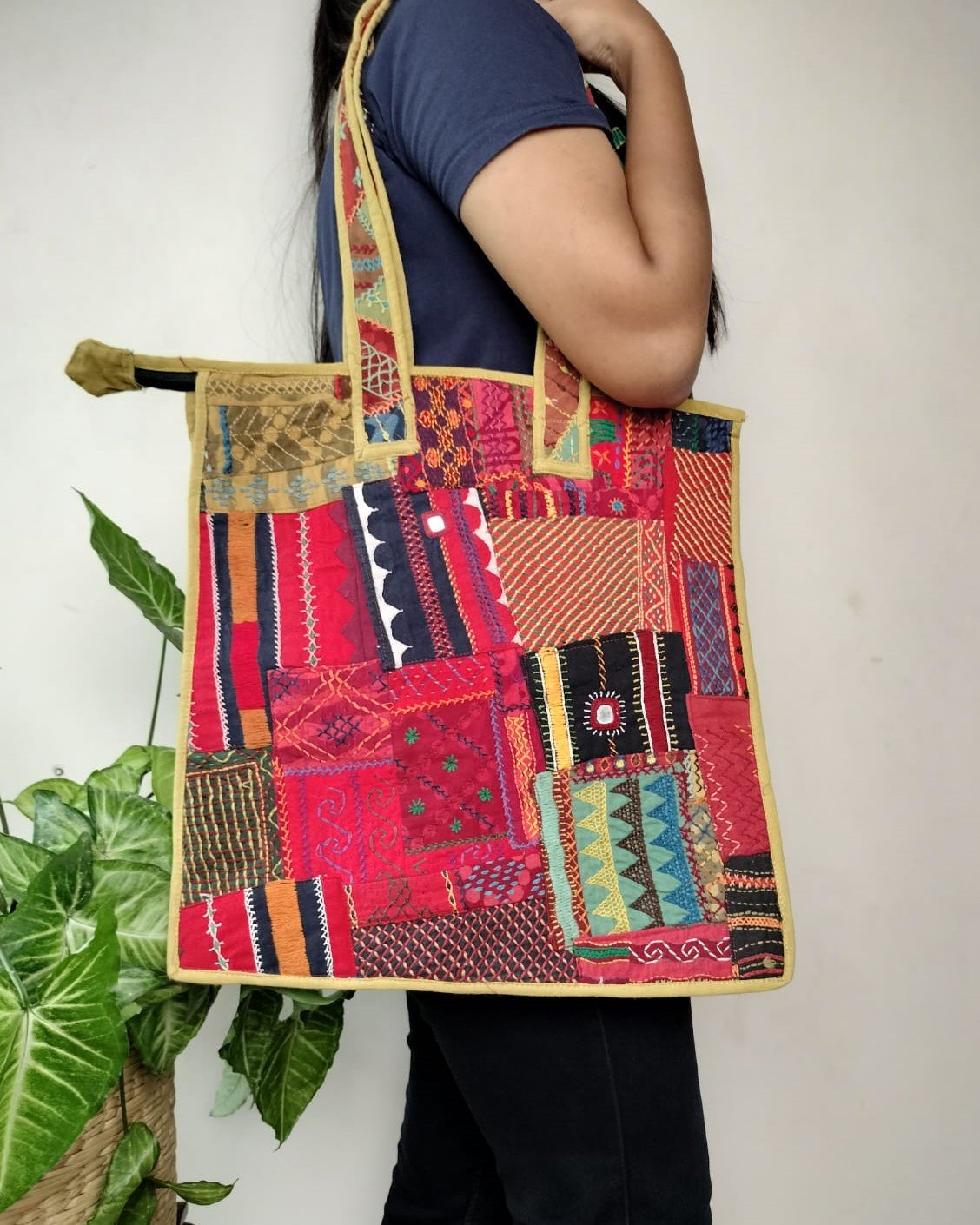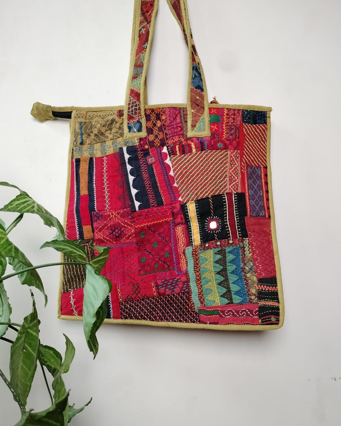 Boho Patchwork hand-embroidered large size tote bag. It has zip closure on the top, a zip pocket inside, and a zip pocket outside. Made by a non-profit in Bellary district of Karnataka.