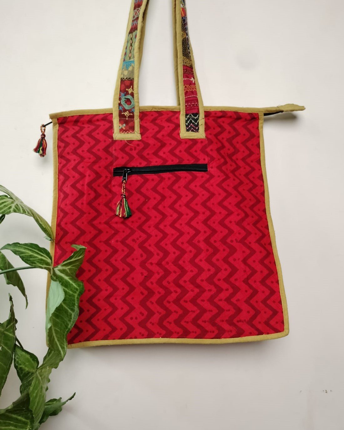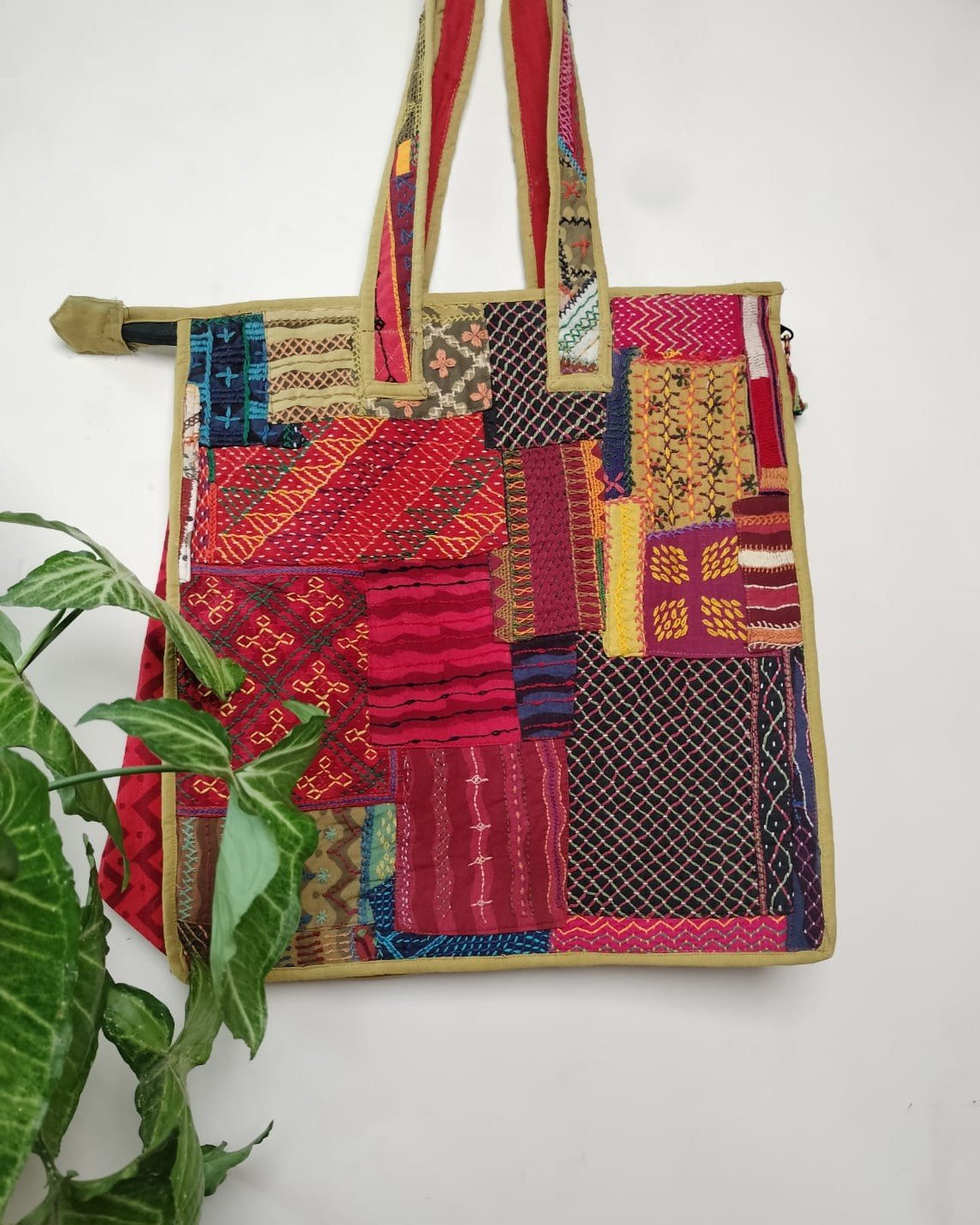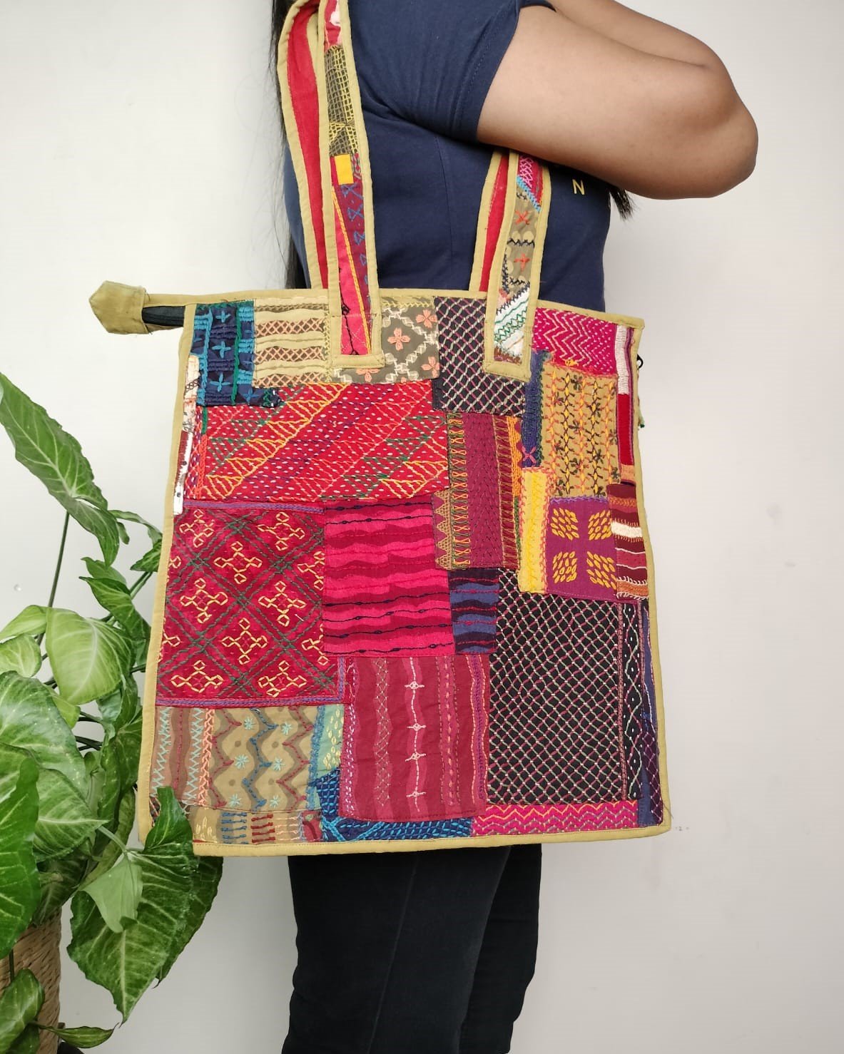 Boho Patchwork hand-embroidered large size tote bag. It has zip closure on the top, a zip pocket inside, and a zip pocket outside. Made by a non-profit in Bellary district of Karnataka.