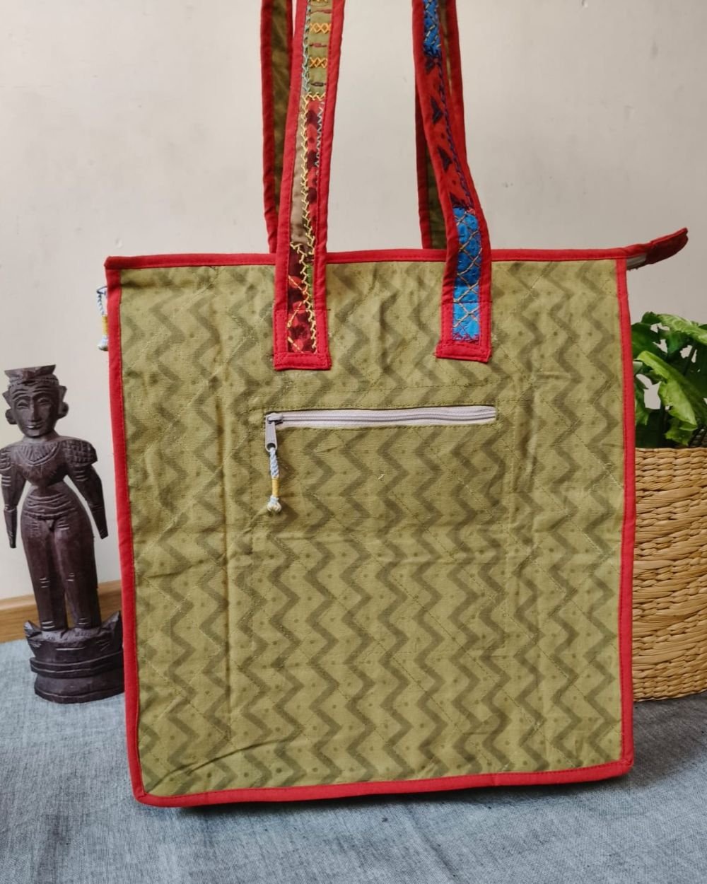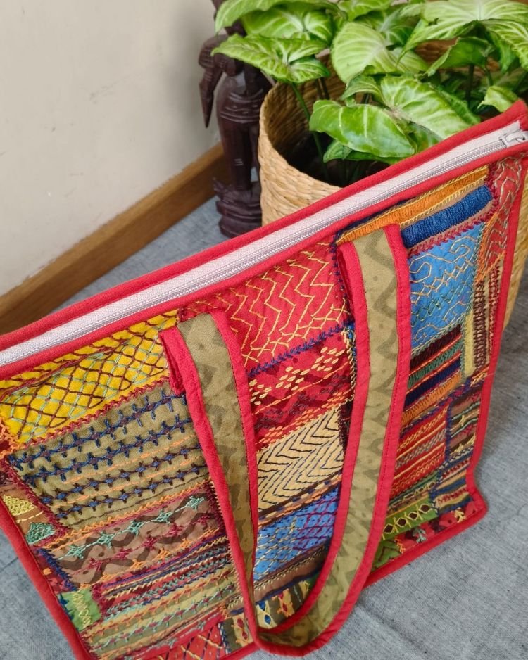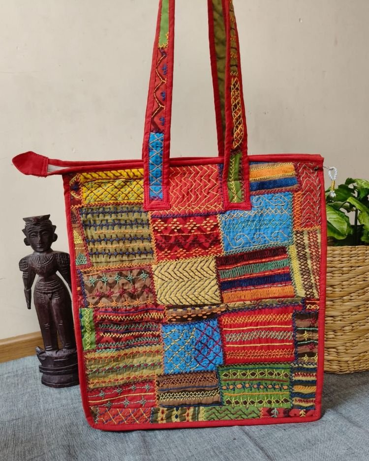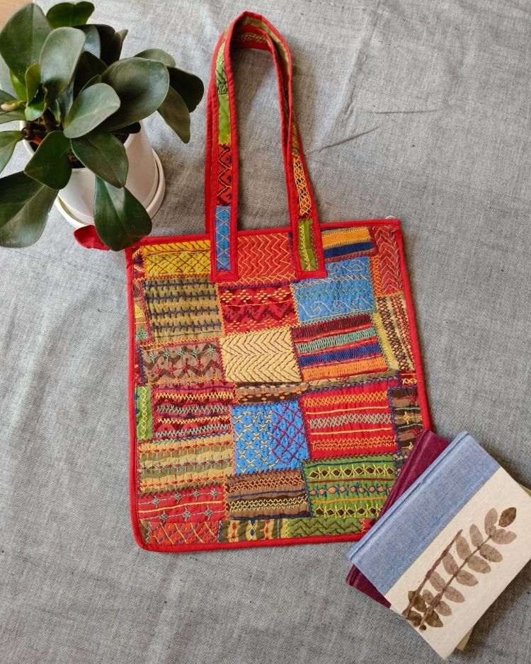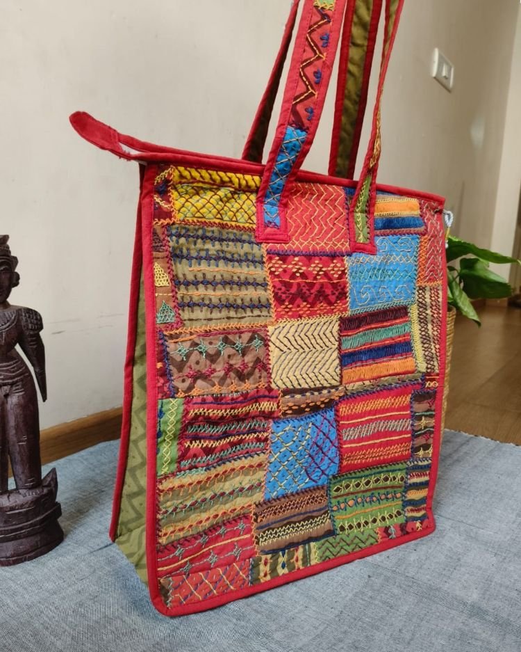 Boho Patchwork hand-embroidered large size tote bag.