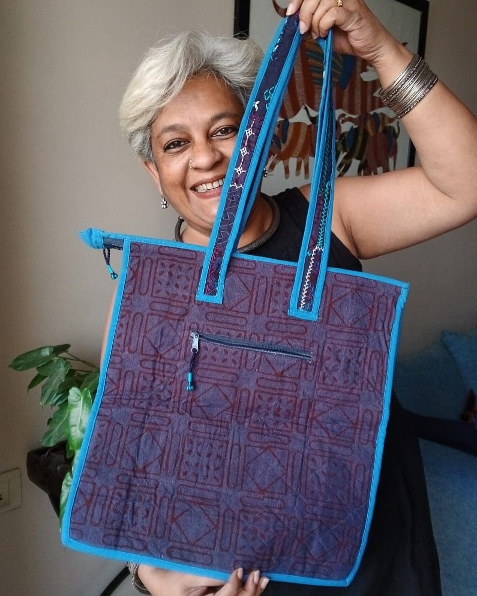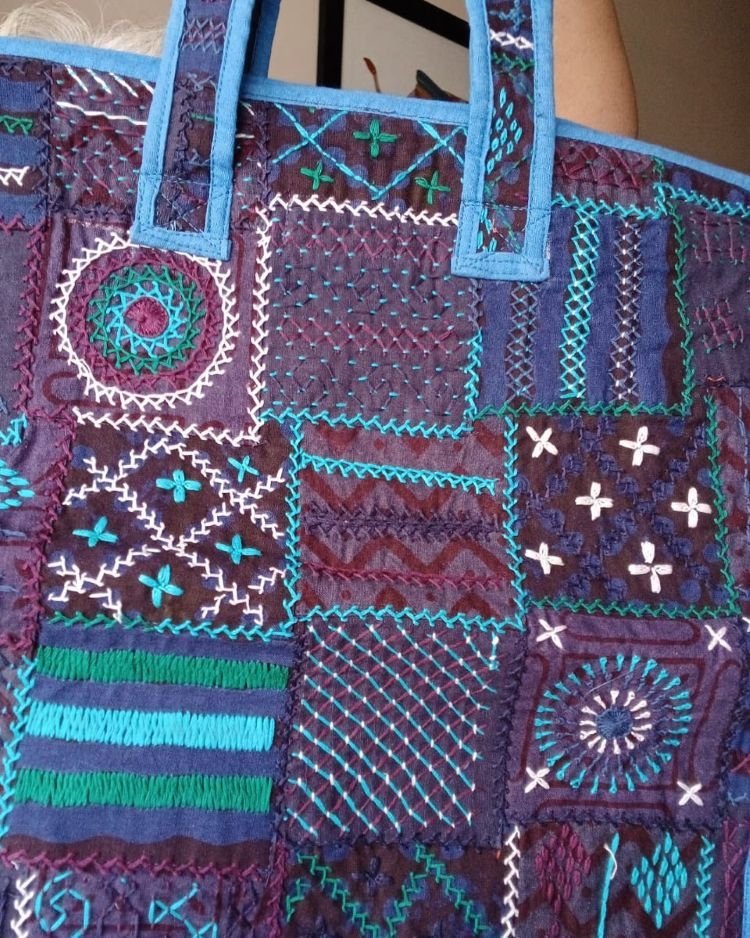 Boho Patchwork hand-embroidered large size tote bag. It has zip closure on the top, a zip pocket inside, and a zip pocket outside.