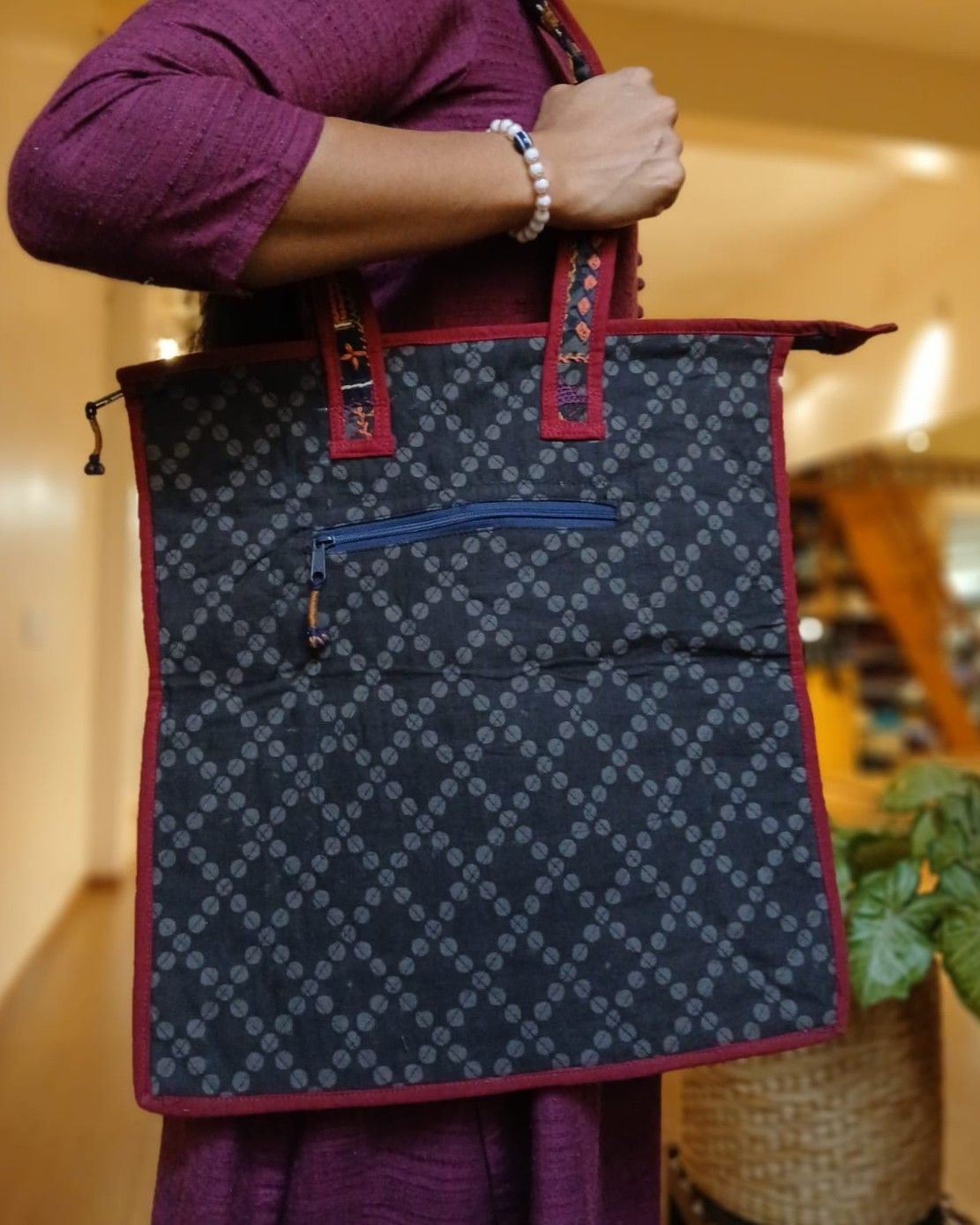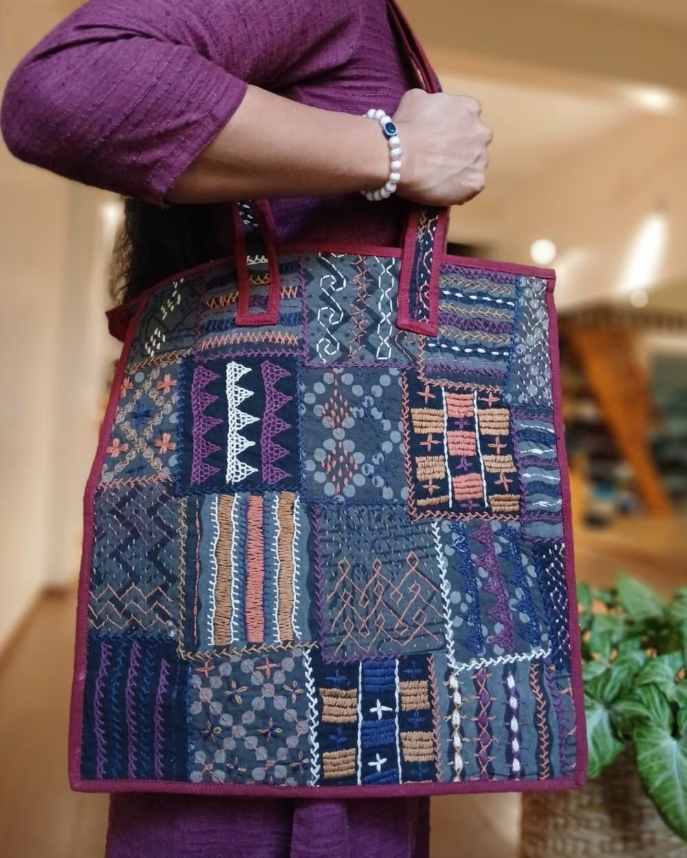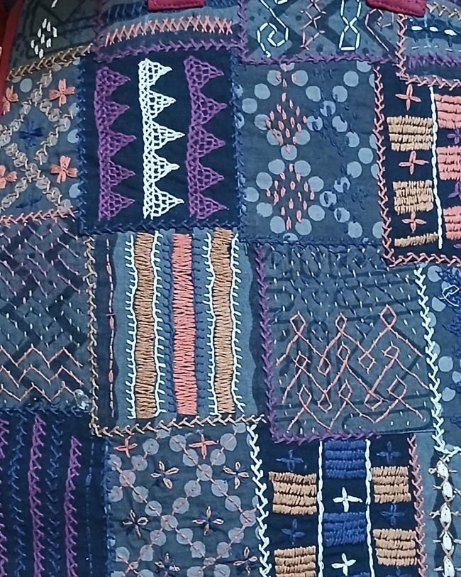 Boho Patchwork hand-embroidered large size tote bag.