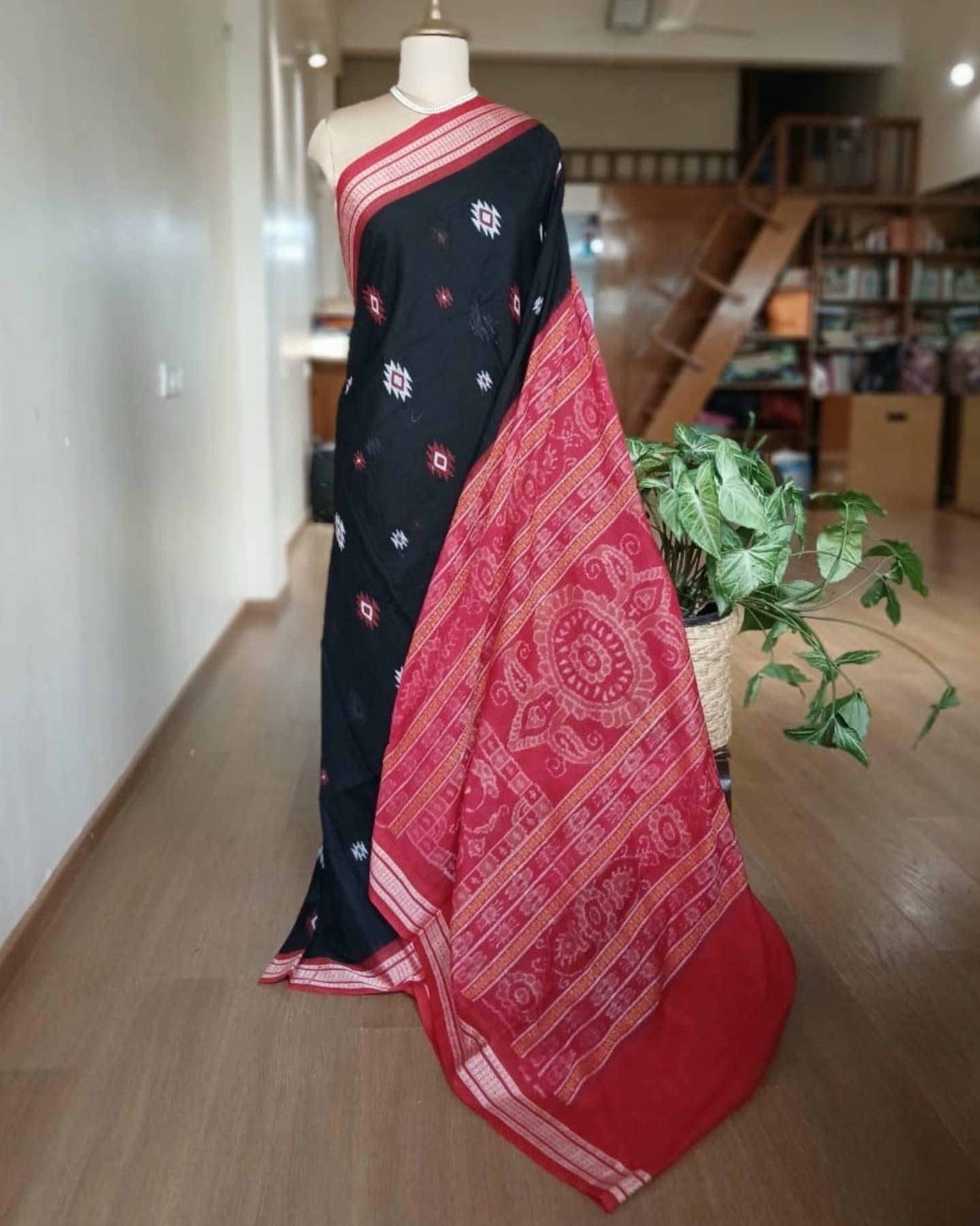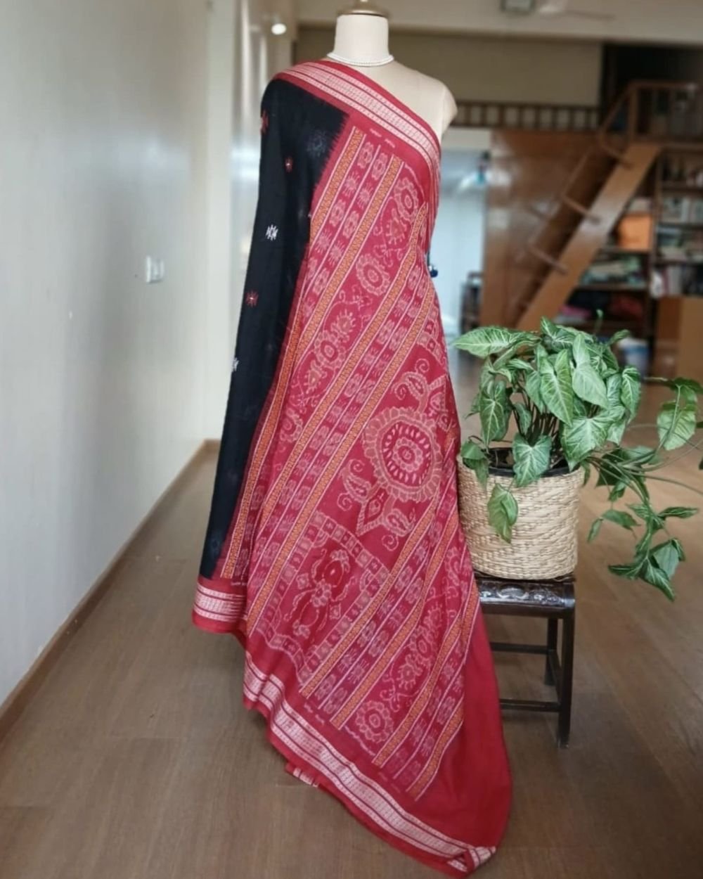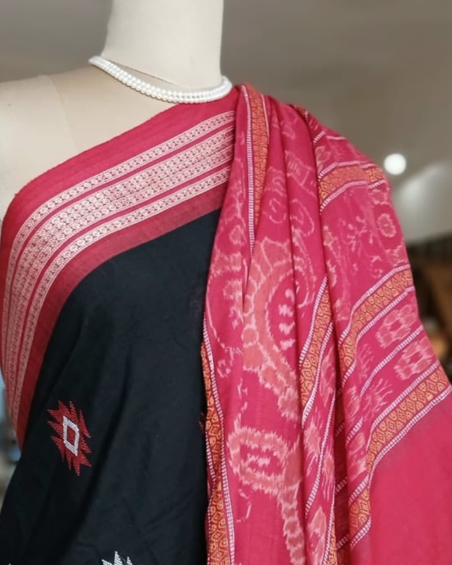 Sonepuri Bomkai in beautiful contrast shades. This rich looking cotton saree is handwoven in Sonepur, Odisha, with contrast borders and a typically intricate pallu with ikat work. The body of the saree is characterised by extra weft thread motifs/patterns.