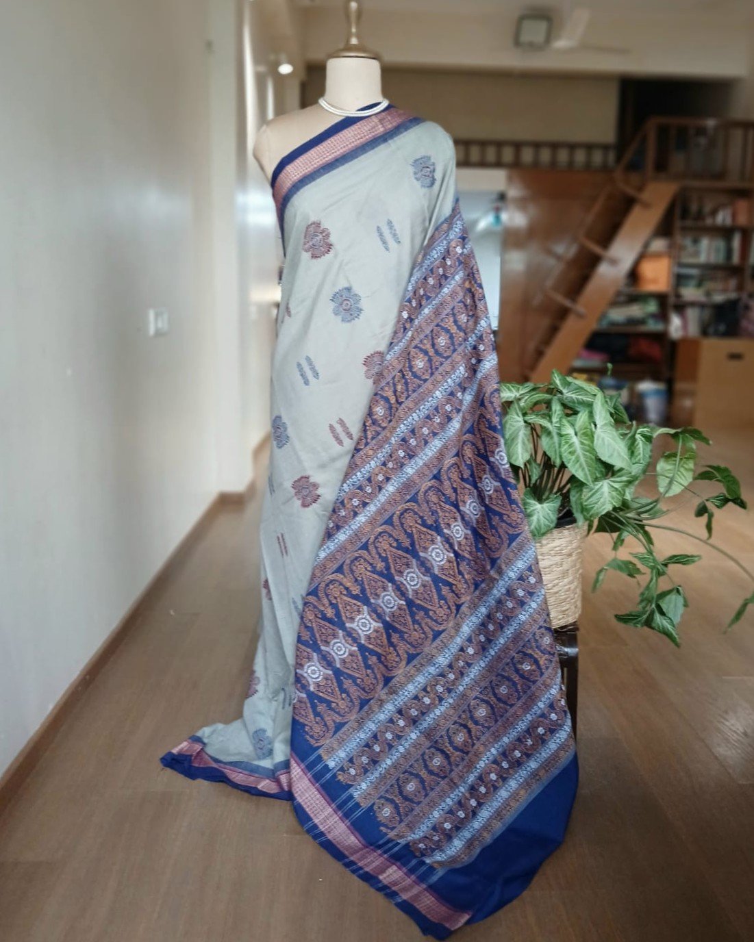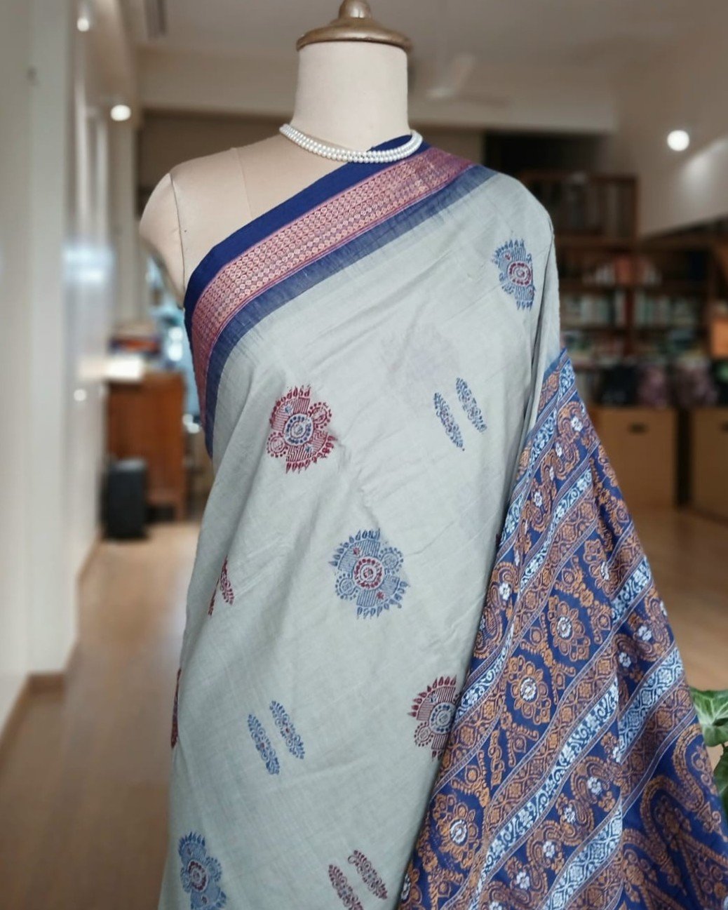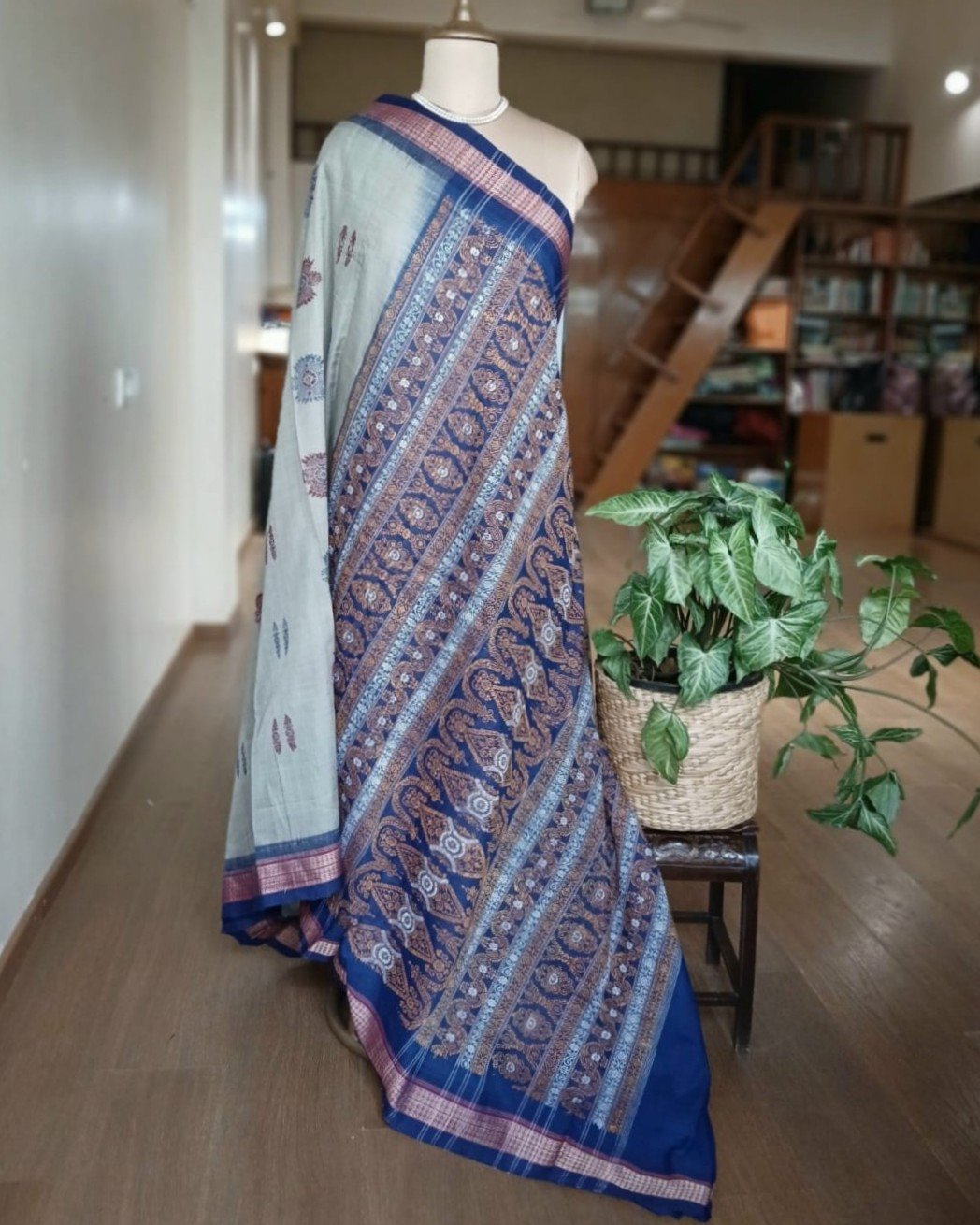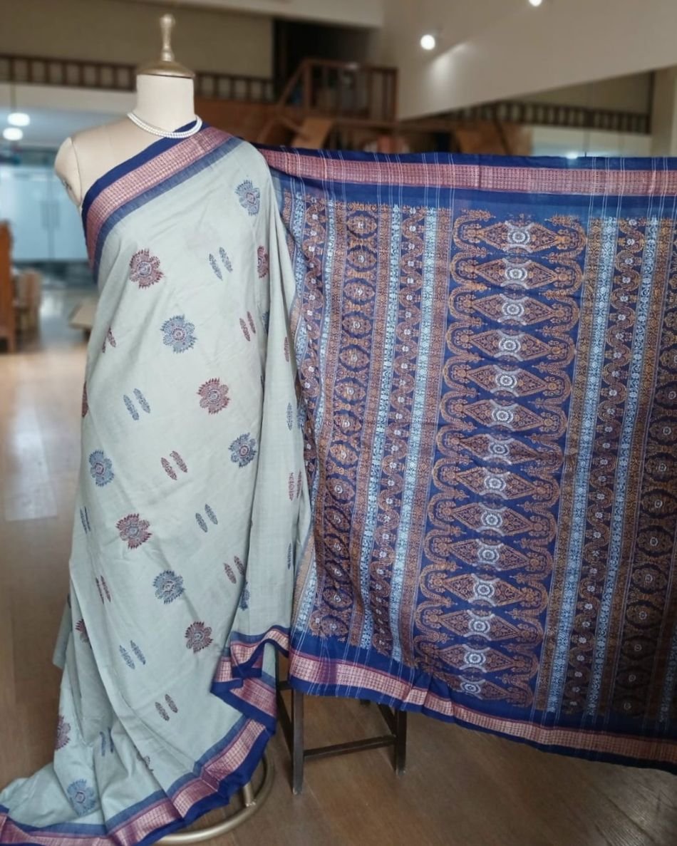 Sonepuri Bomkai in beautiful contrast shades. This rich looking cotton saree is handwoven in Sonepur, Odisha, with contrast borders and a typically intricate pallu with ikat work. The body of the saree is characterised by extra weft thread motifs/patterns.