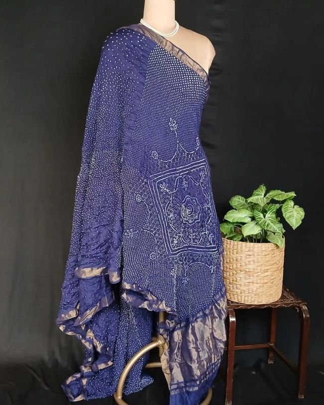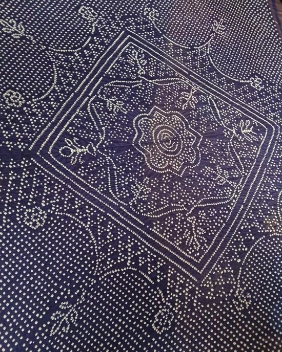 Collector’s Delight: Tussar Silk x Mulberry Silk saree with hand-tied Kutchi bandhani, dyed dark violet in azo-free colours. See more details below