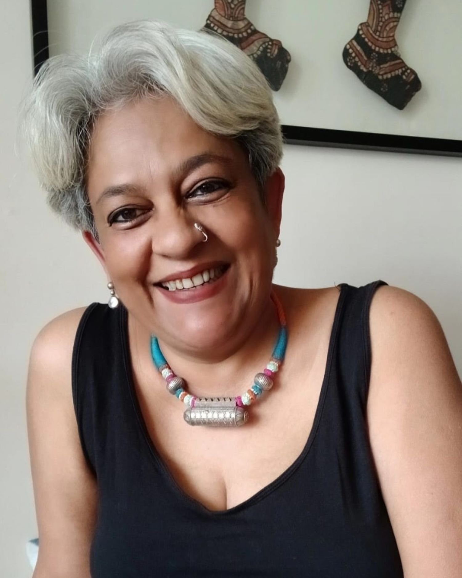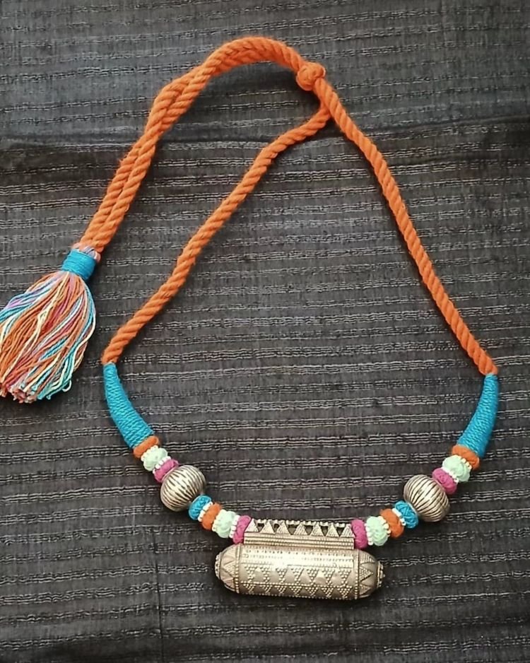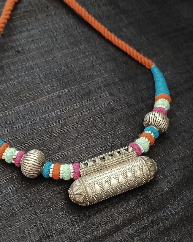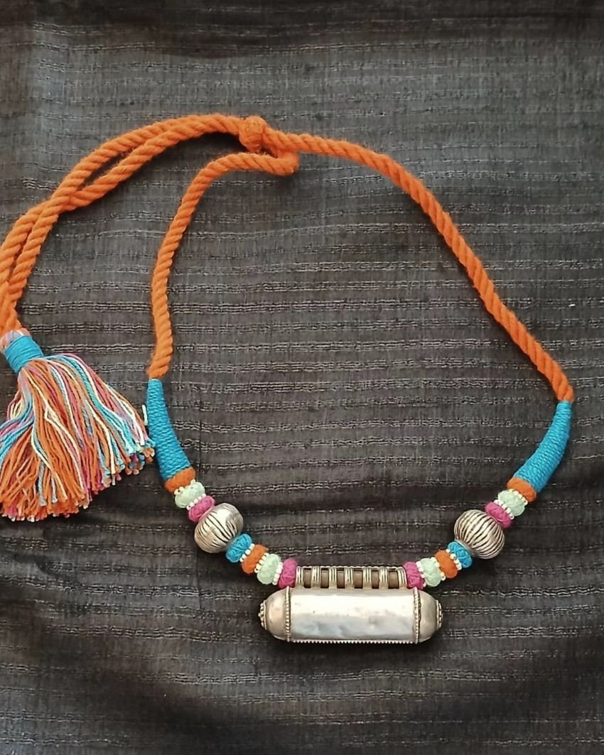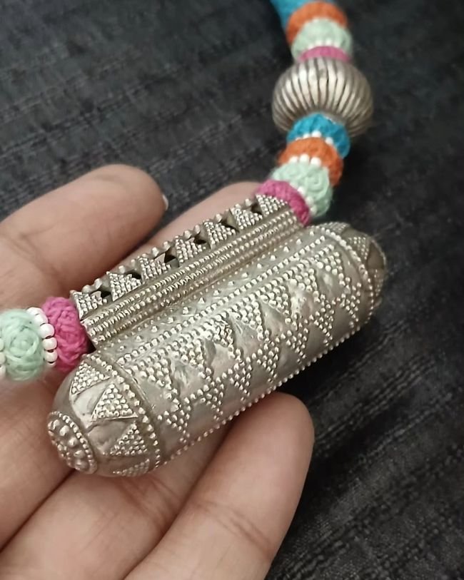Colourful Amulet Necklace in silver with Rawa work on the central pendant and silver beads.