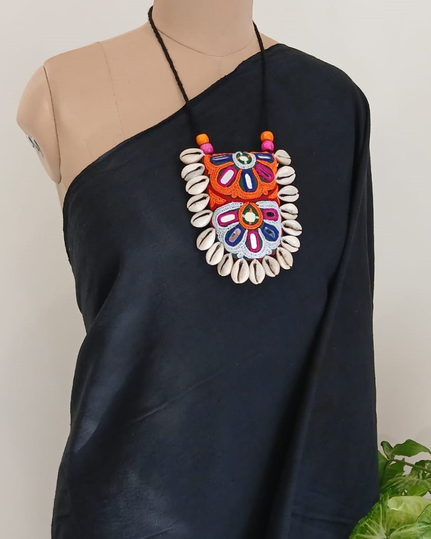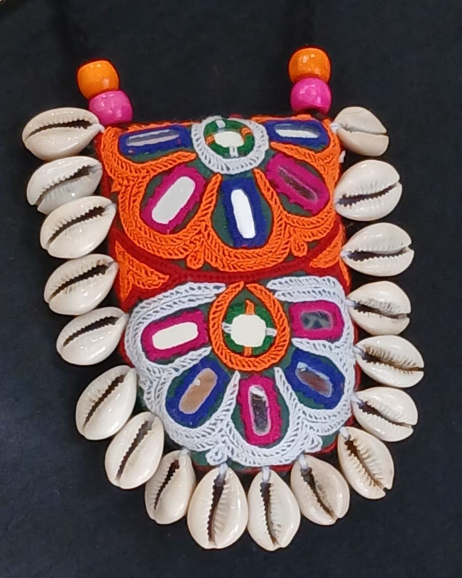 Colourful Meghwal Hand Embroidered necklace with Cowries, Mirrorwork and beads