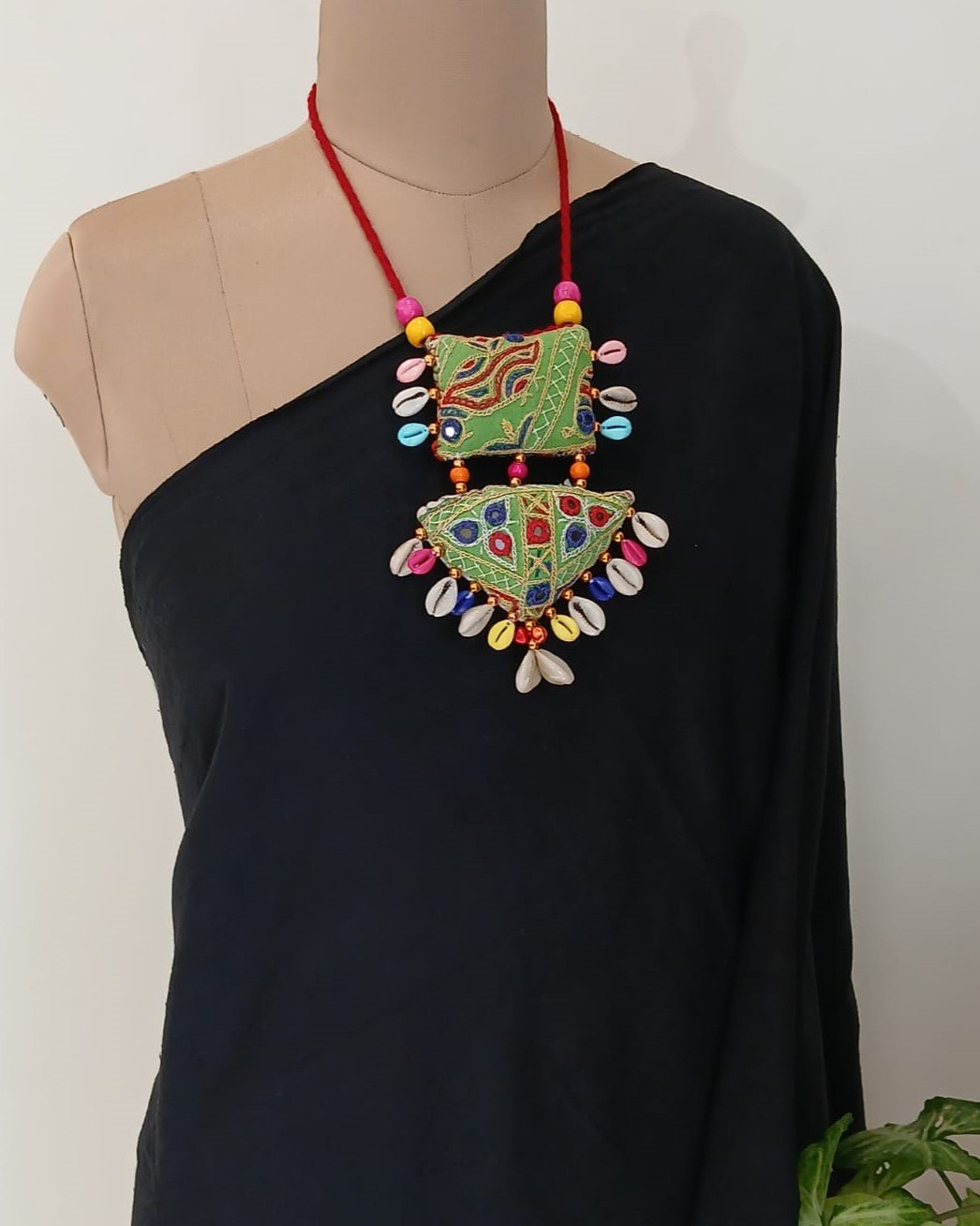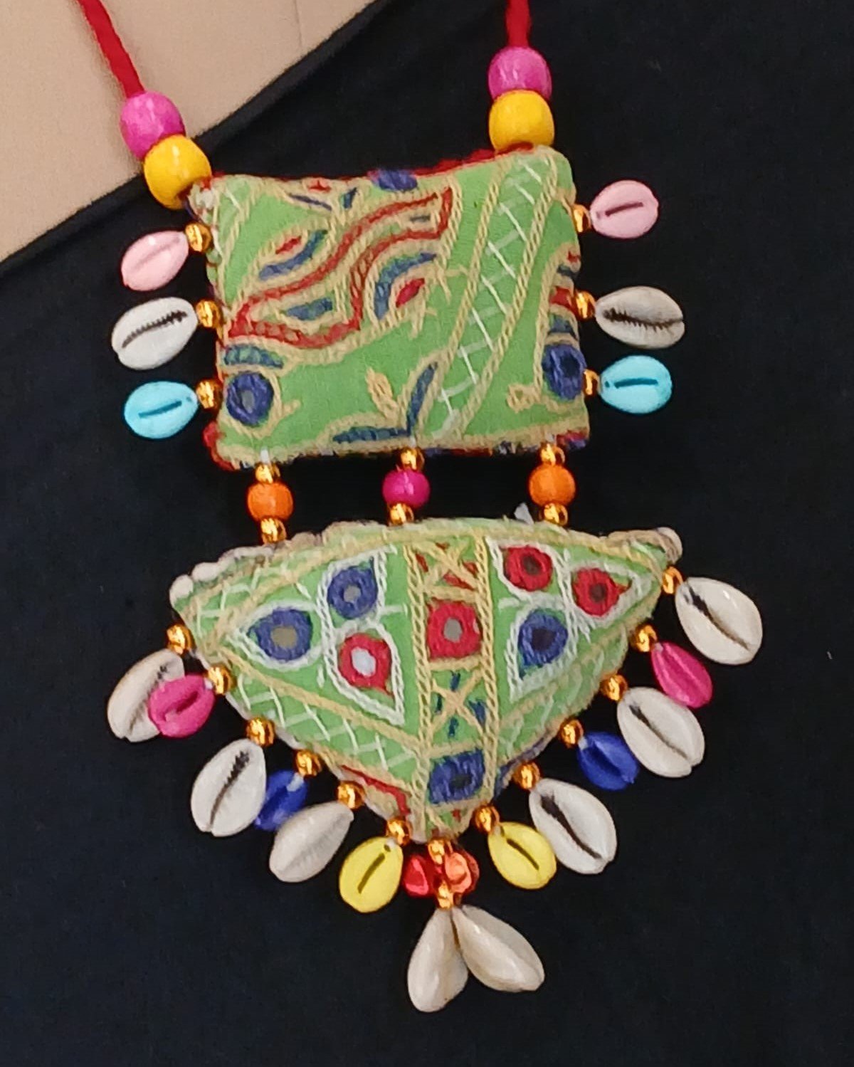 Colourful Meghwal Hand Embroidered necklace with Cowries, Mirrorwork and beads