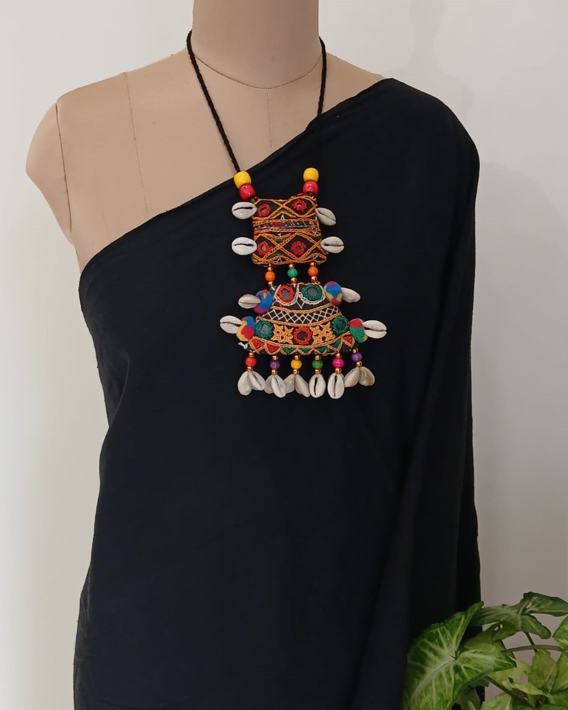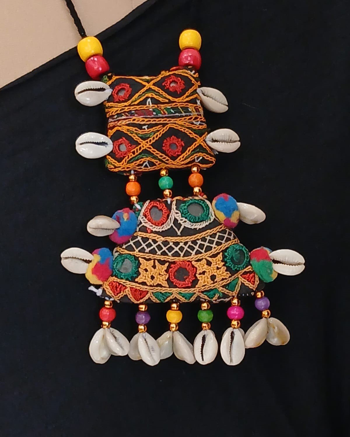 Colourful Meghwal Hand Embroidered necklace with Cowries, Mirrorwork and beads
