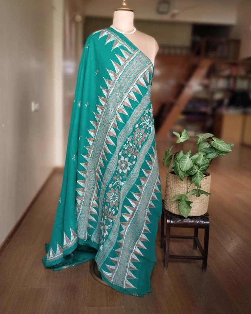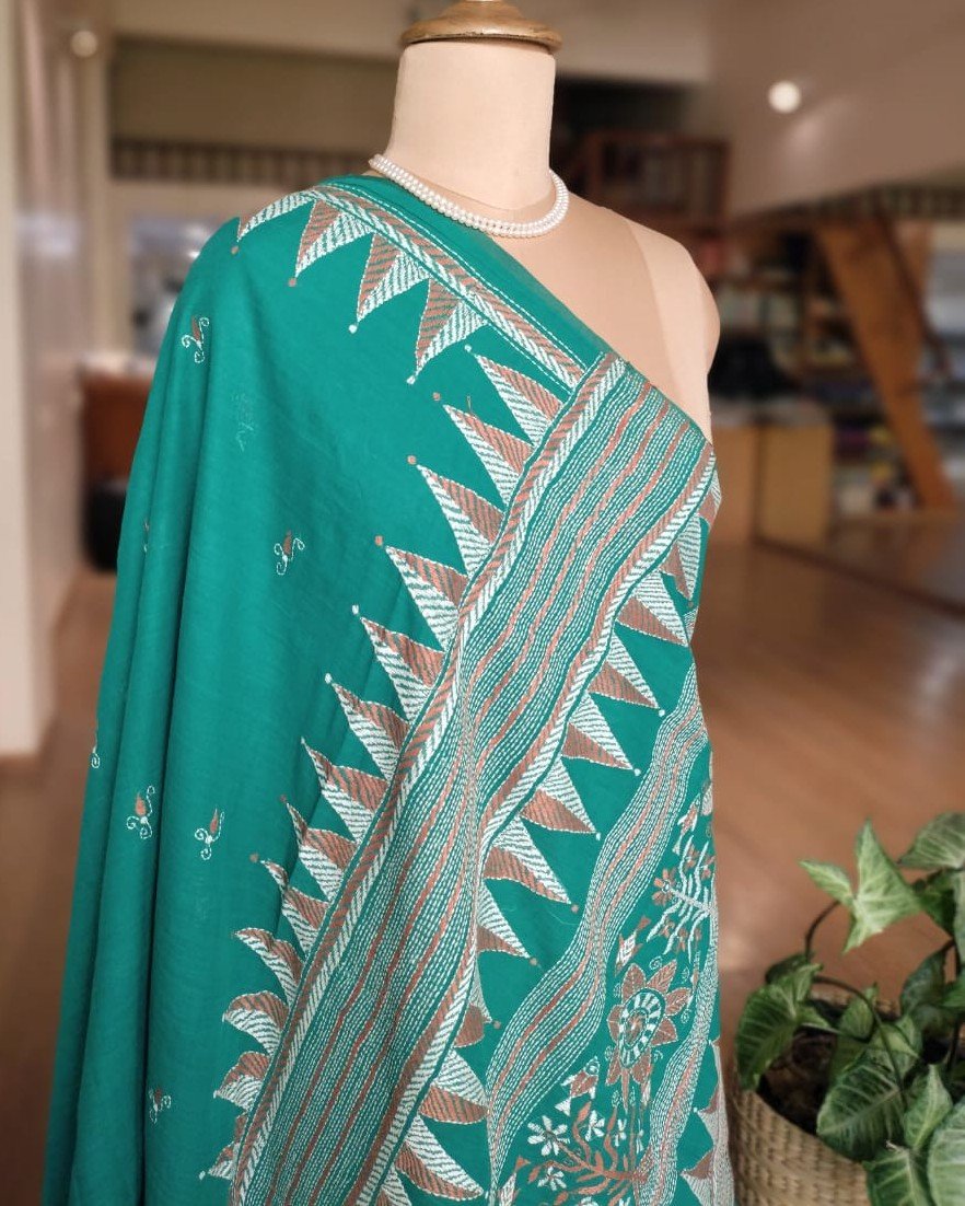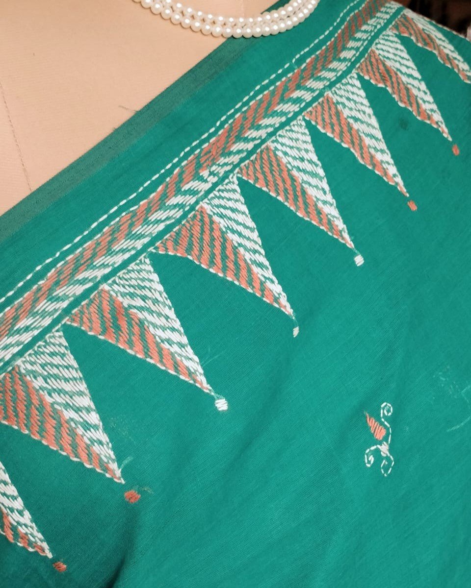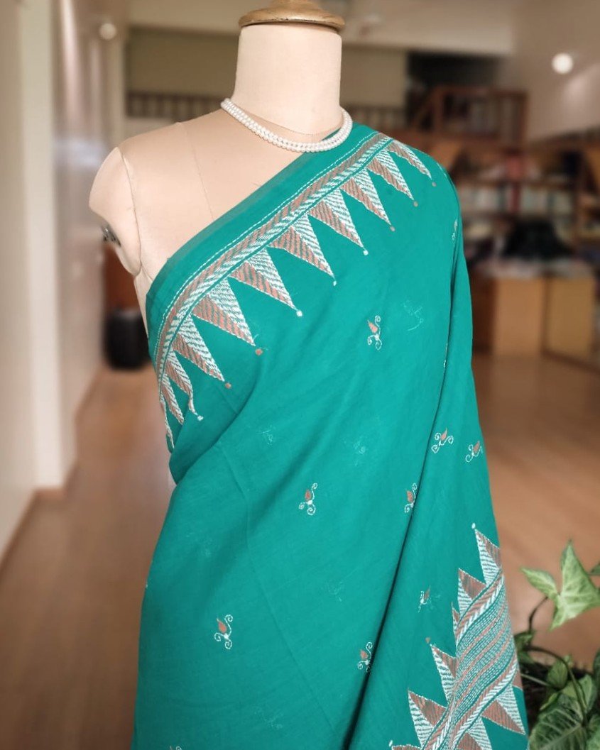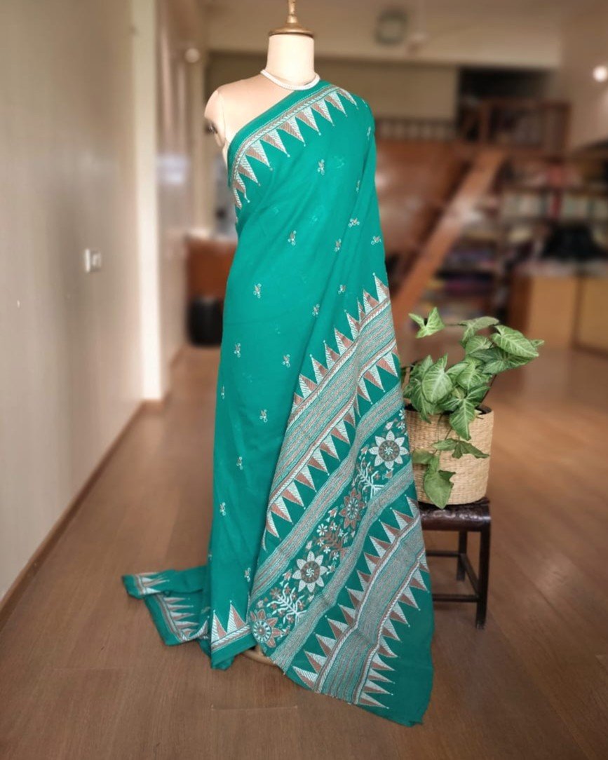 Beautiful kantha hand embroidery done in Santiniketan, on soft cotton saree woven in Dhonekhali.