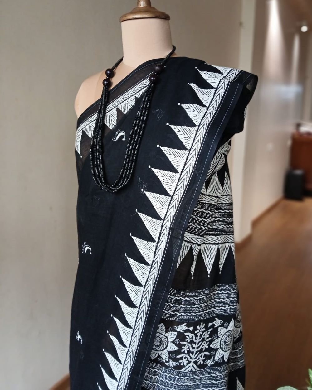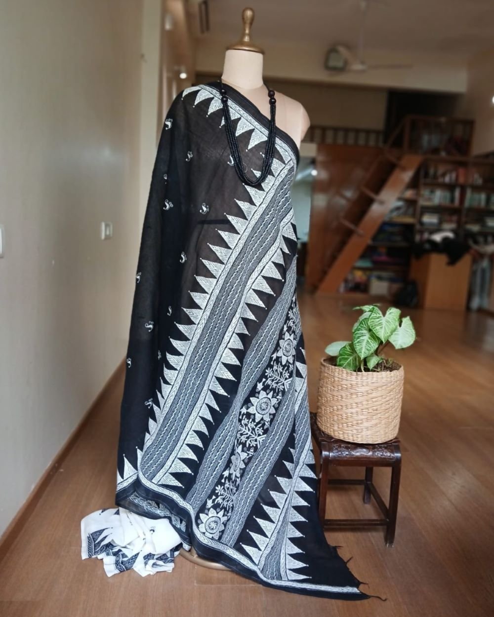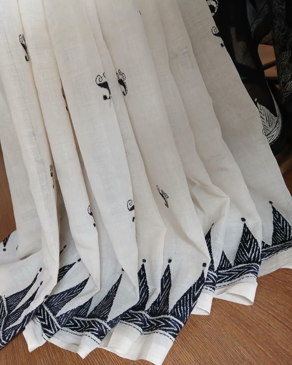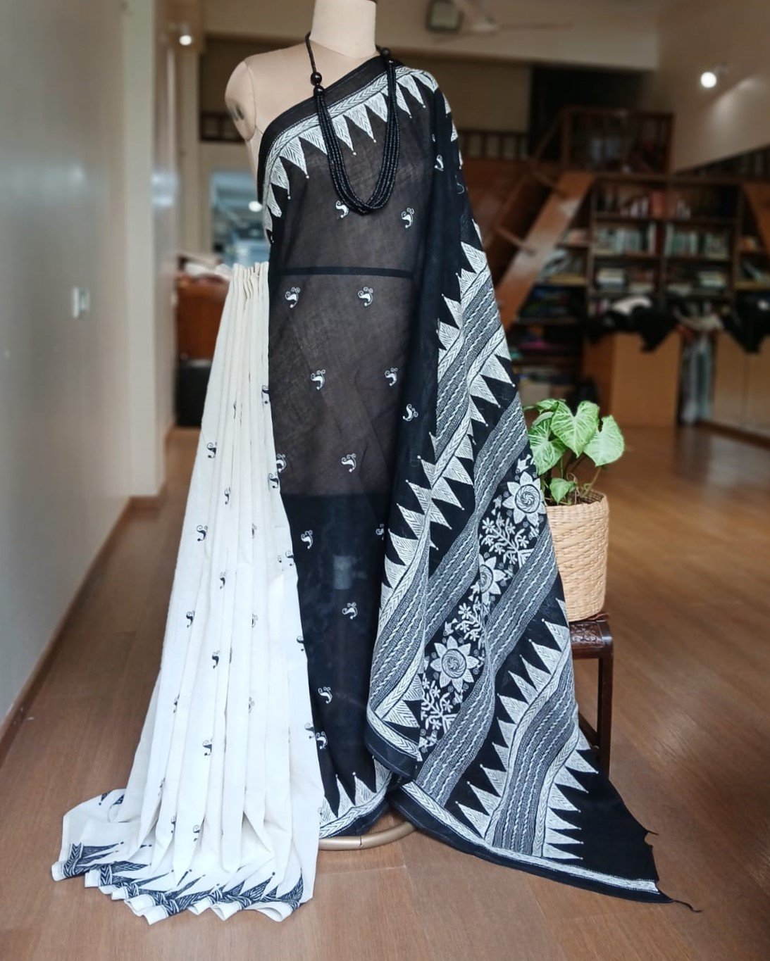 Hand embroidery done in Santiniketan, on soft cotton saree woven in Dhonekhali.