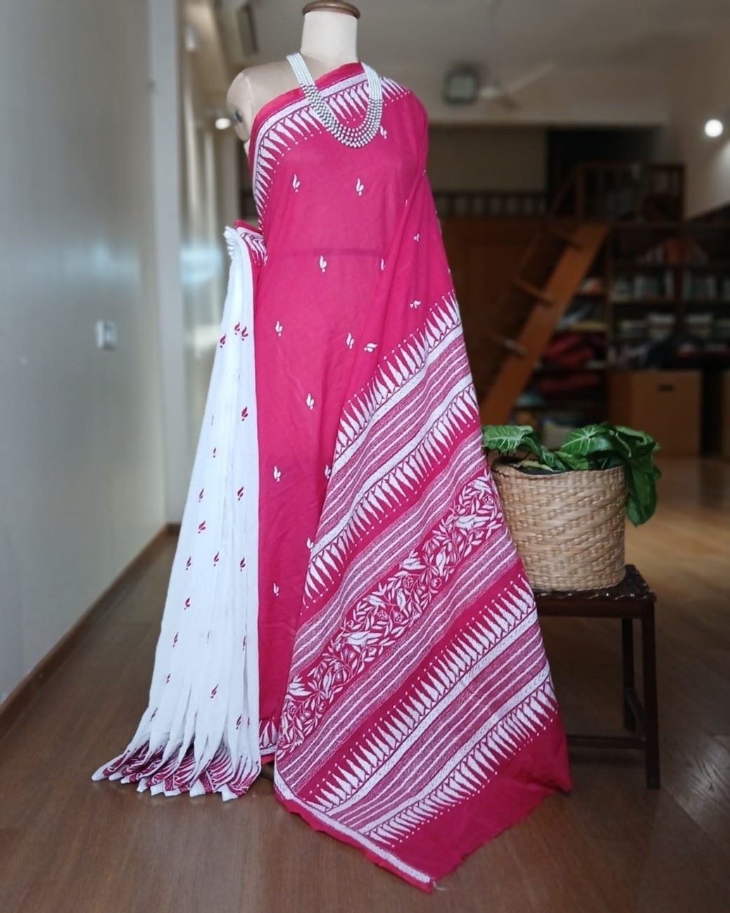 Hand embroidery done in Santiniketan, on soft cotton saree woven in Dhonekhali.