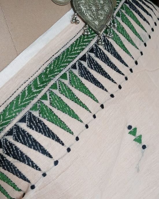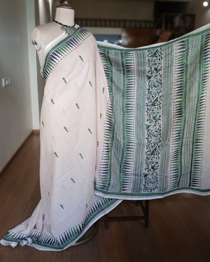 Beautiful kantha hand embroidery done in Santiniketan, on soft cotton saree woven in Dhonekhali.