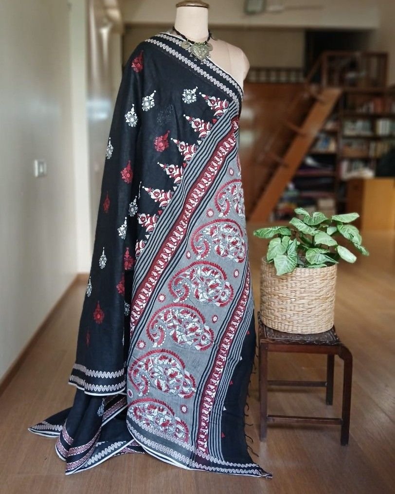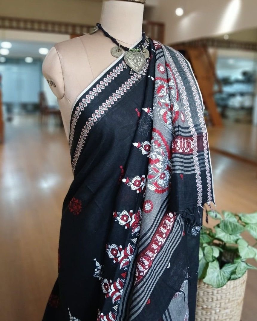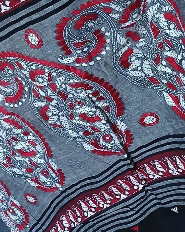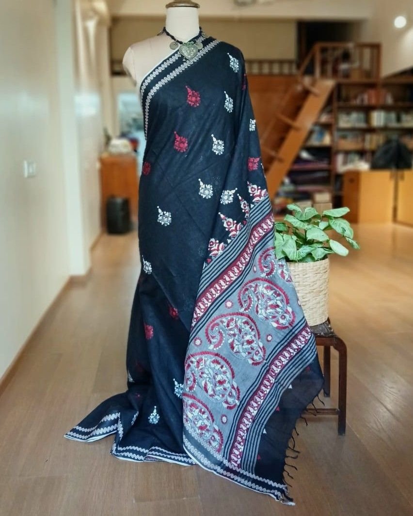Beautiful kantha hand embroidery done in Santiniketan, on soft cotton saree woven in Dhonekhali.