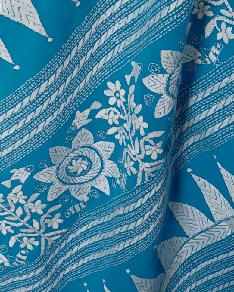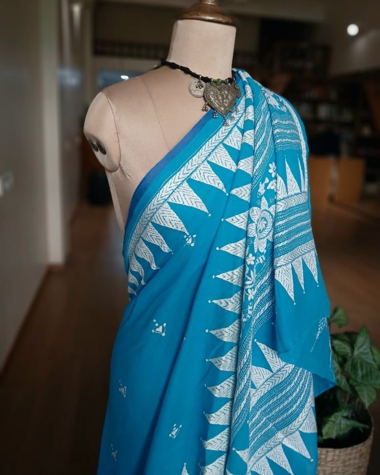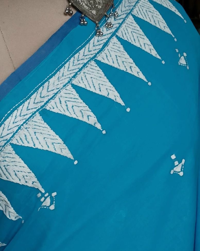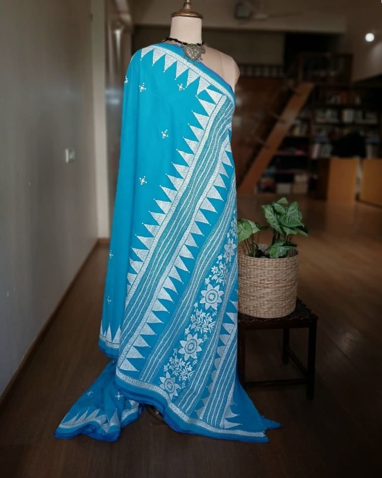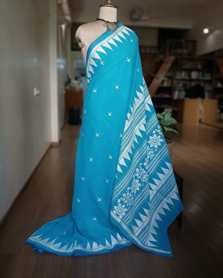 Beautiful kantha hand embroidery done in Santiniketan, on soft cotton saree woven in Dhonekhali.