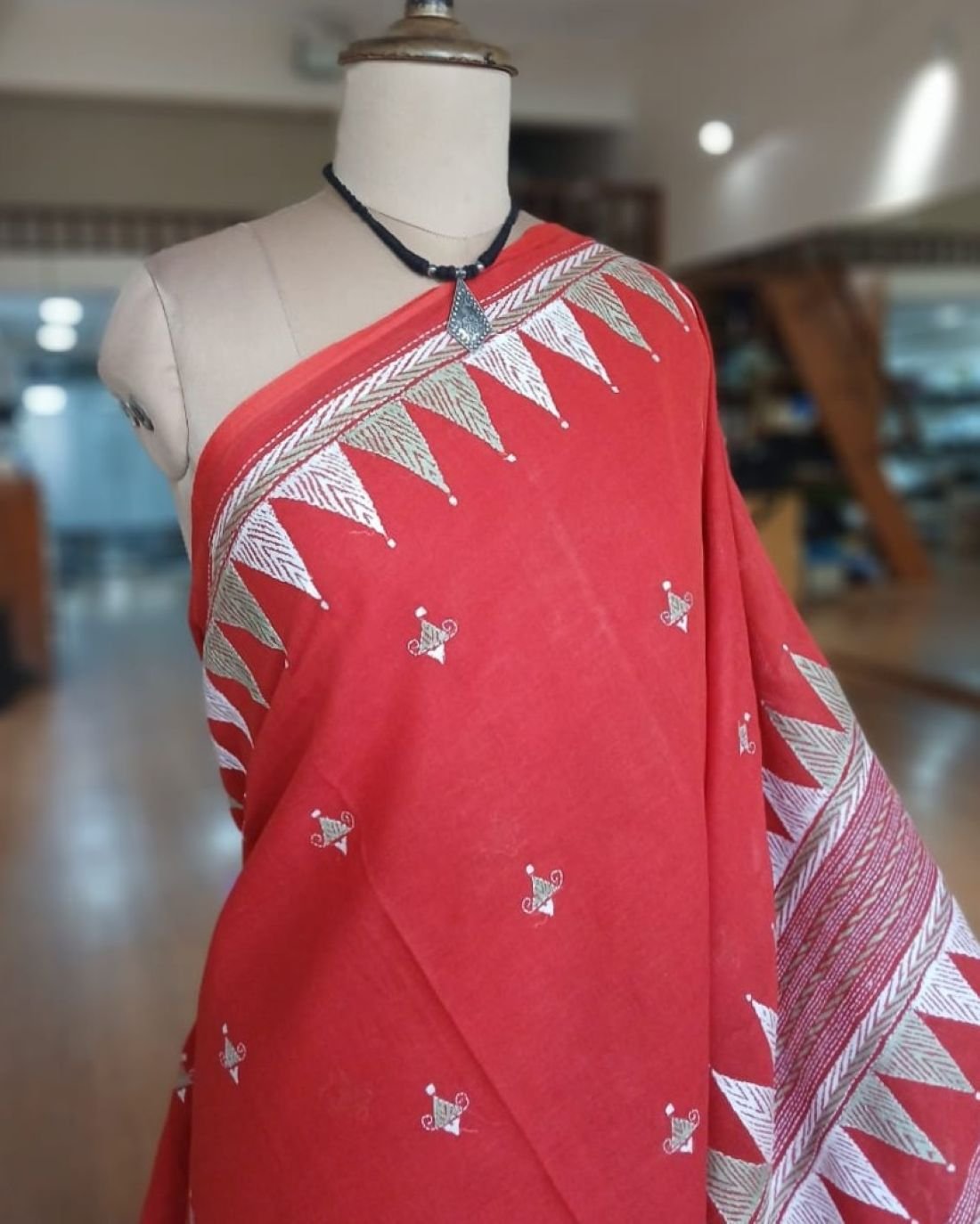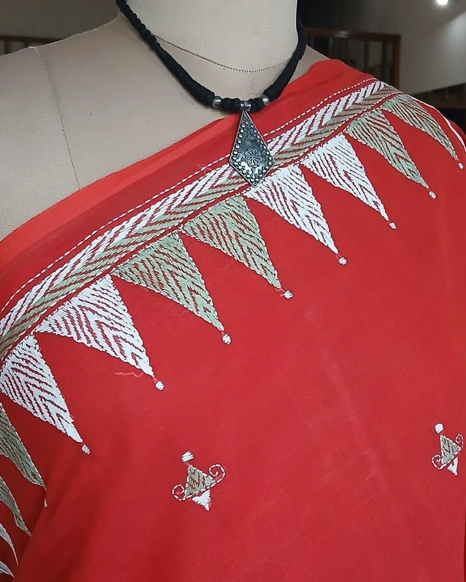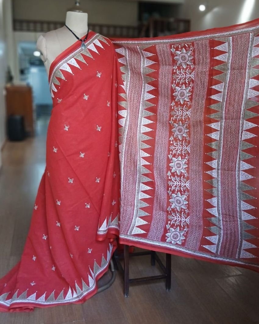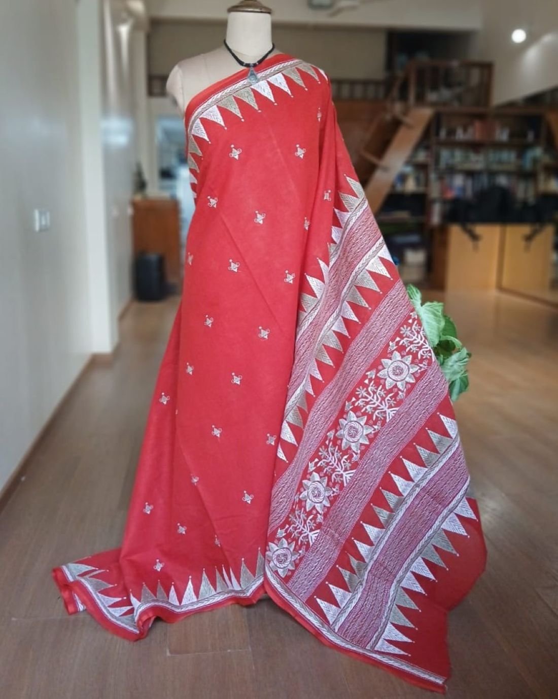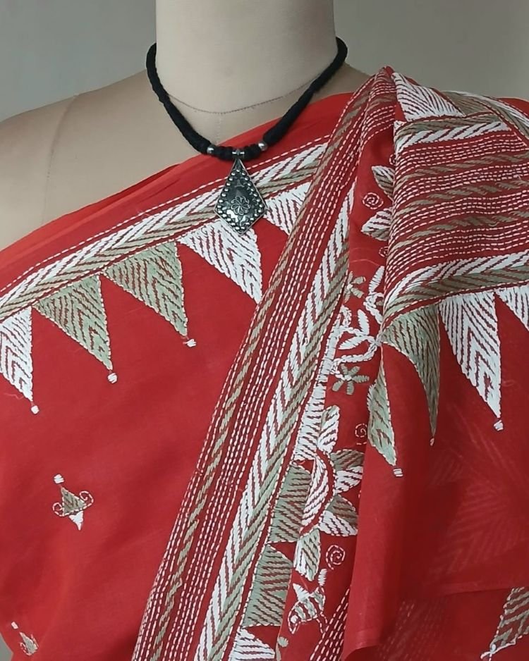 Beautiful kantha hand embroidery done in Santiniketan, on soft cotton saree woven in Dhonekhali.