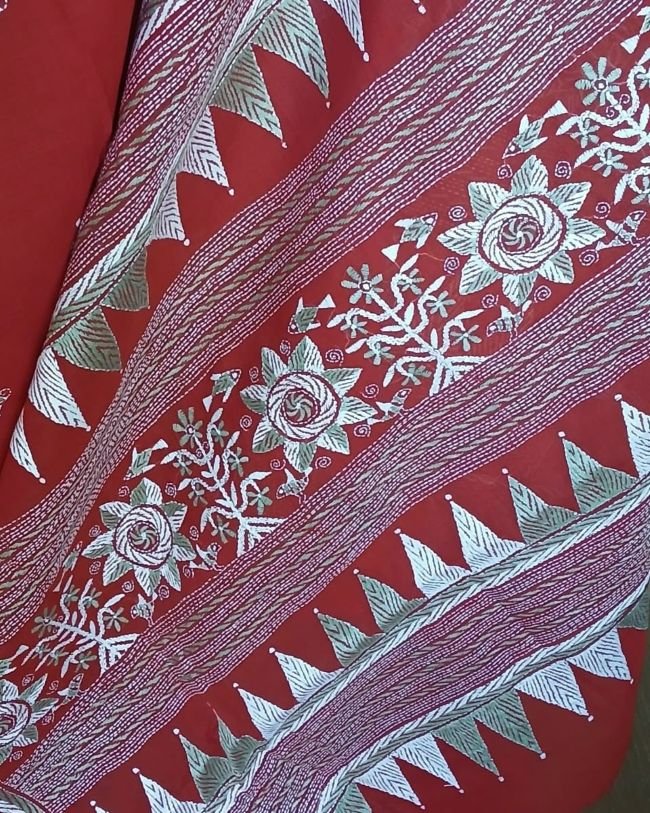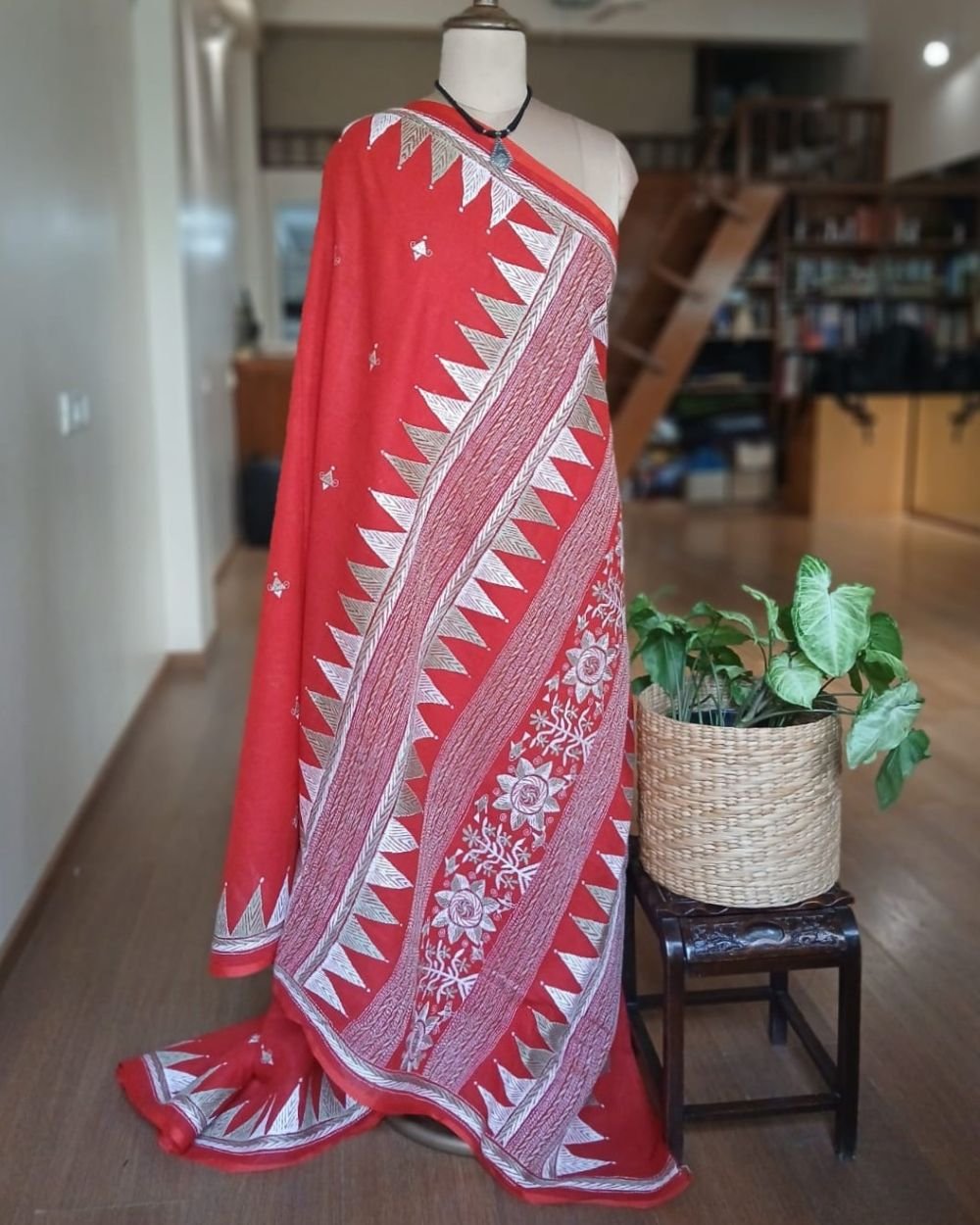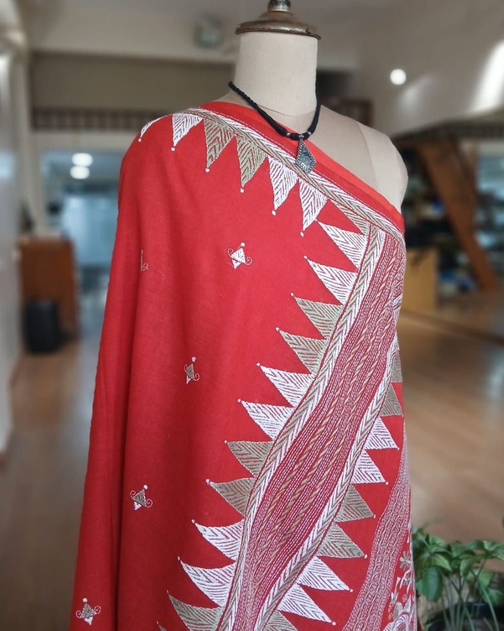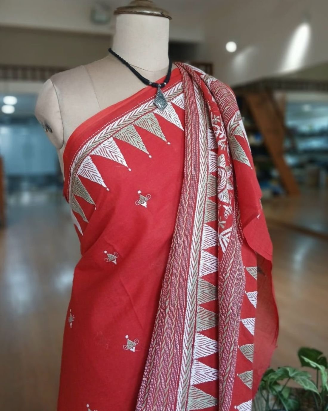 Beautiful kantha hand embroidery done in Santiniketan, on soft cotton saree woven in Dhonekhali.