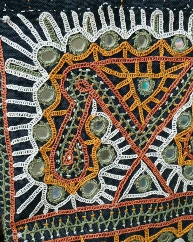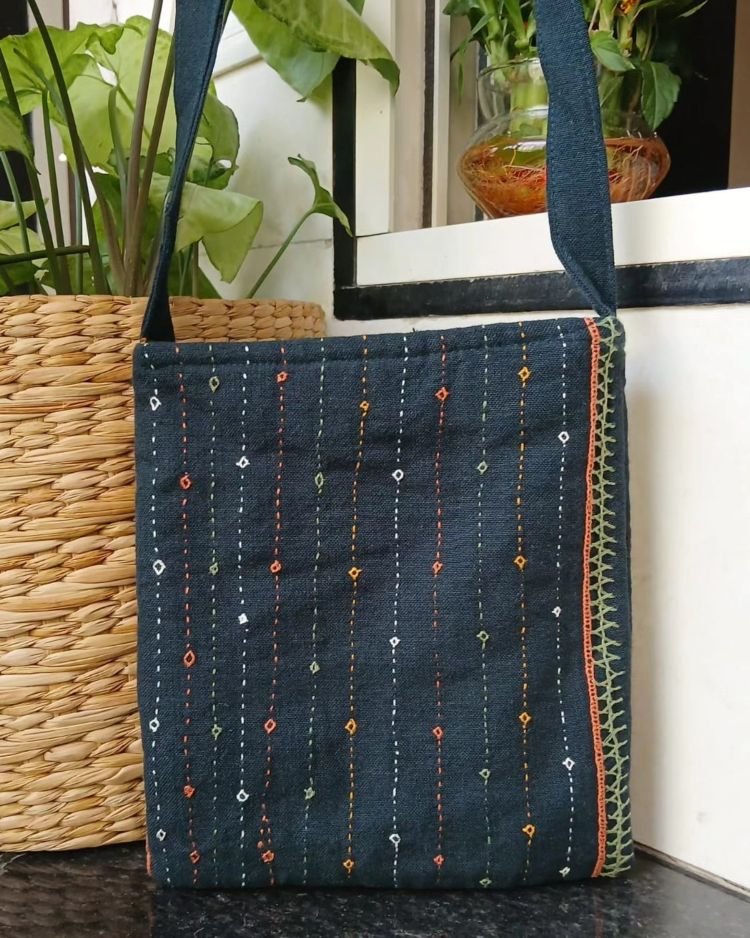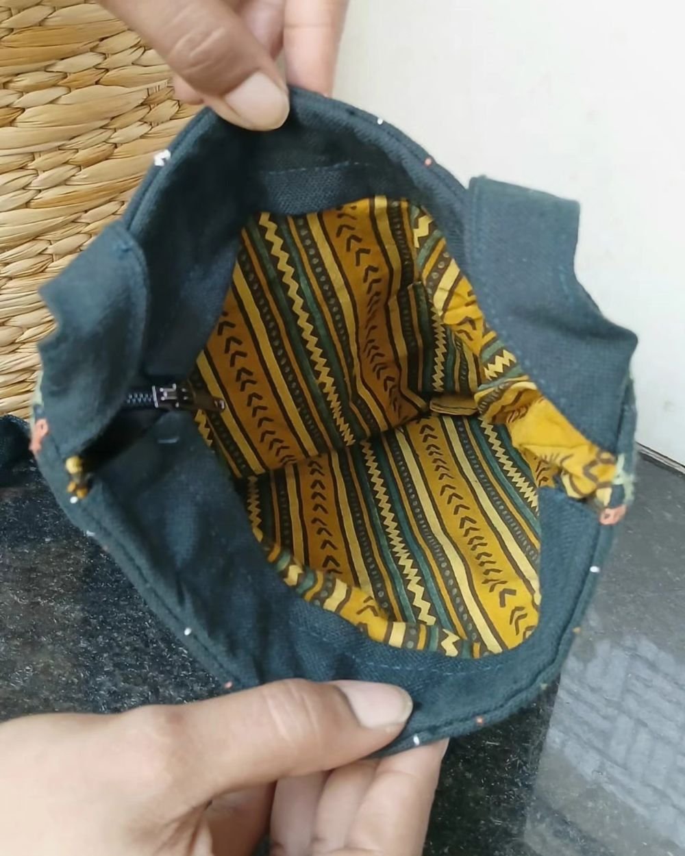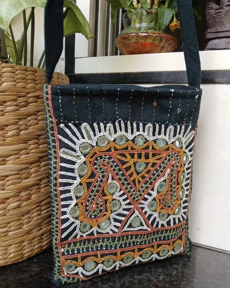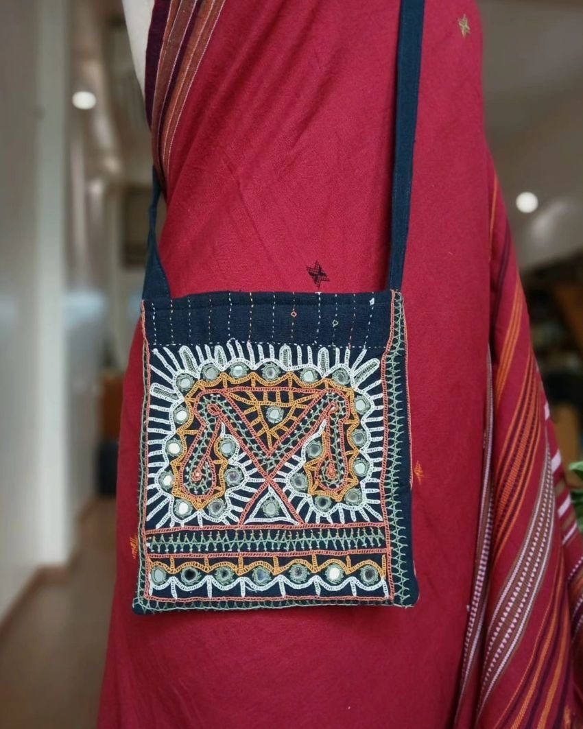 Dhebariya Rabari Embroidered Sling bag from Kutch. These are made by Rabari women in Sumrasar, supported by the non-profit Kala Raksha. Can hold cell phone, coin purse, and other small items. Great for your morning walks! And perfect for gifting. It has a cotton base with Ajrakh inner lining. There is a zip closure and a cotton strap.