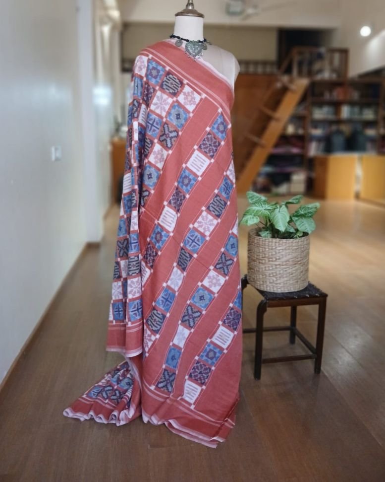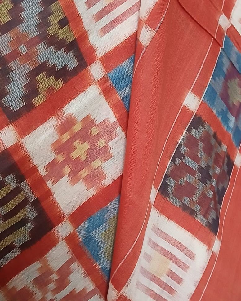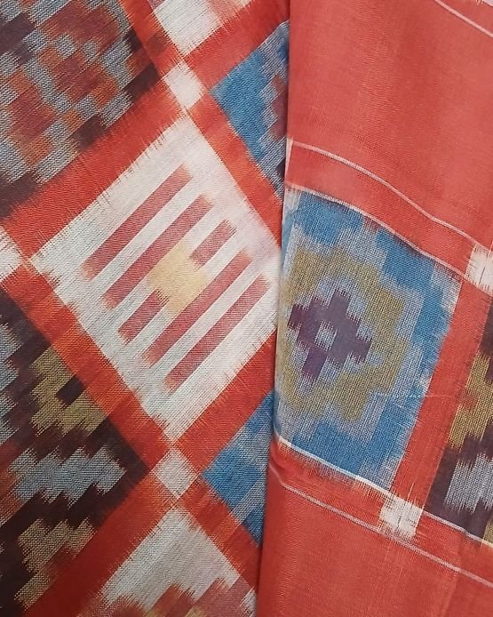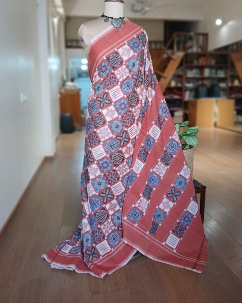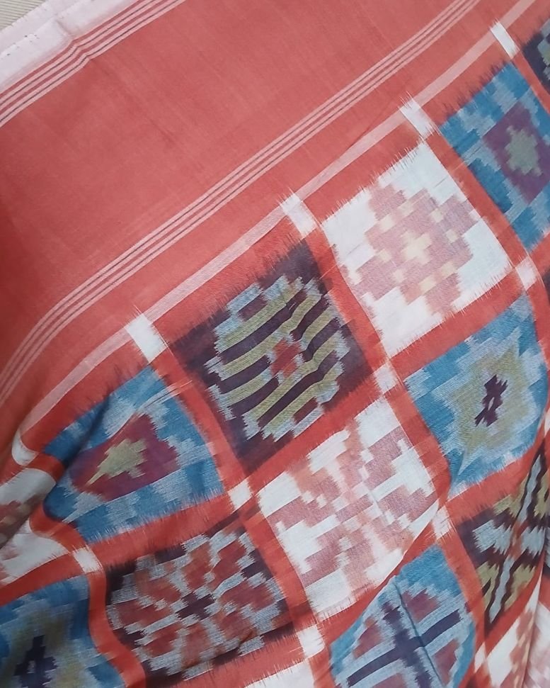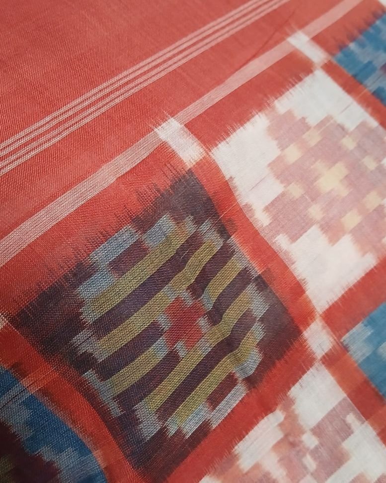 Double Ikat Natural Dyes Cotton Handweave Saree from Koyyalagudem in Telangana. It’s a 9 motif multi-colour saree with very skilled tie-dye ikat. On the palla these 9 motifs have been laid out in striking banded rows highlighted by plain rust colour. There is a plain rust blouse providing soothing relief from the complex saree design.