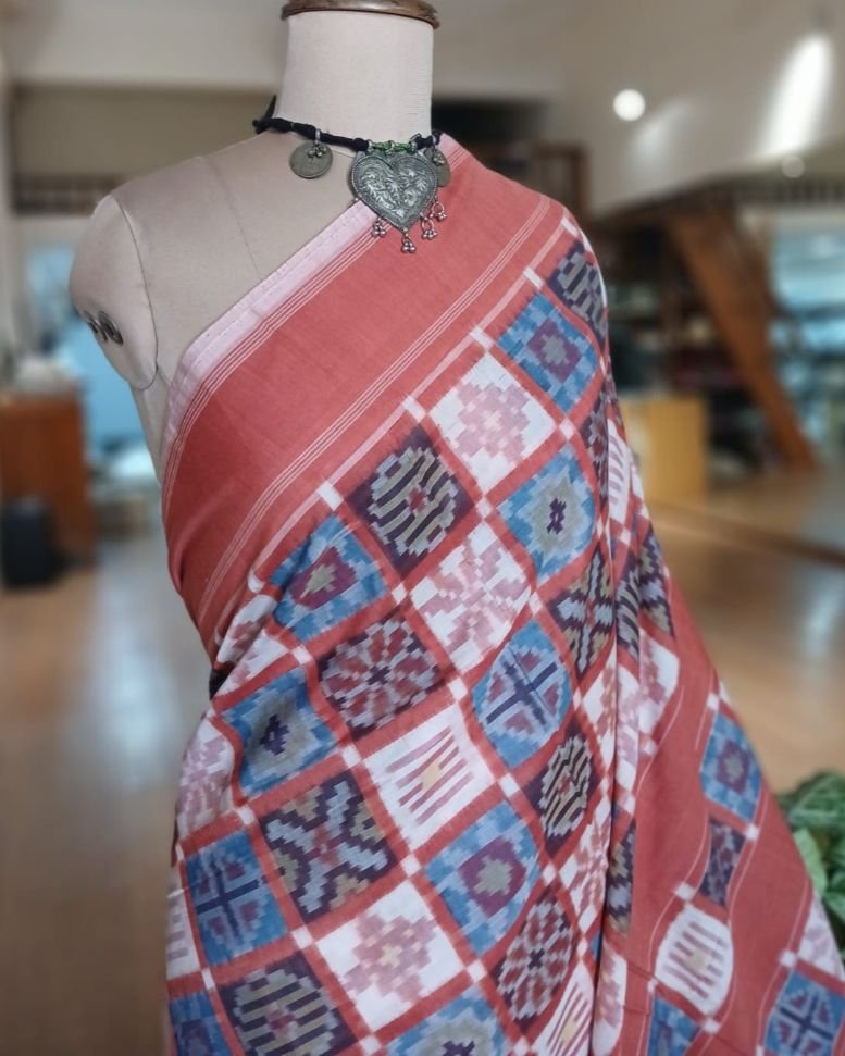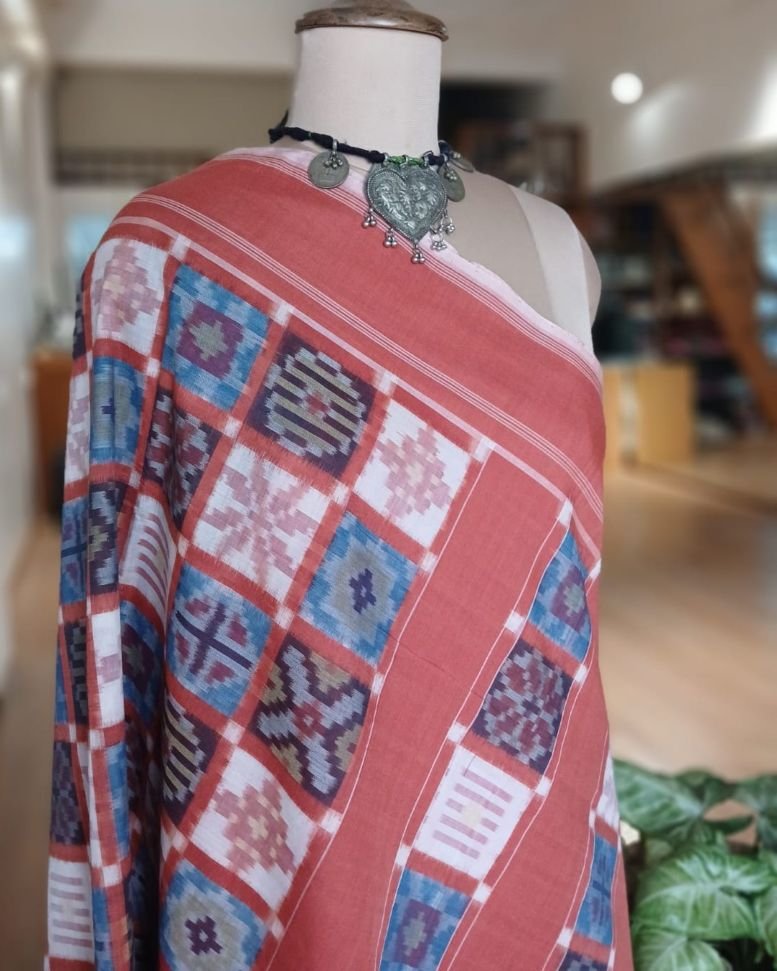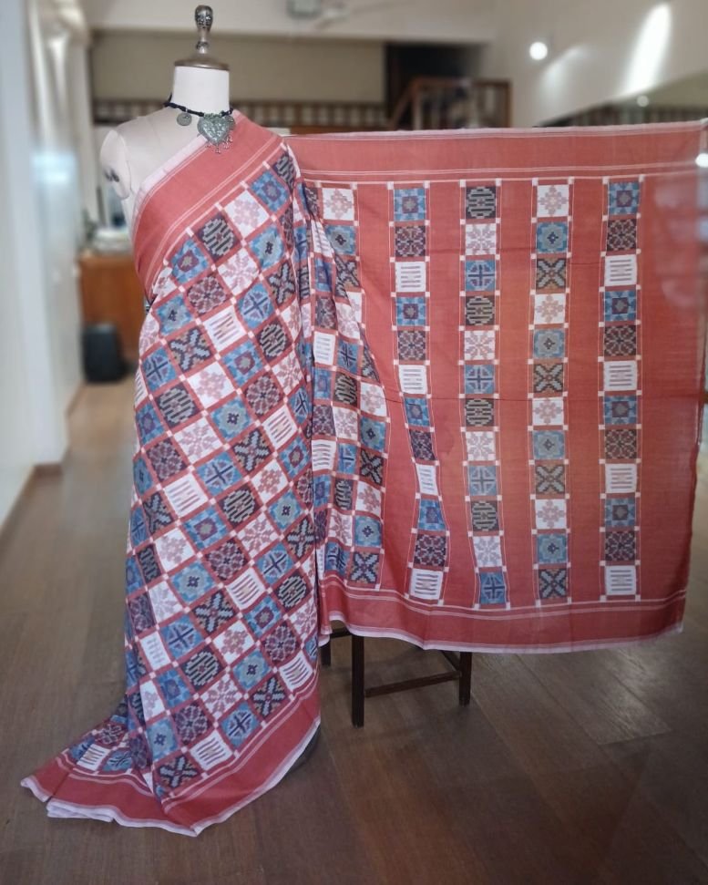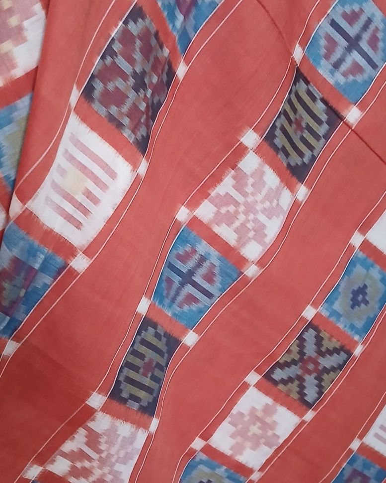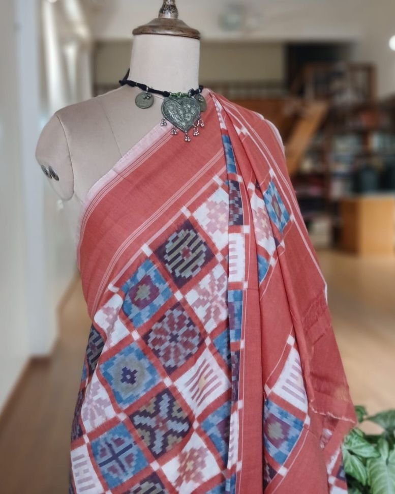 Double Ikat Natural Dyes Cotton Handweave Saree from Koyyalagudem in Telangana. It’s a 9 motif multi-colour saree with very skilled tie-dye ikat. On the palla these 9 motifs have been laid out in striking banded rows highlighted by plain rust colour. There is a plain rust blouse providing soothing relief from the complex saree design.