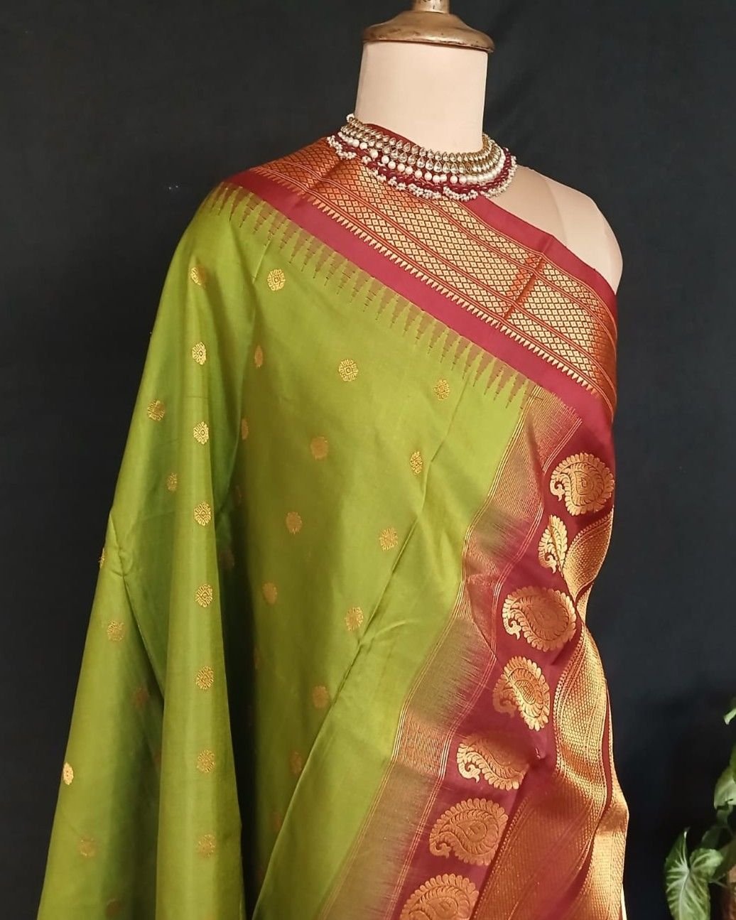 Gadwal handweave silk saree in golden leaf green with kuttu borders in maroon, zari buttis and grand maroon palla. See more details below