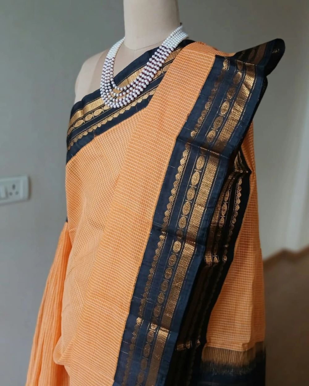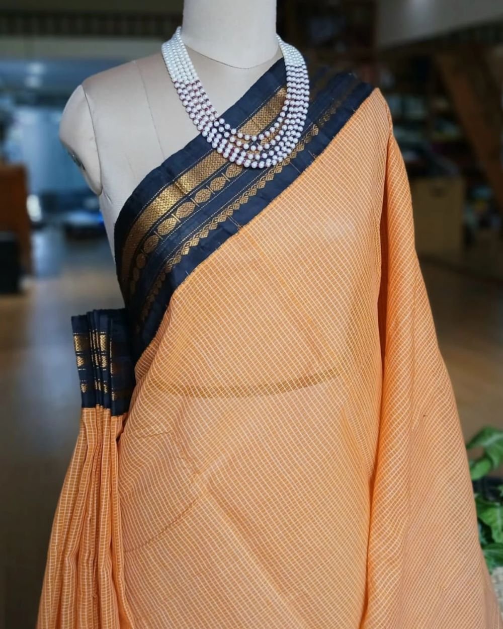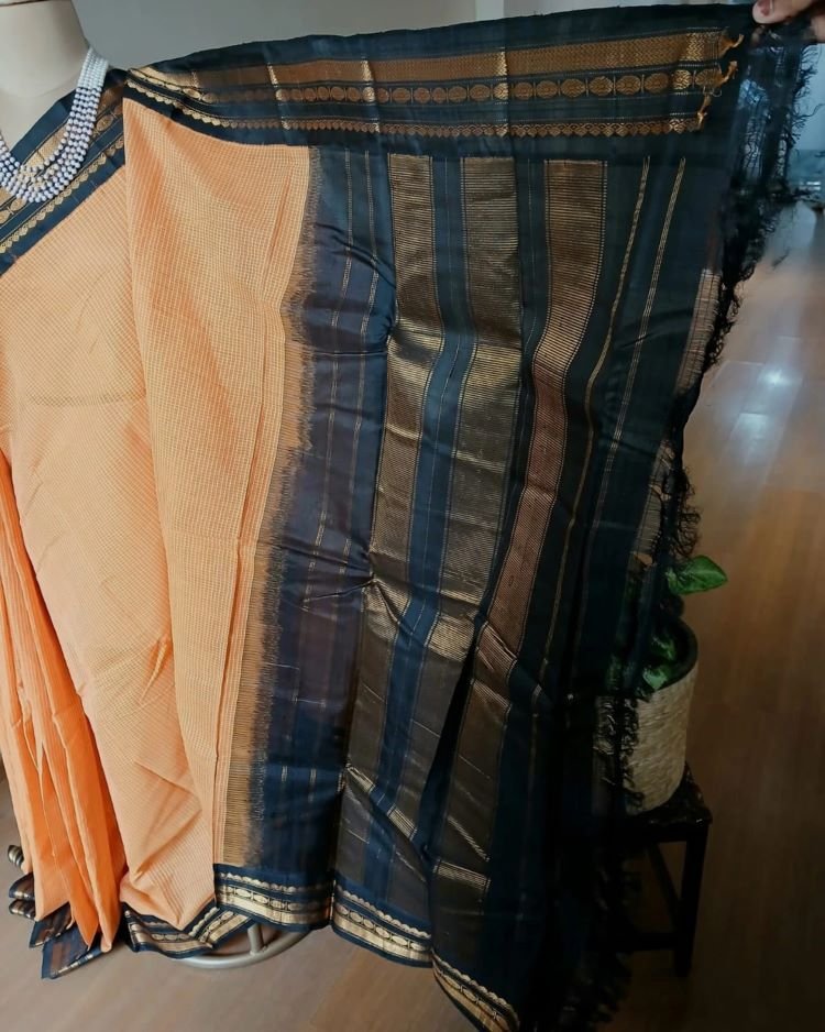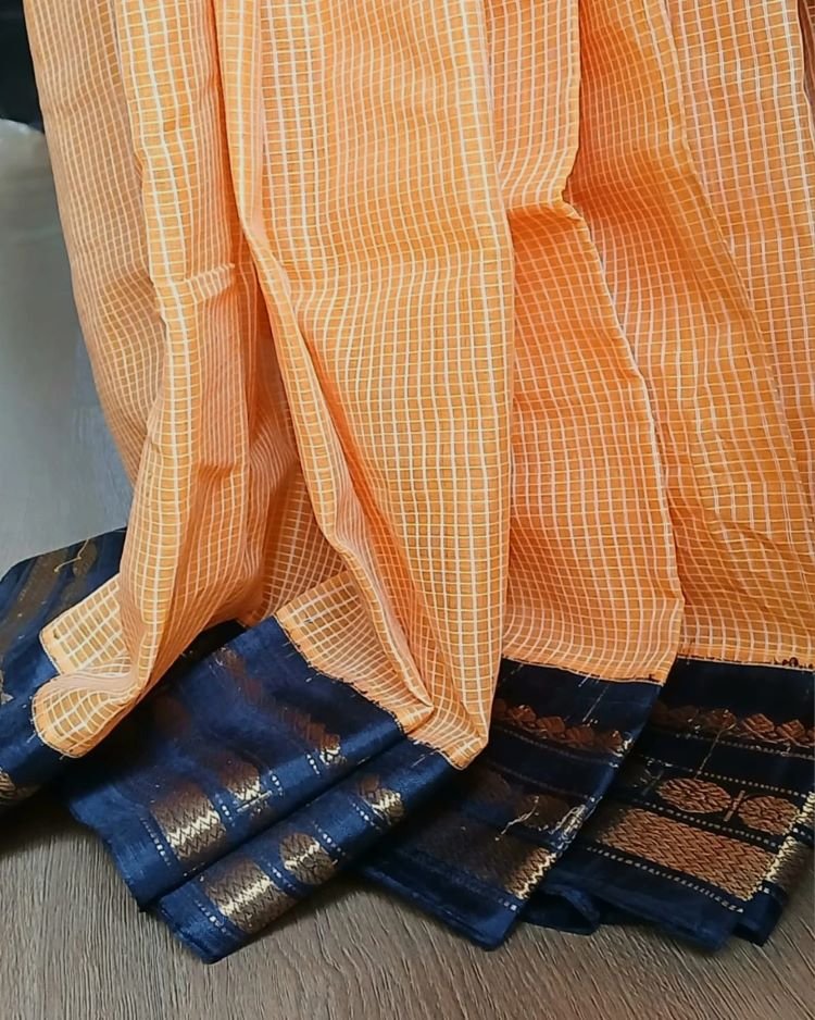Gadwal Kuttu technique handweave saree with checked cotton body, silk border, and silk palla.