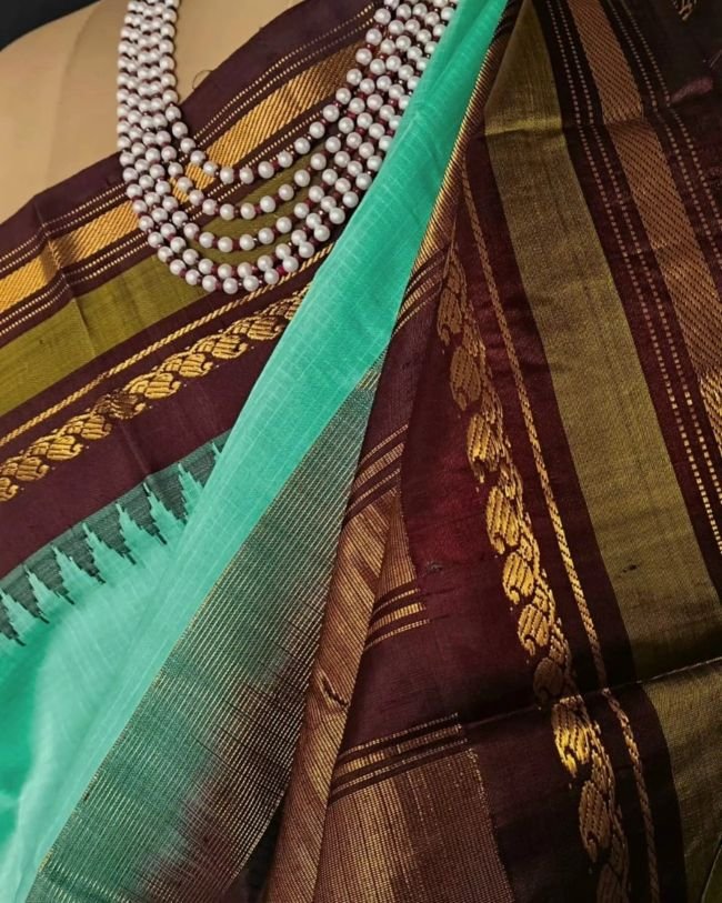 Gadwal Kuttu technique handweave saree with checked cotton body, silk border, and silk palla.