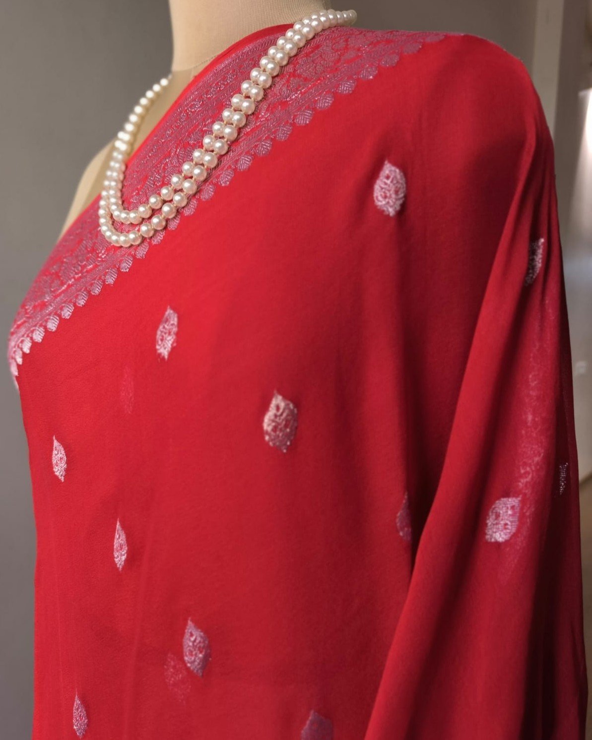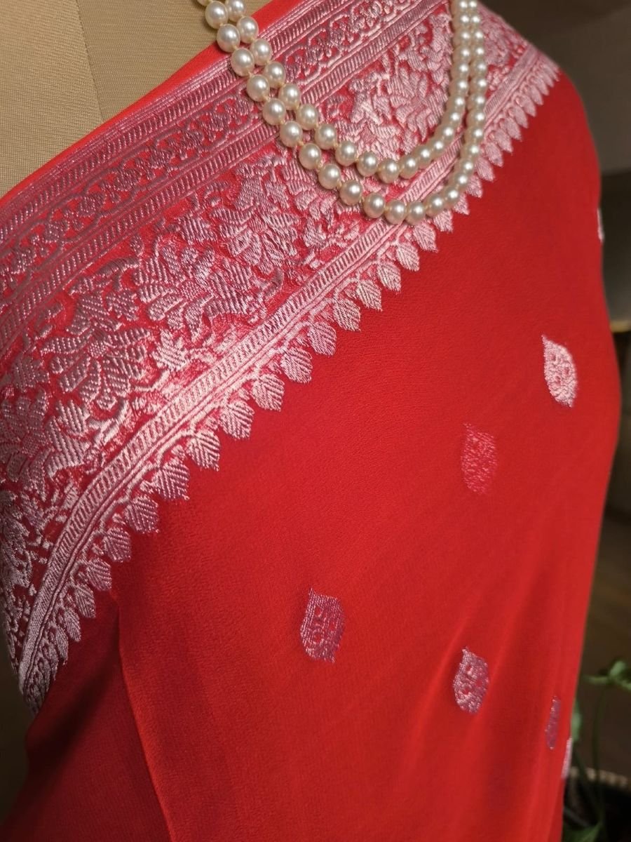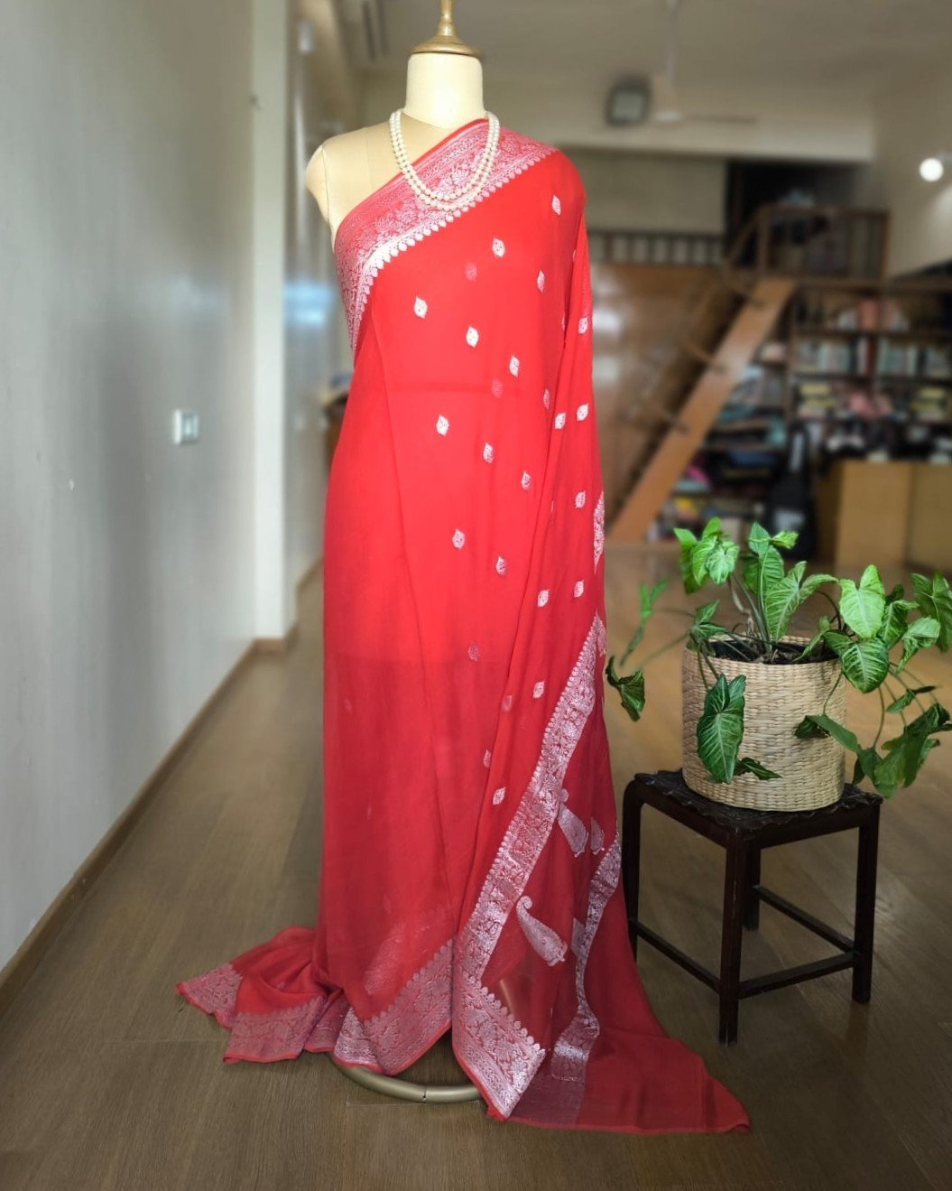 Beautiful Georgette Pure Silk Handweave from Banaras with sophisticated silver zari border and glamorous buttis.