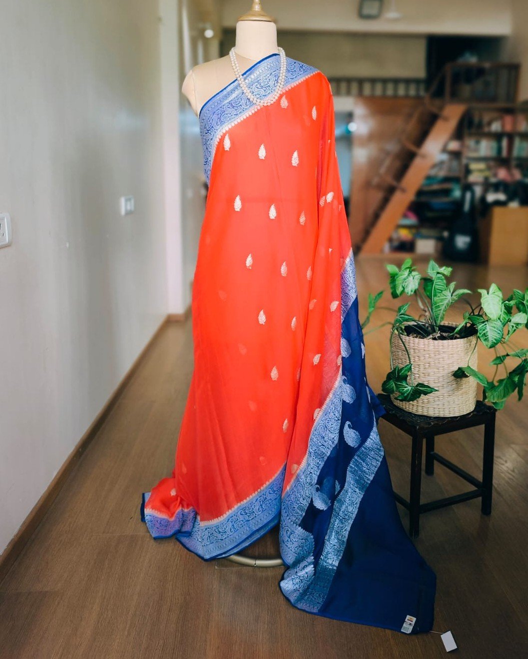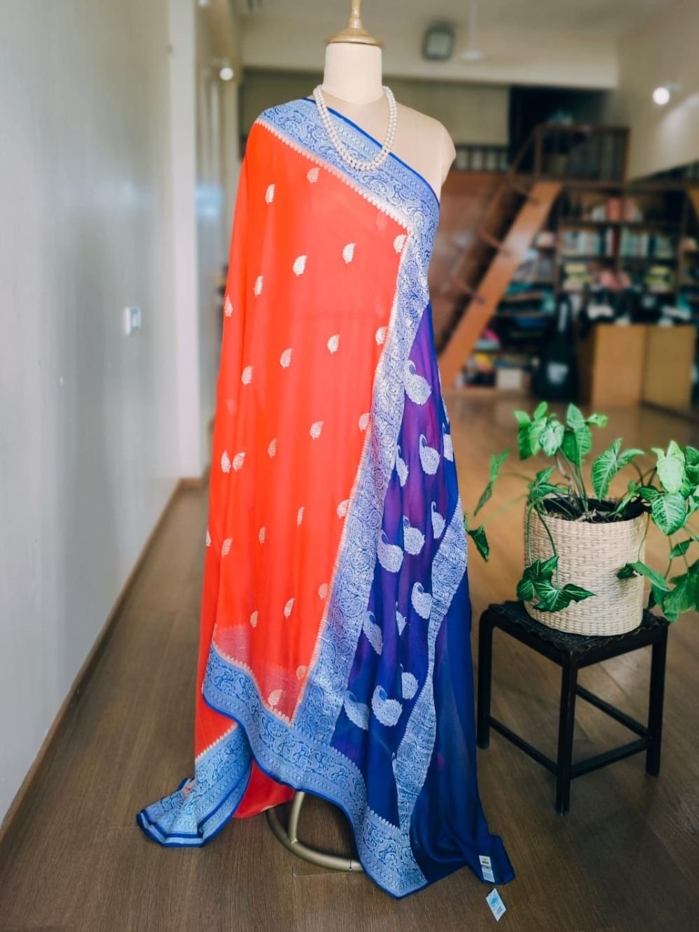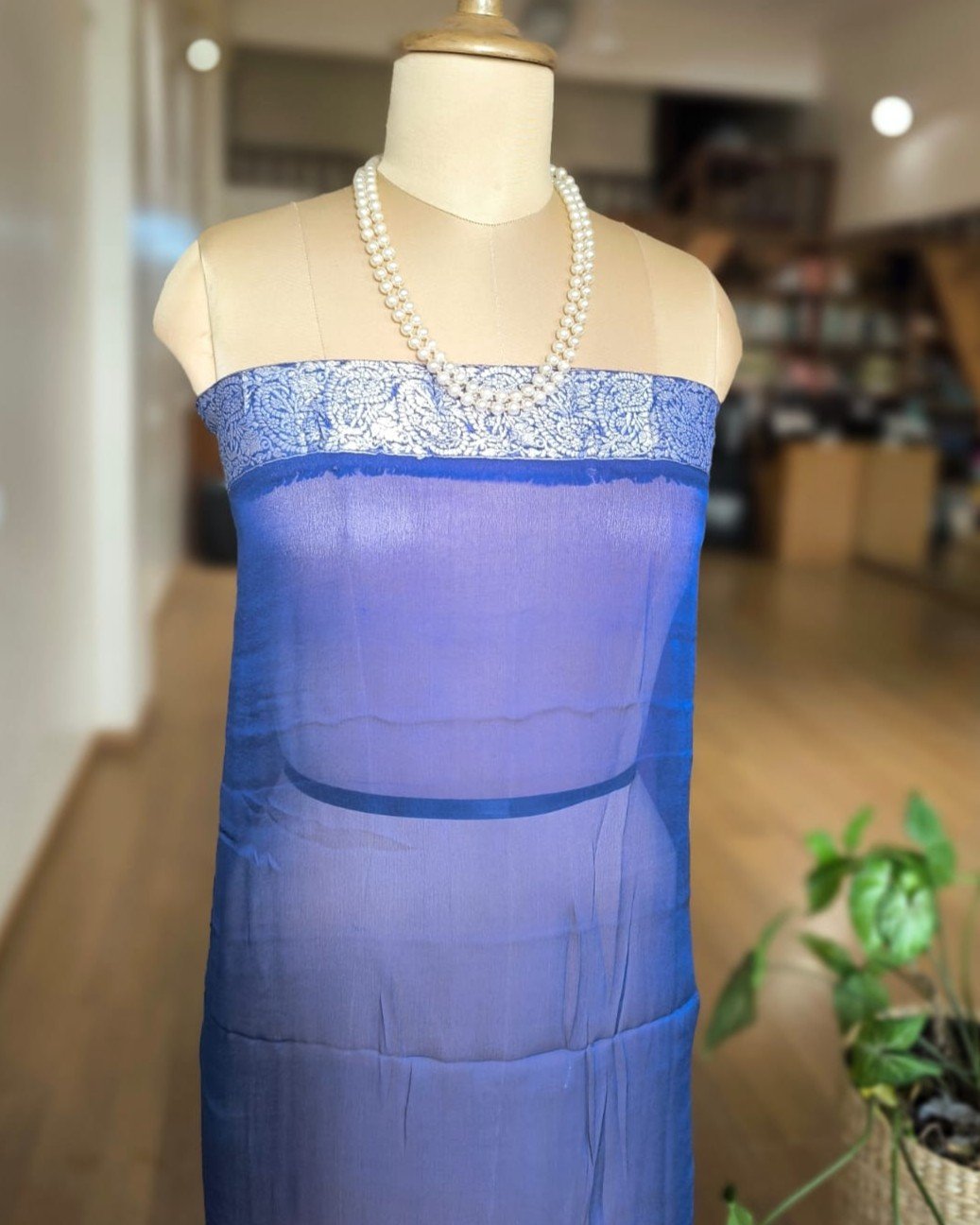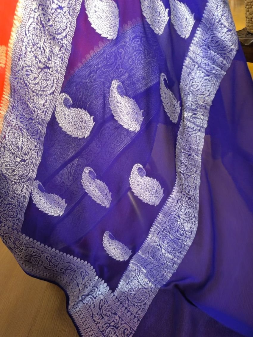 Beautiful Georgette Pure Silk Handweave from Banaras with sophisticated silver zari border and glamorous buttis.