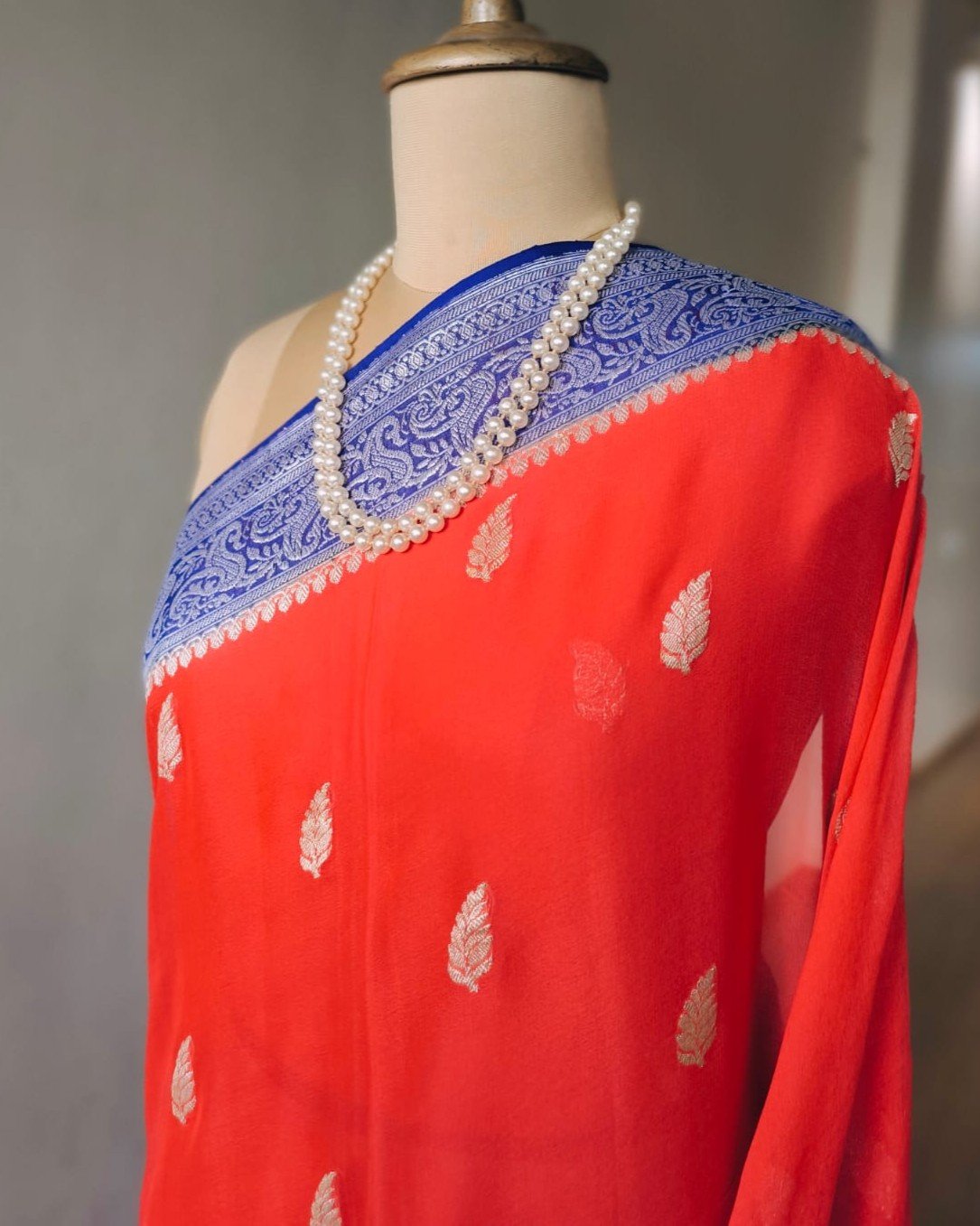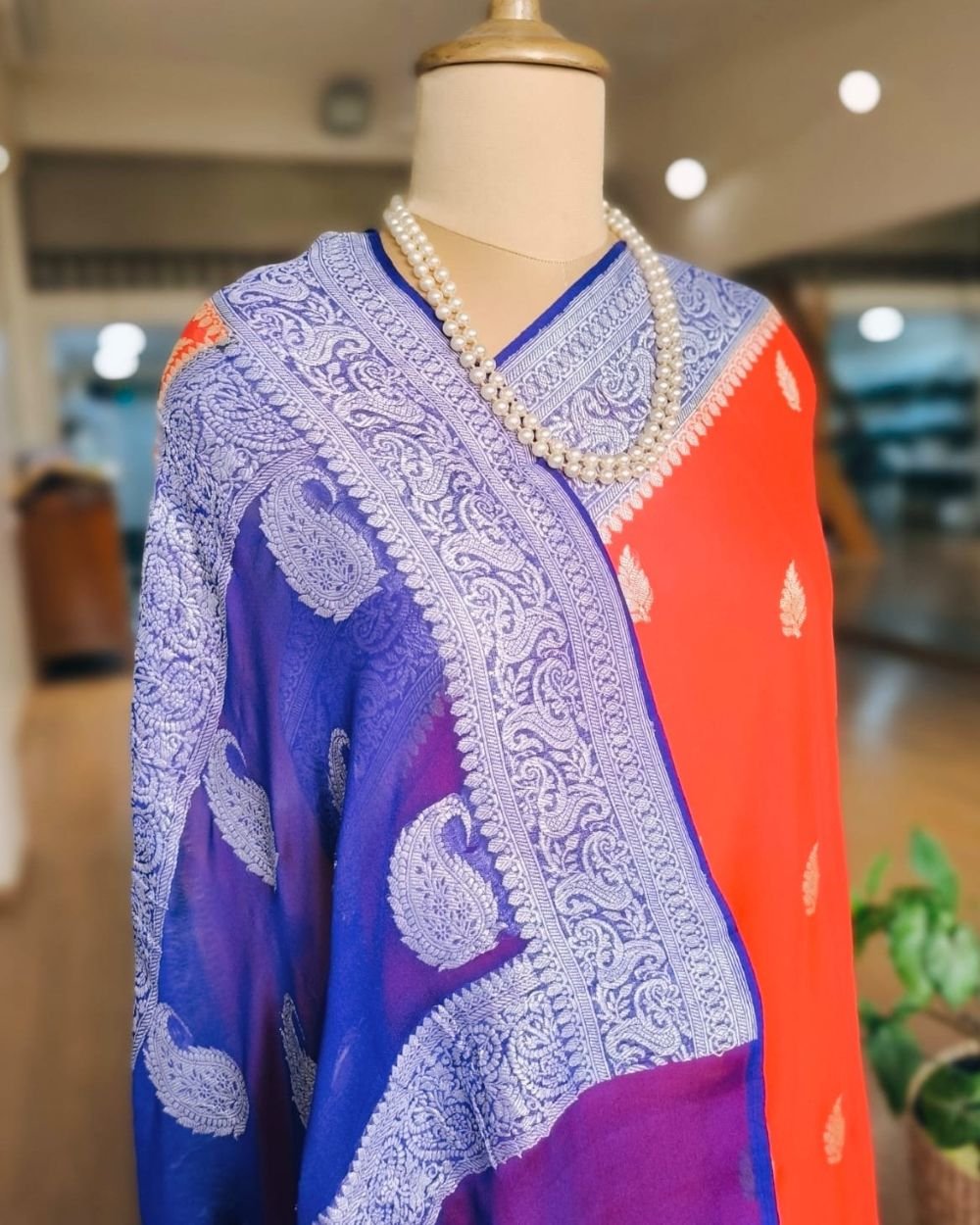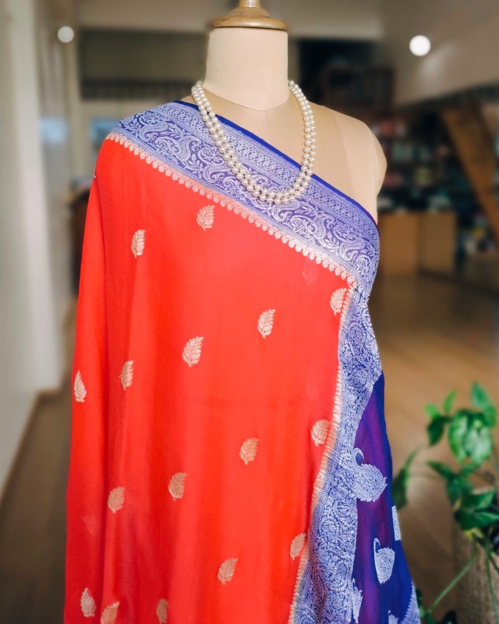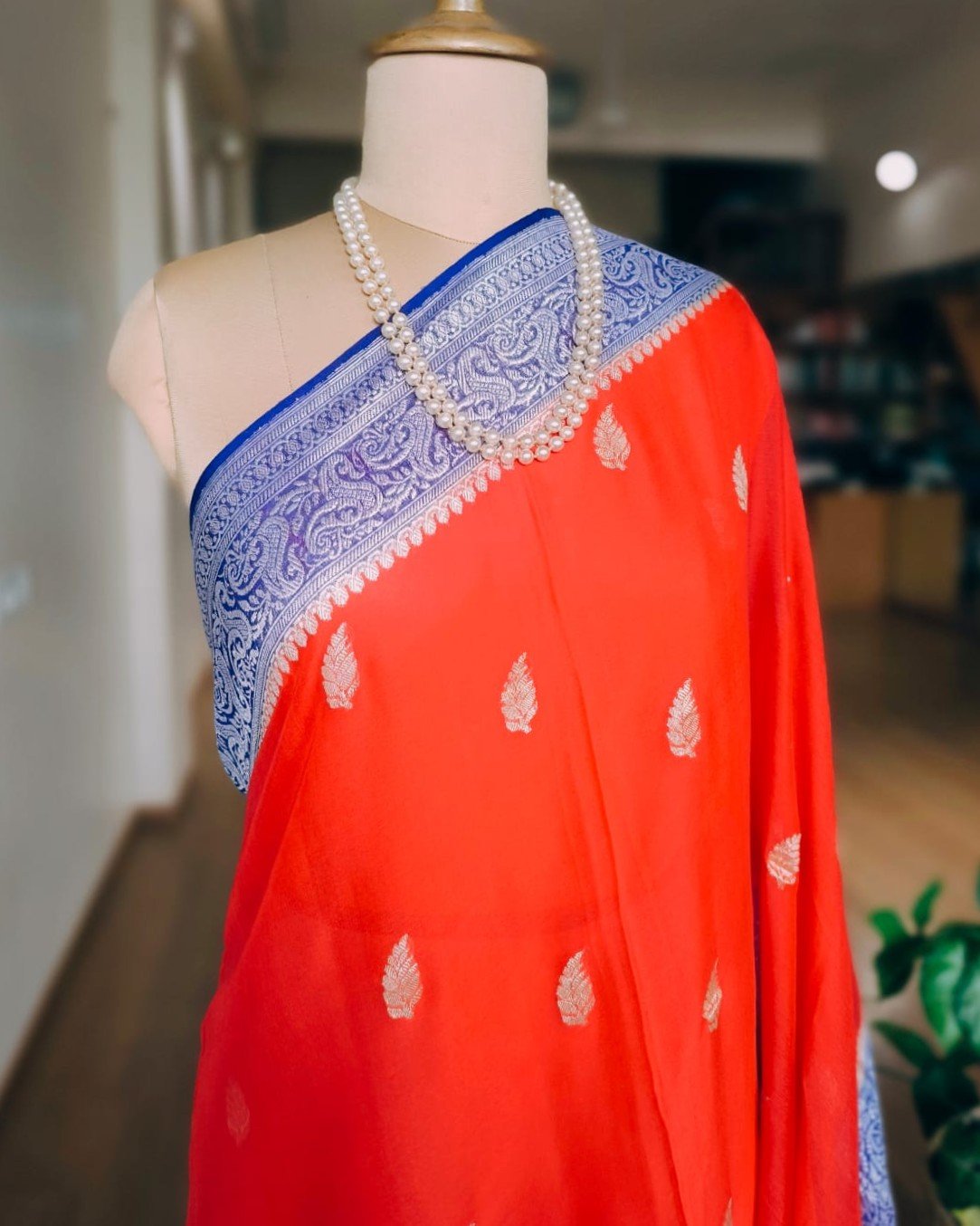 Beautiful Georgette Pure Silk Handweave from Banaras with sophisticated silver zari border and glamorous buttis.