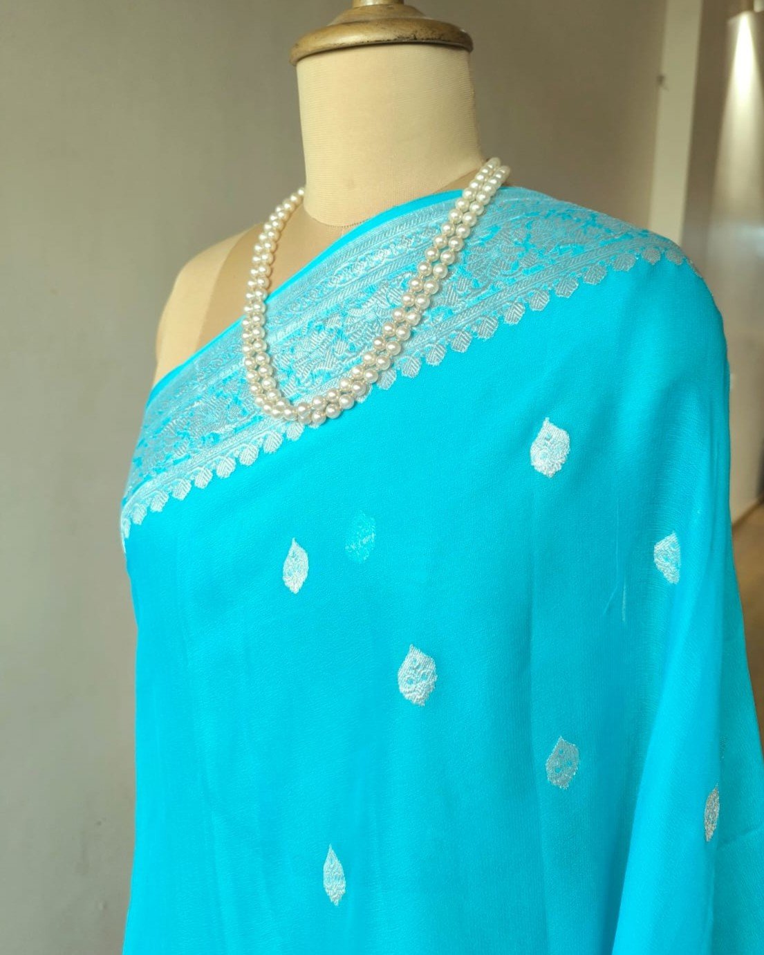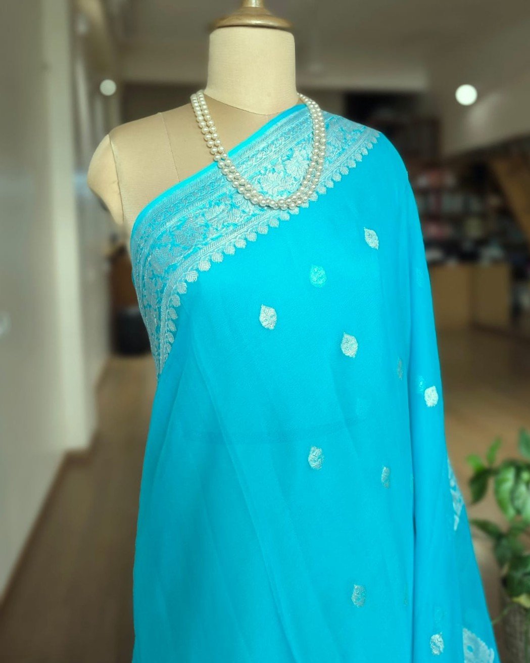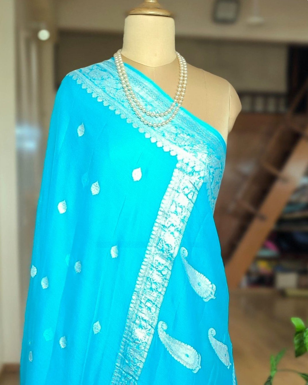 Beautiful Georgette Pure Silk Handweave from Banaras with sophisticated silver zari border and glamorous buttis.