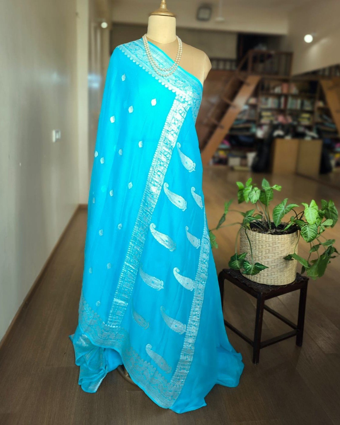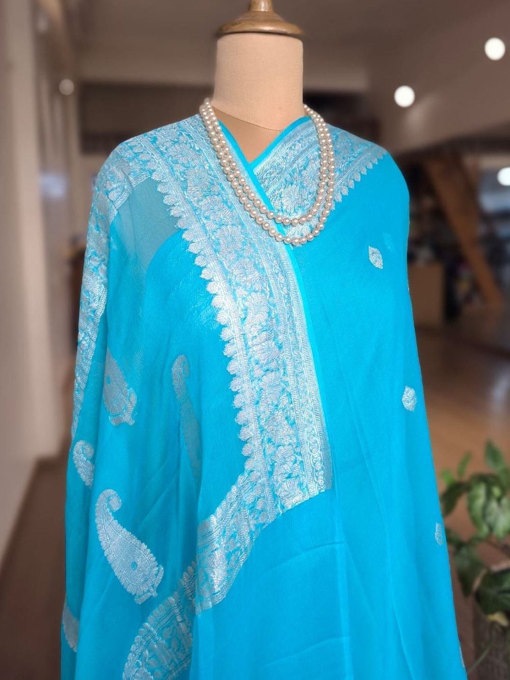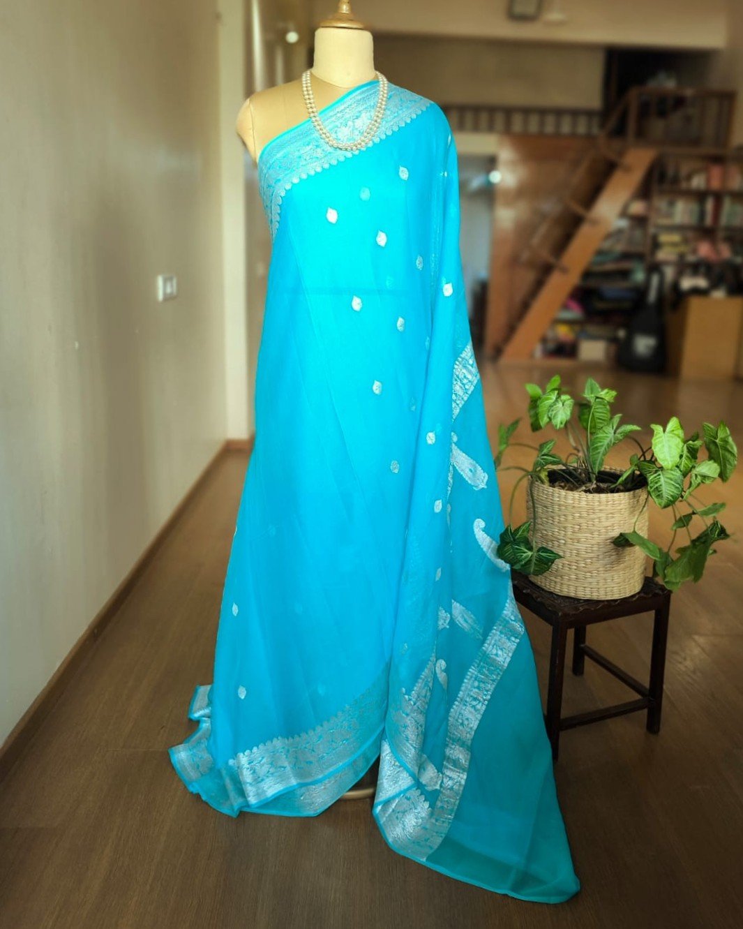 Beautiful Georgette Pure Silk Handweave from Banaras with sophisticated silver zari border and glamorous buttis.