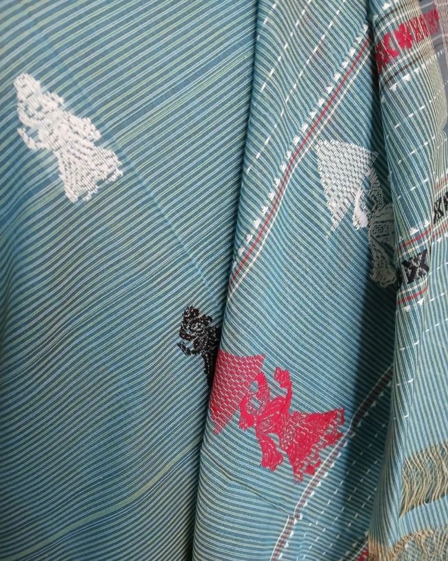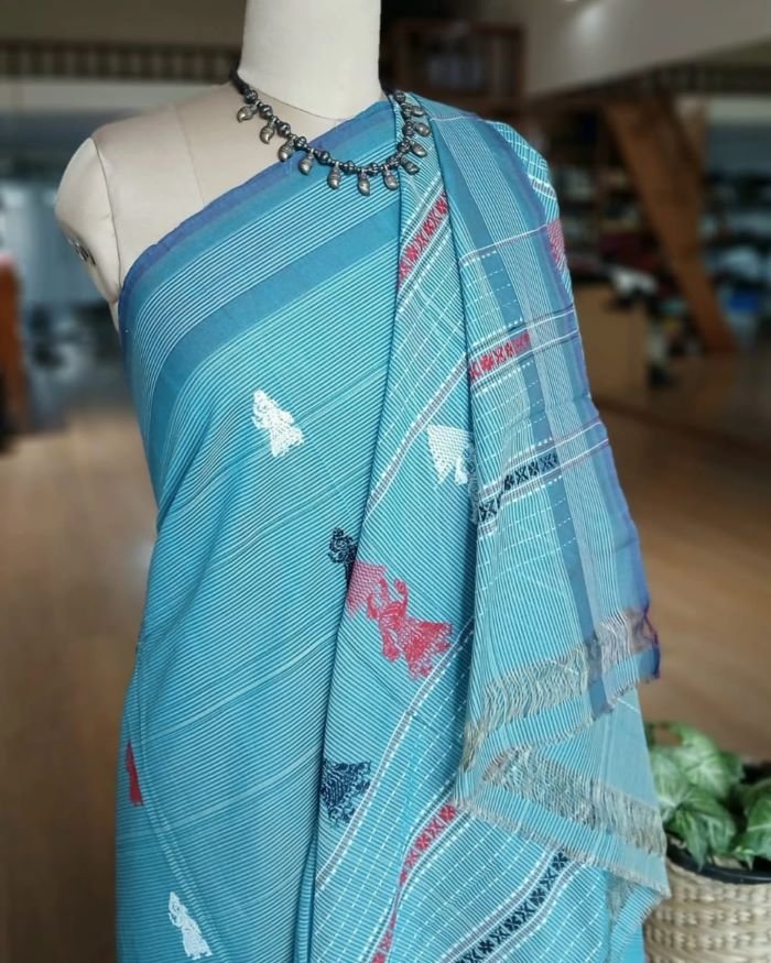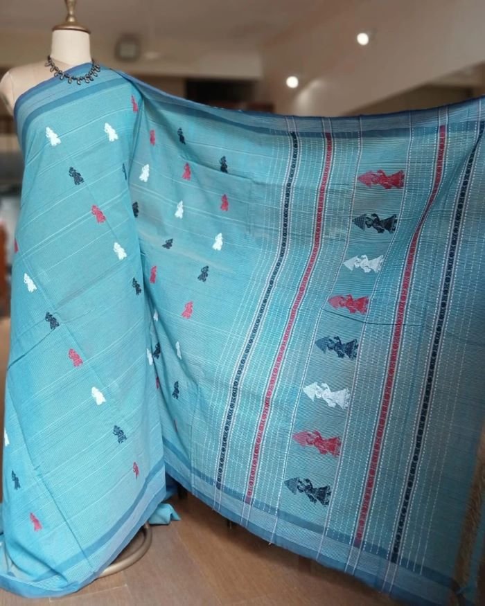 The saree is handwoven with motifs in extra weft.