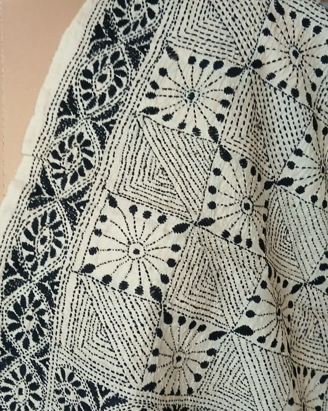 Tussar silk stole with kantha hand-embroidery, made in Santiniketan.