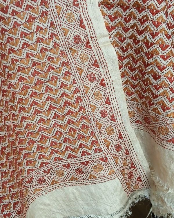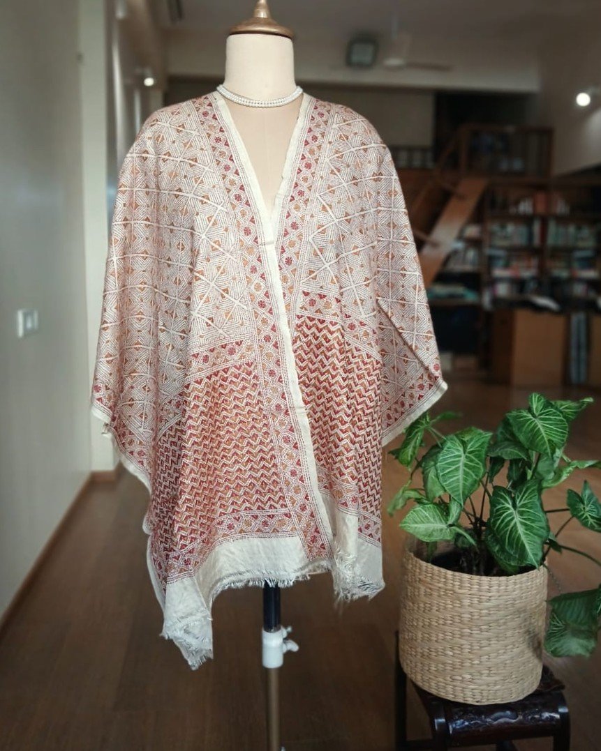 Tussar silk stole with kantha hand-embroidery, made in Santiniketan.