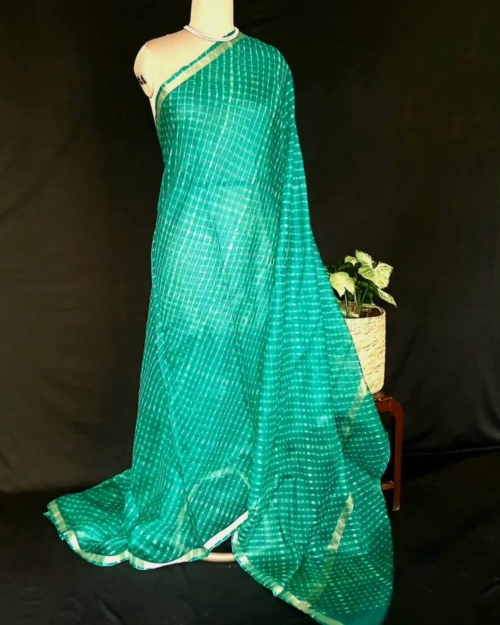 Hand tie-dye Leheriya on Kota Silk. Made in Jaipur in a lovely combination, showing the artisan’s skilled understanding of colour interplay.